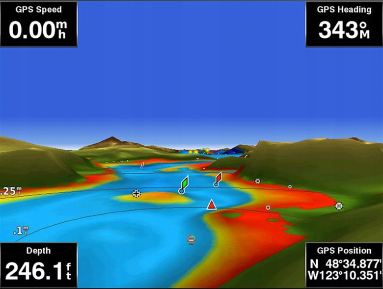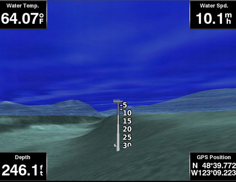 Этот подводный вид показывает 3D-рендеринг дна и очертания объектов, видимых под водой. Вид можно настроить с помощью интерфейса данных сонара.