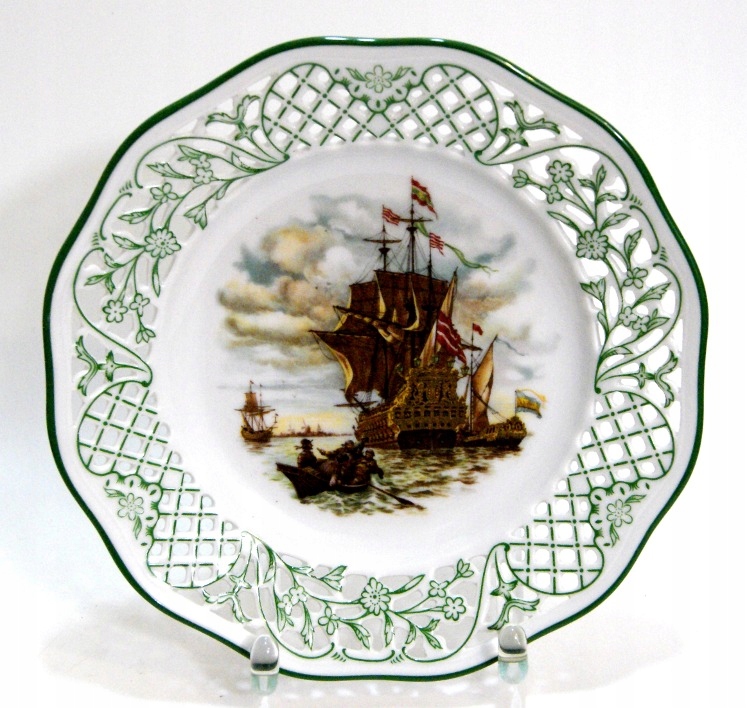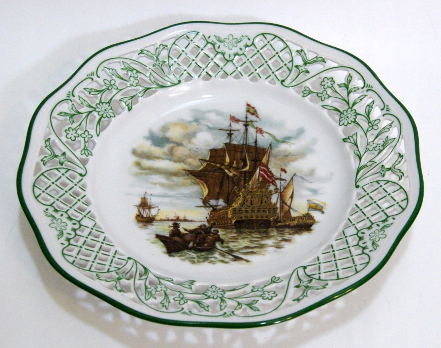 Предмет аукциона — красивая подставка для торта из белого фарфора, украшенная ажуром и морским узором.