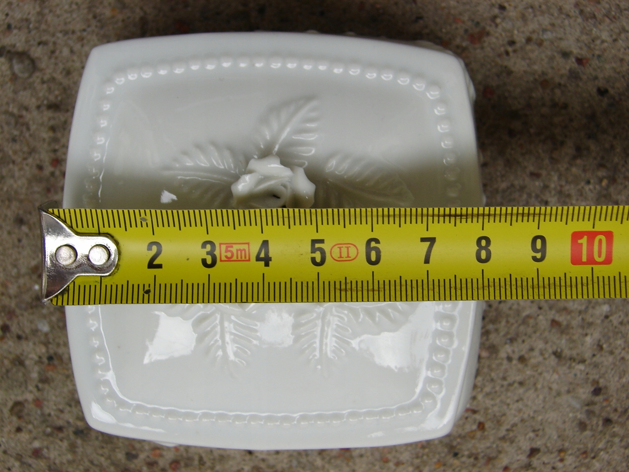 Крышка украшена фигурным цветочным мотивом, вся поверхность украшена выпуклым рельефом.