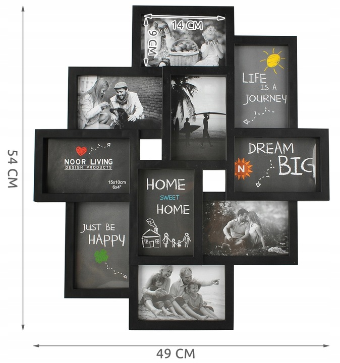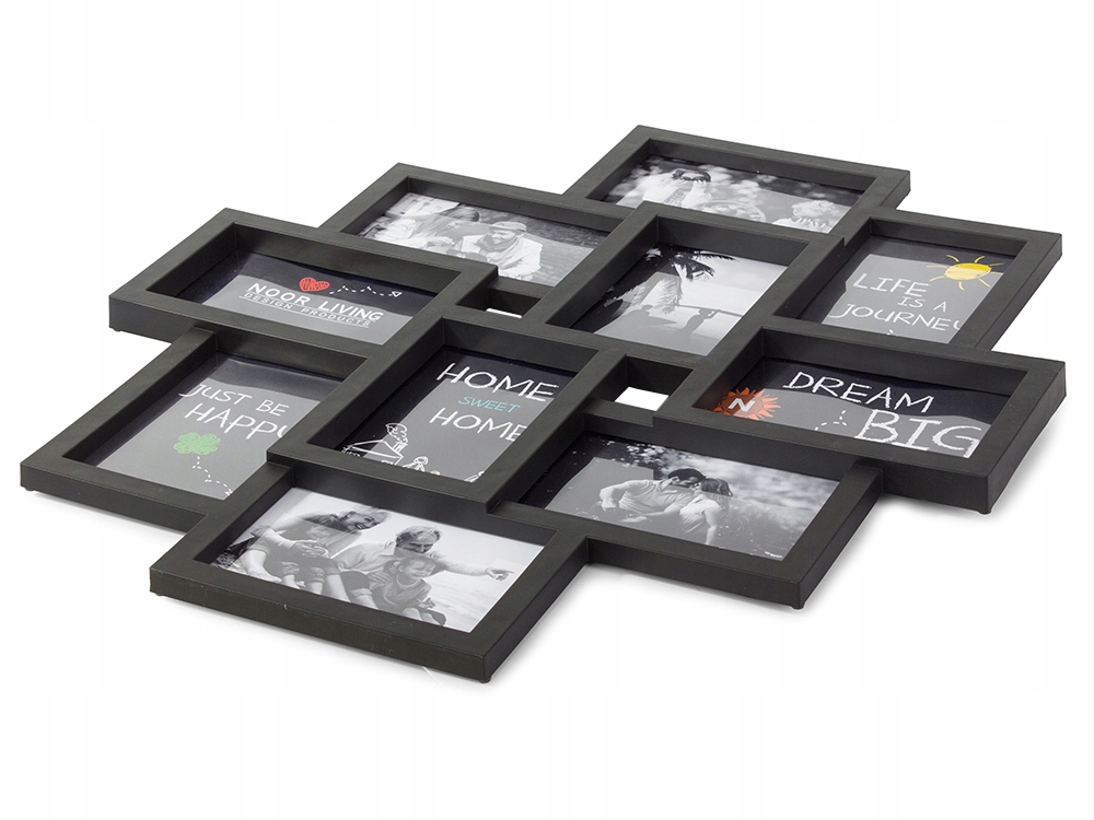Рамка состоит из 10 соединенных между собой прямоугольных рамок и вмещает фотографии максимальным размером 10x15 см (видимый размер 9x14 см). Это один из стандартных размеров фотографий, поэтому нет необходимости обрезать их, если они были разработаны таким образом. 6 кадров были расположены горизонтально и 4 вертикально, и все это составило интересную асимметричную пространственную композицию. Мультикадр практичен, поскольку, объединяя фотографии, мы экономим место в доме, чтобы разместить 10 традиционных рамок отдельно. Украшение предлагает простой и легкий способ повесить или разместить несколько фотографий в одном месте без особых усилий. Расположение фотографий дает интересный декоративный эффект, так как получается интересный коллаж. Каркас придаст помещениям неповторимый характер и придаст им неповторимый шарм. Это приятный акцент дизайна интерьера.