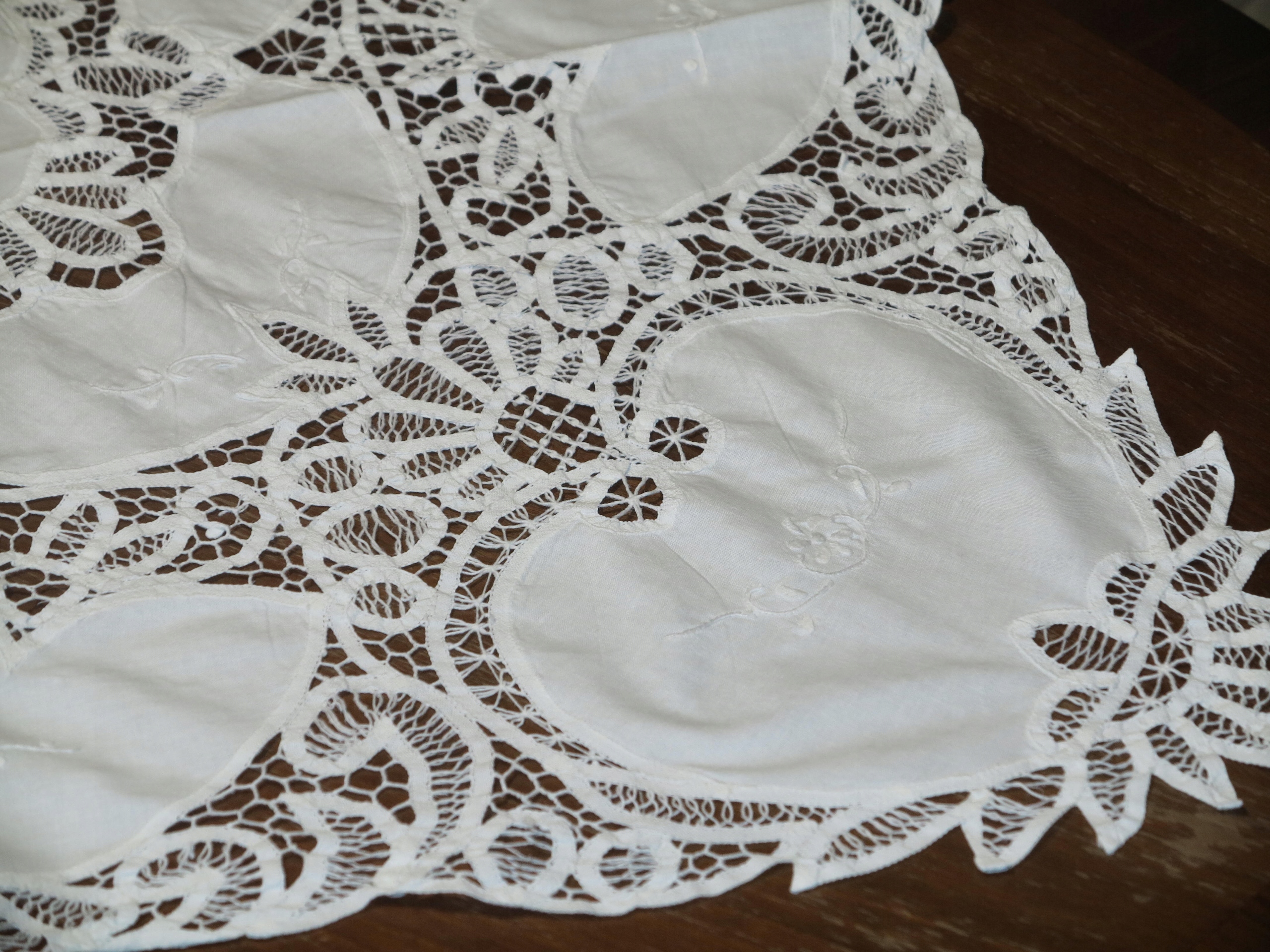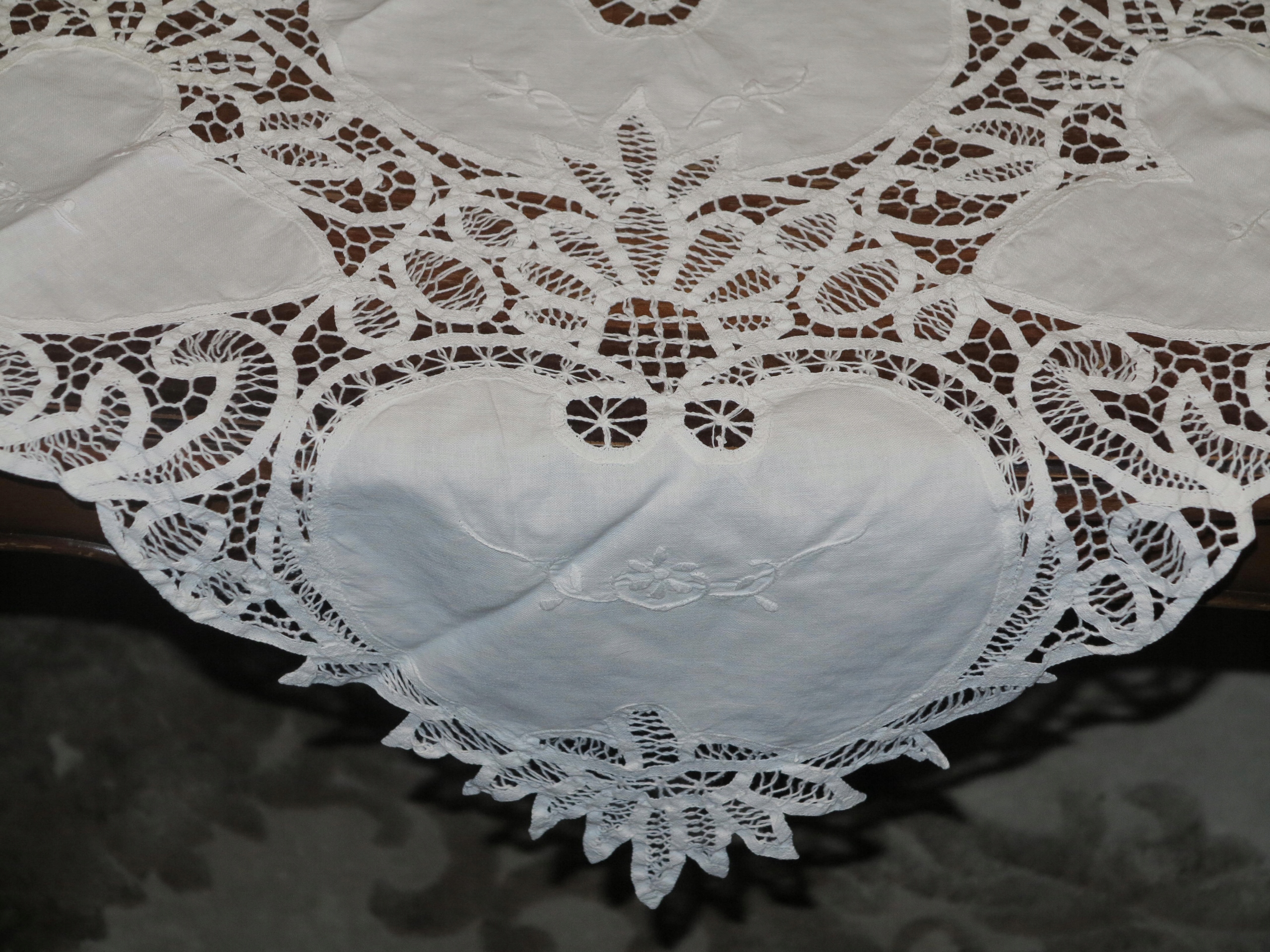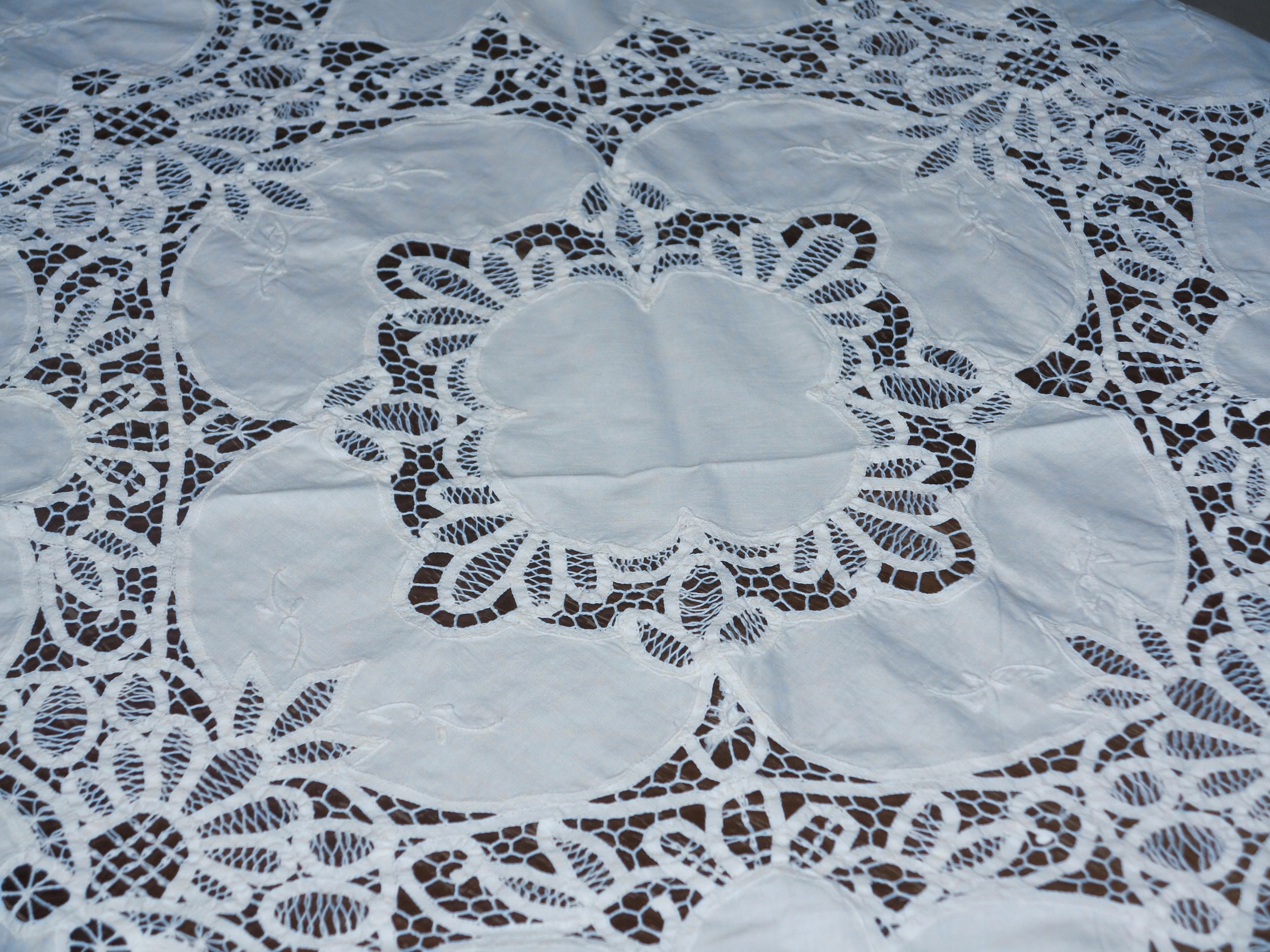 ЧУДЕСНУЮ СНЕЖНО-БЕЛУЮ ХЛОПКОВУЮ СКАТЕРТЬ С ОЧЕНЬ НАСЫЩЕННЫМ БРЮССЕЛЬСКИМ КРУЖЕВОМ И ВЫШИВКОЙ.