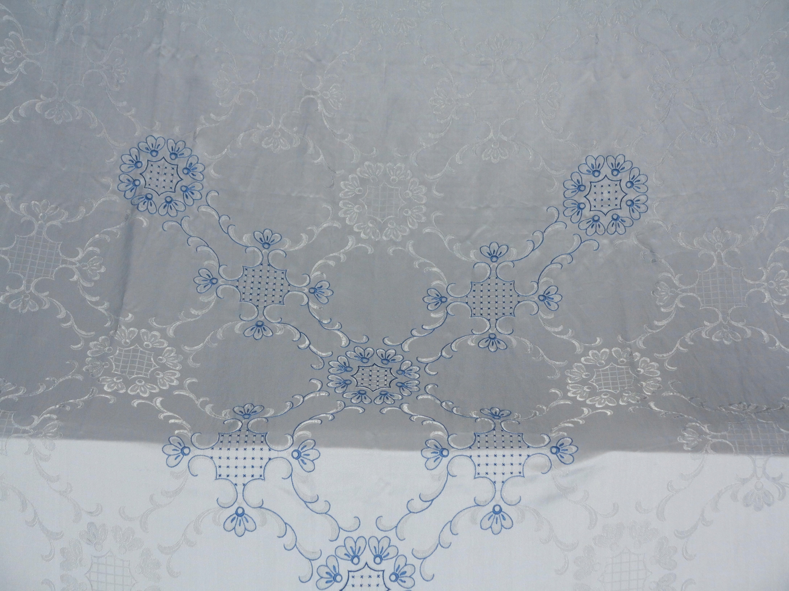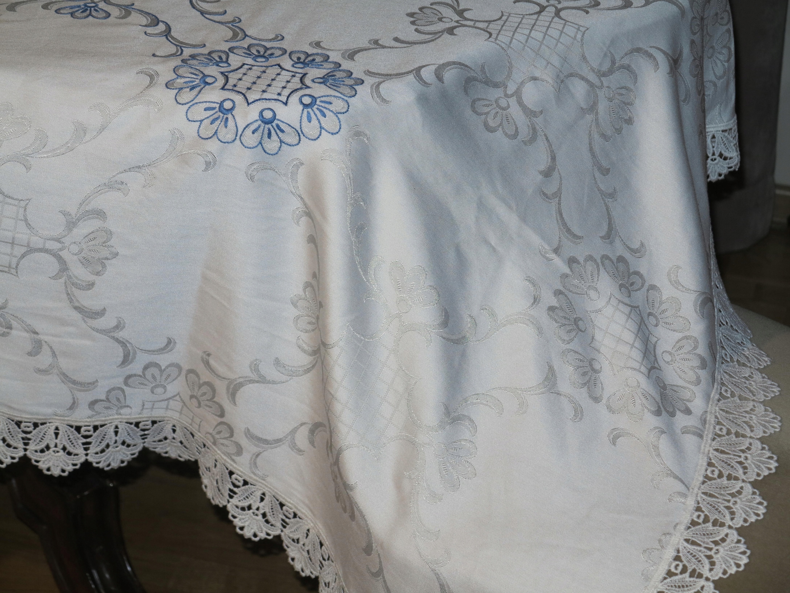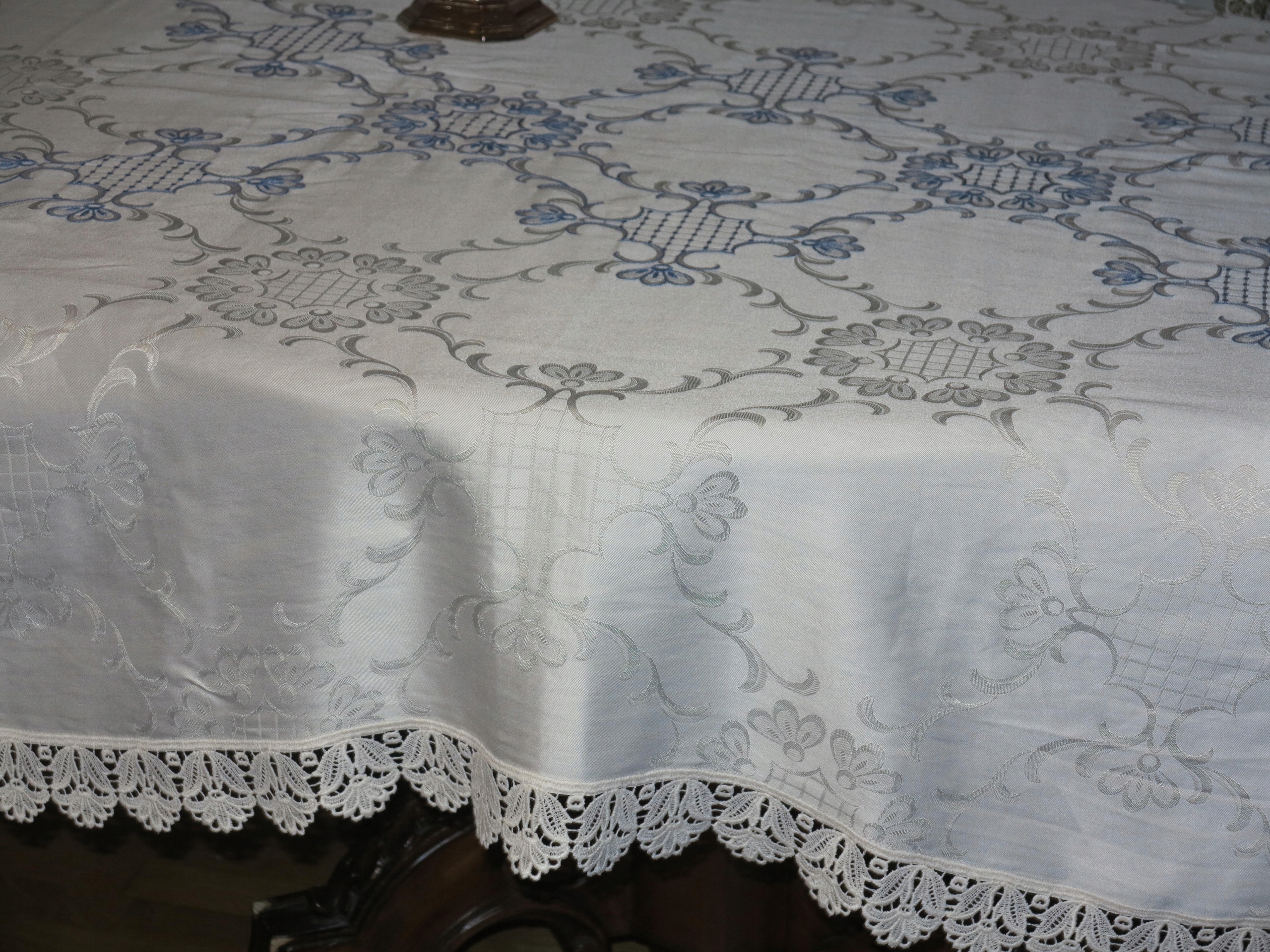 ОЧЕНЬ КРАСИВУЮ, БЕЛУЮ СКАТЕРТЬ ИЗ ХЛОПКА ДАДАСК С ДОБАВЛЕНИЕМ ШЕЛКОВОЙ НИТИ, СО СТИЛЬНЫМ УЗОРОМ, ВЫТЕМНЕННЫМ НА СКАТЕРТИ, И ВЫШИВАННЫМИ ВРУЧНУЮ СИНИМ СТИЛЬНЫМ УЗОРОМ. УКРАШЕНА ГИПЮРНЫМ КРУЖЕВОМ ВОКРУГ.