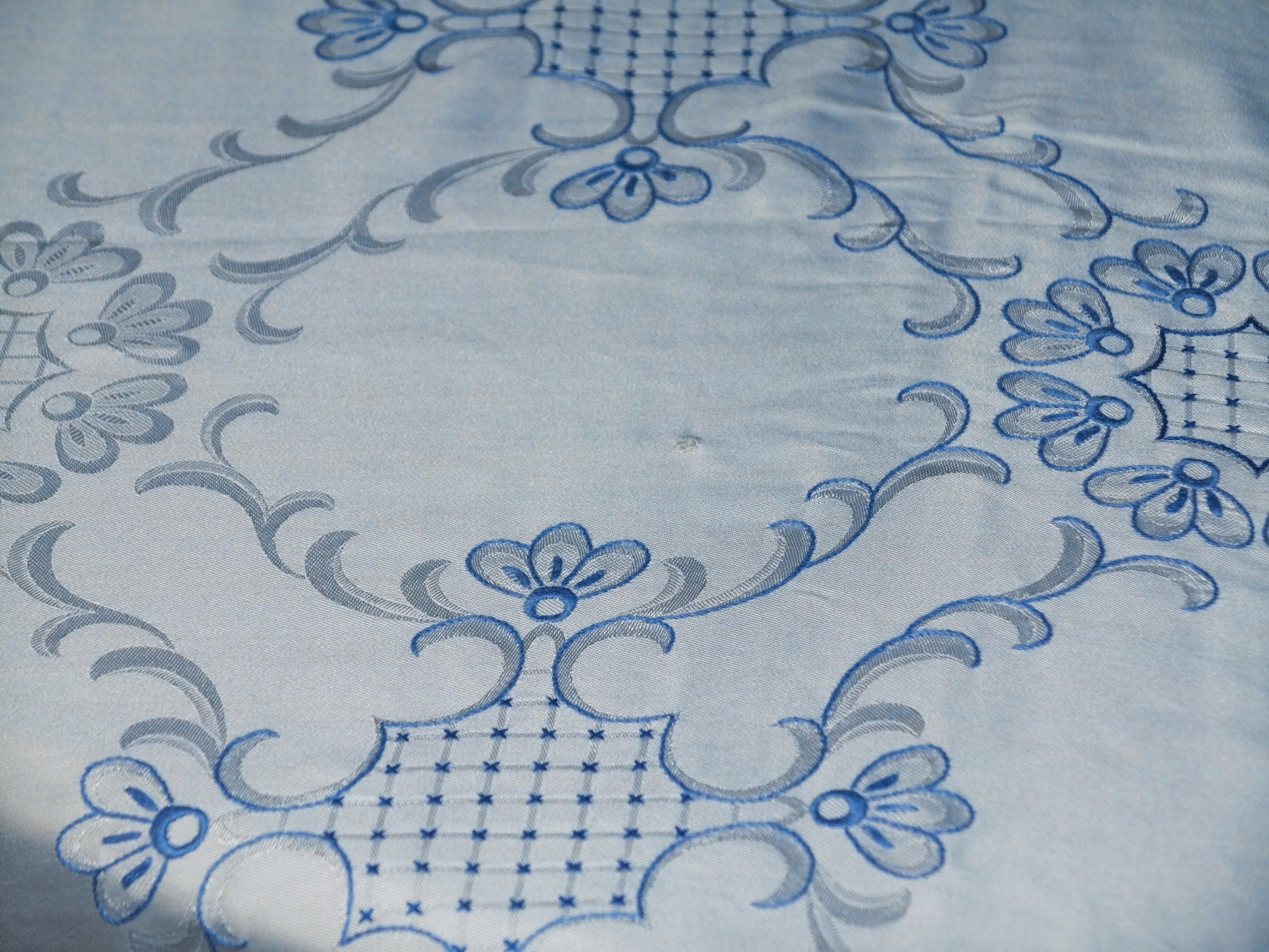 Предмет аукциона – красивая дамасская скатерть со стильным узором и синей вышивкой ручной работы. Размеры скатерти: длина 218см, ширина 152см. Скатерть б/у, в очень хорошем состоянии с небольшим минусом, описанным выше. Рекомендую, будет прекрасным украшением стола.