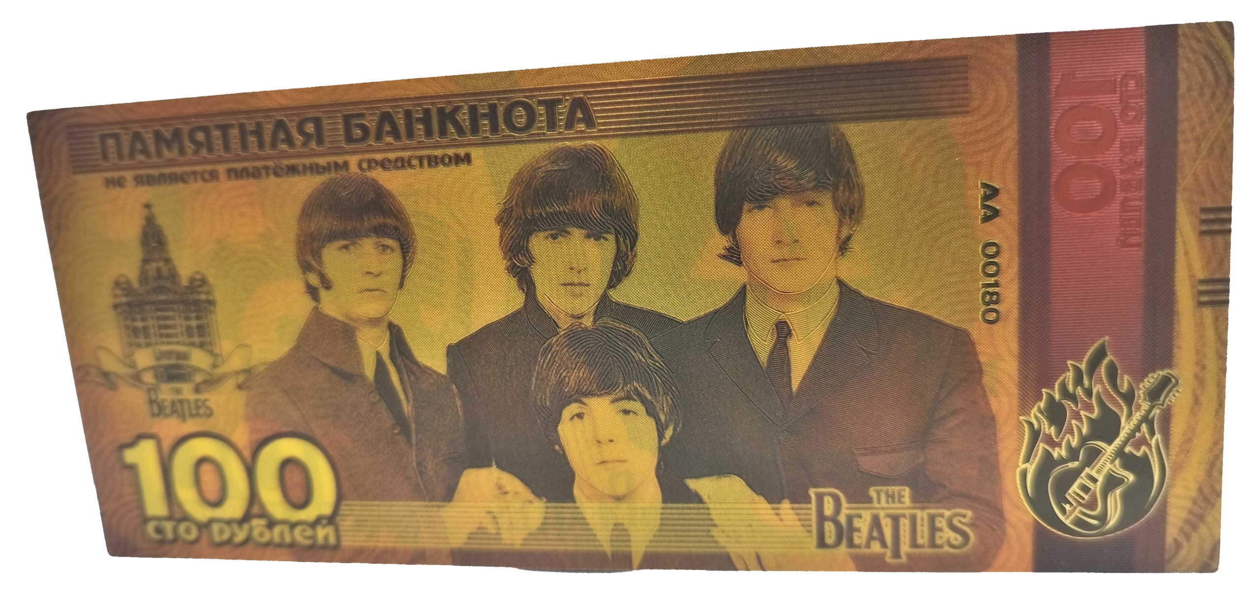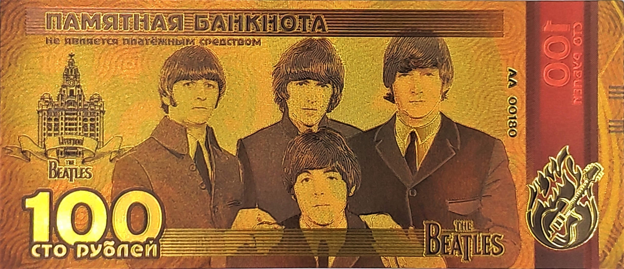 Красивая позолоченная банкнота с изображением Джона Леннона и группы The Beatles.
