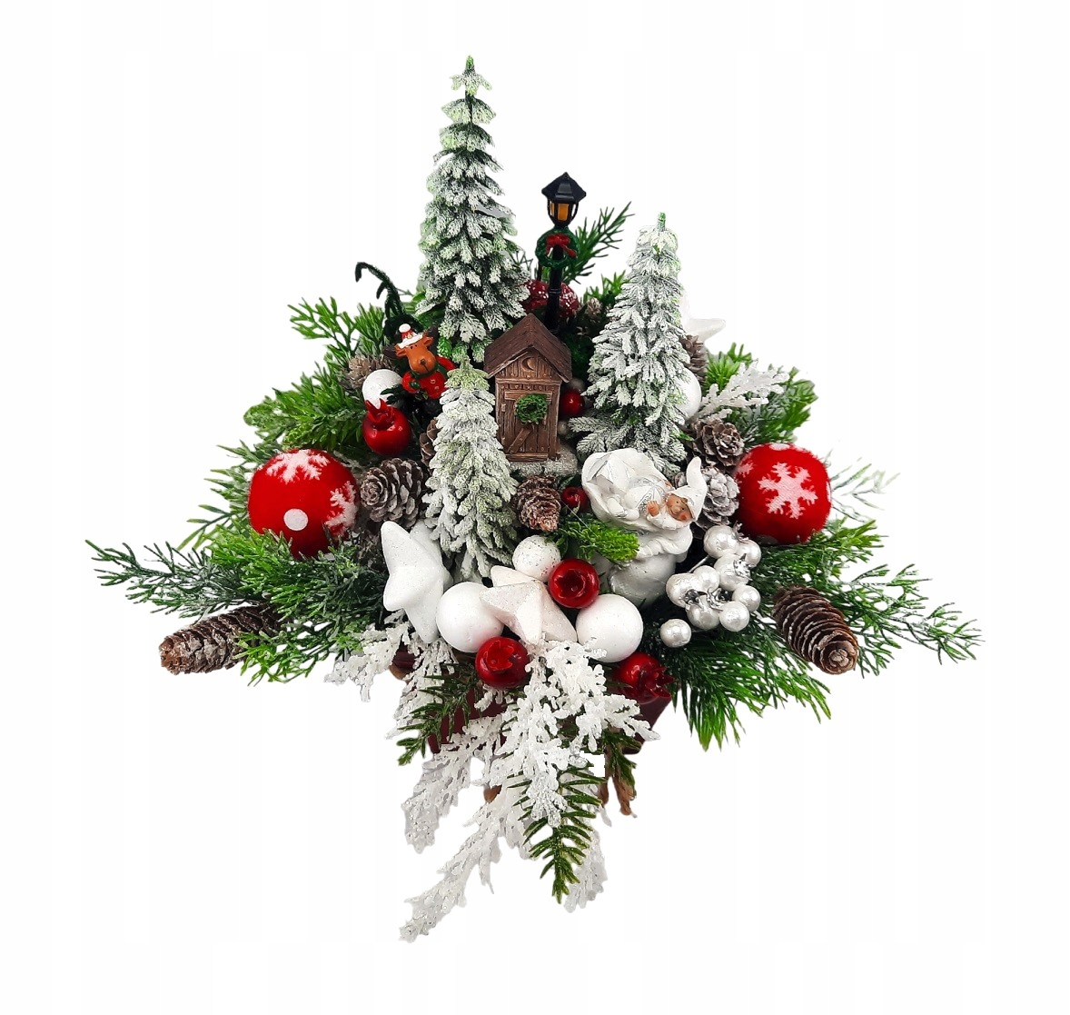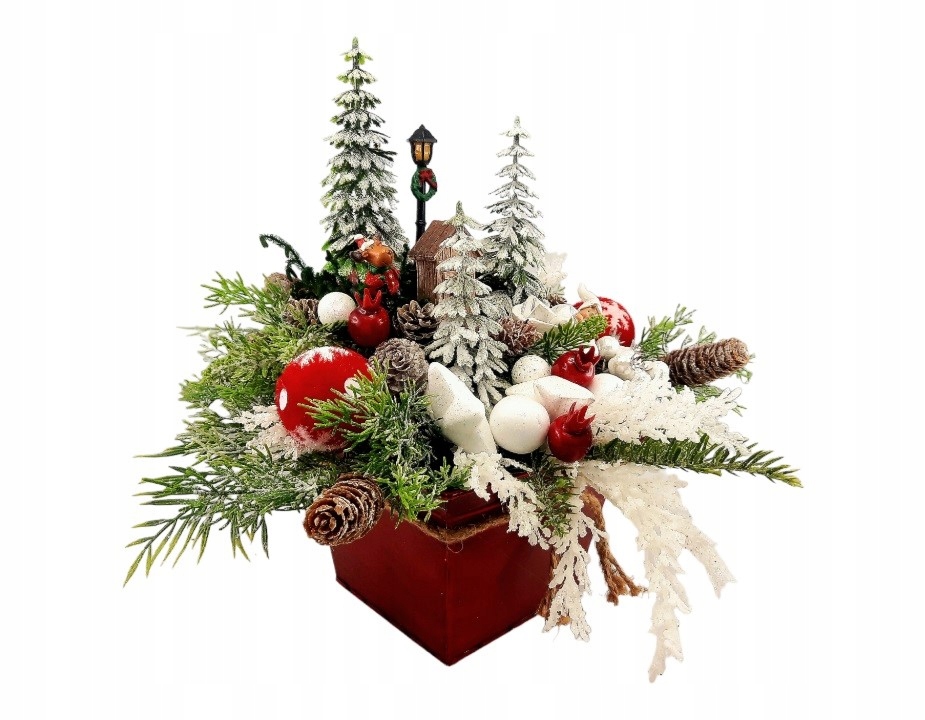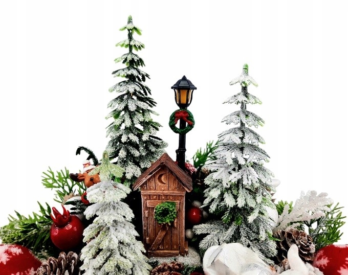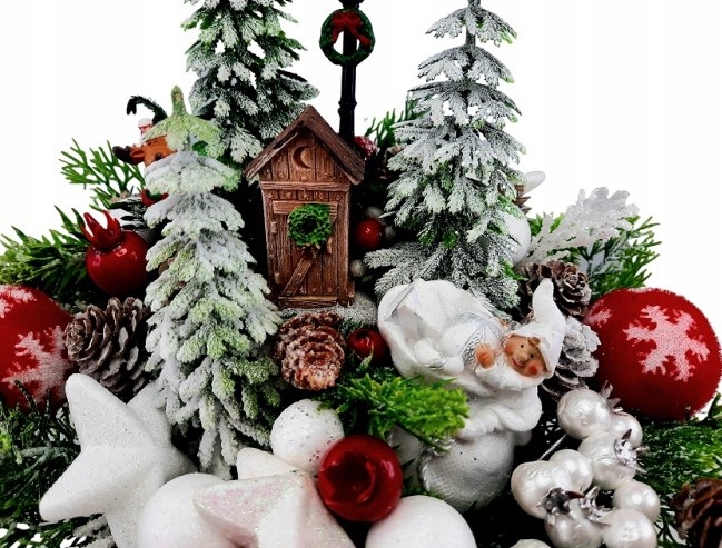 Он украшен красными и белыми игрушками, маленькими елочками, милым олененком, зелеными ветвями со слегка припорошенными снегом шишками, блестящими белыми веточками и эльф с мешком подарков.