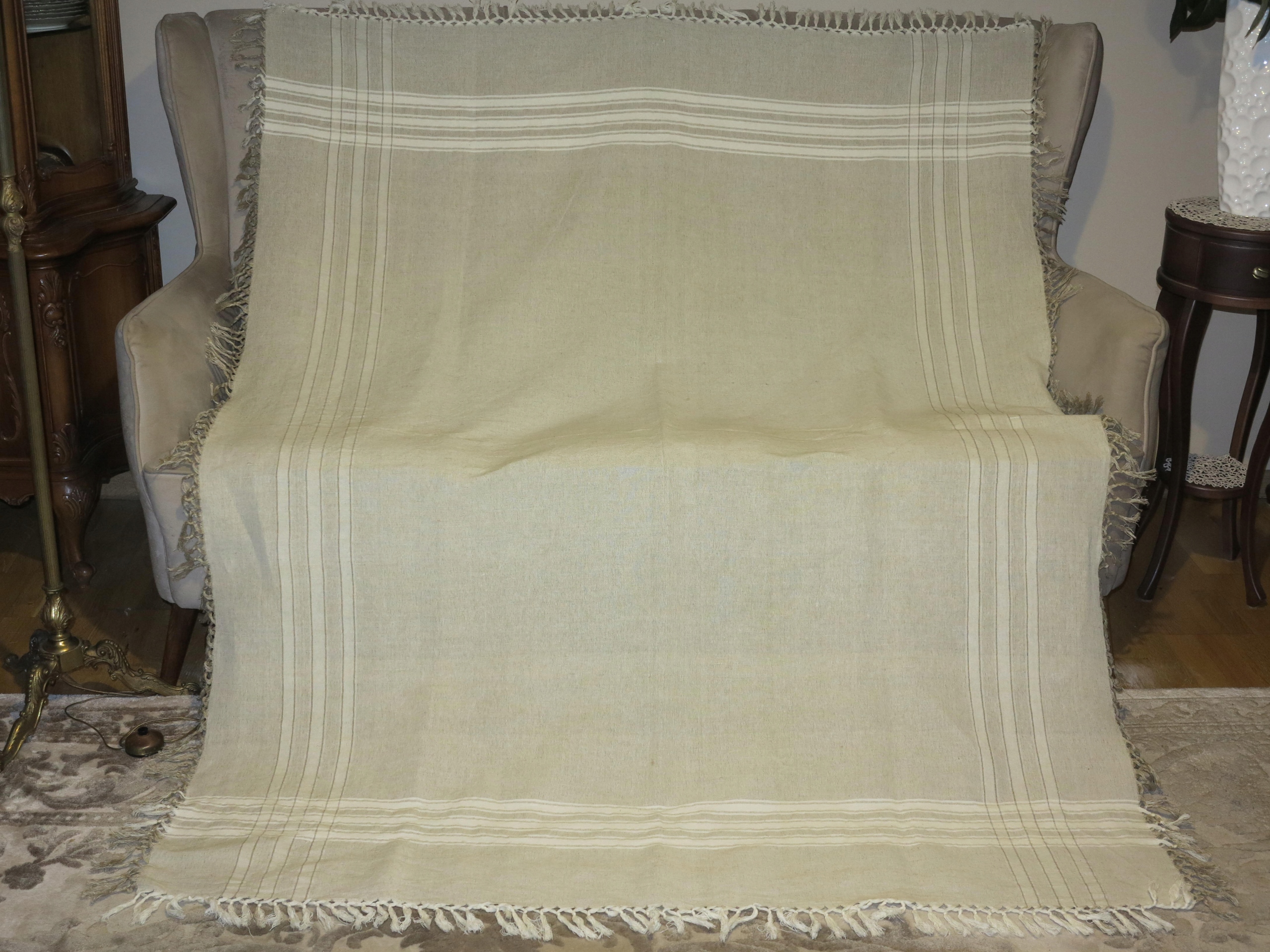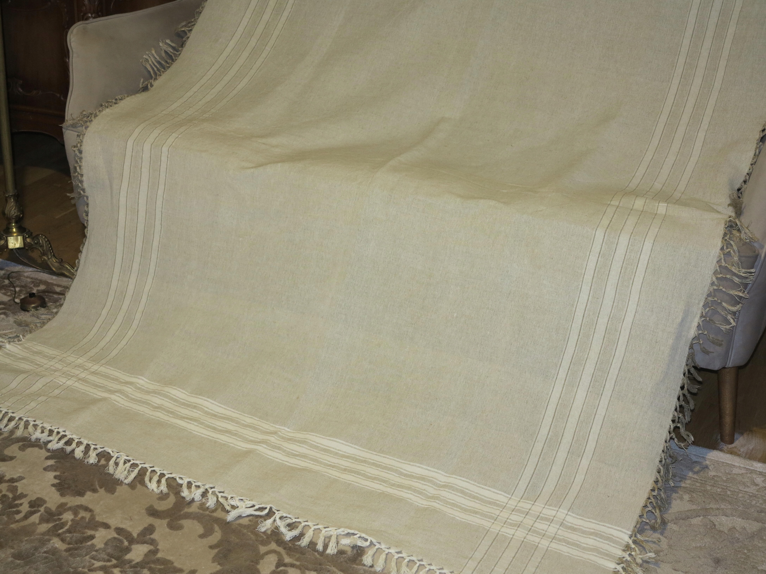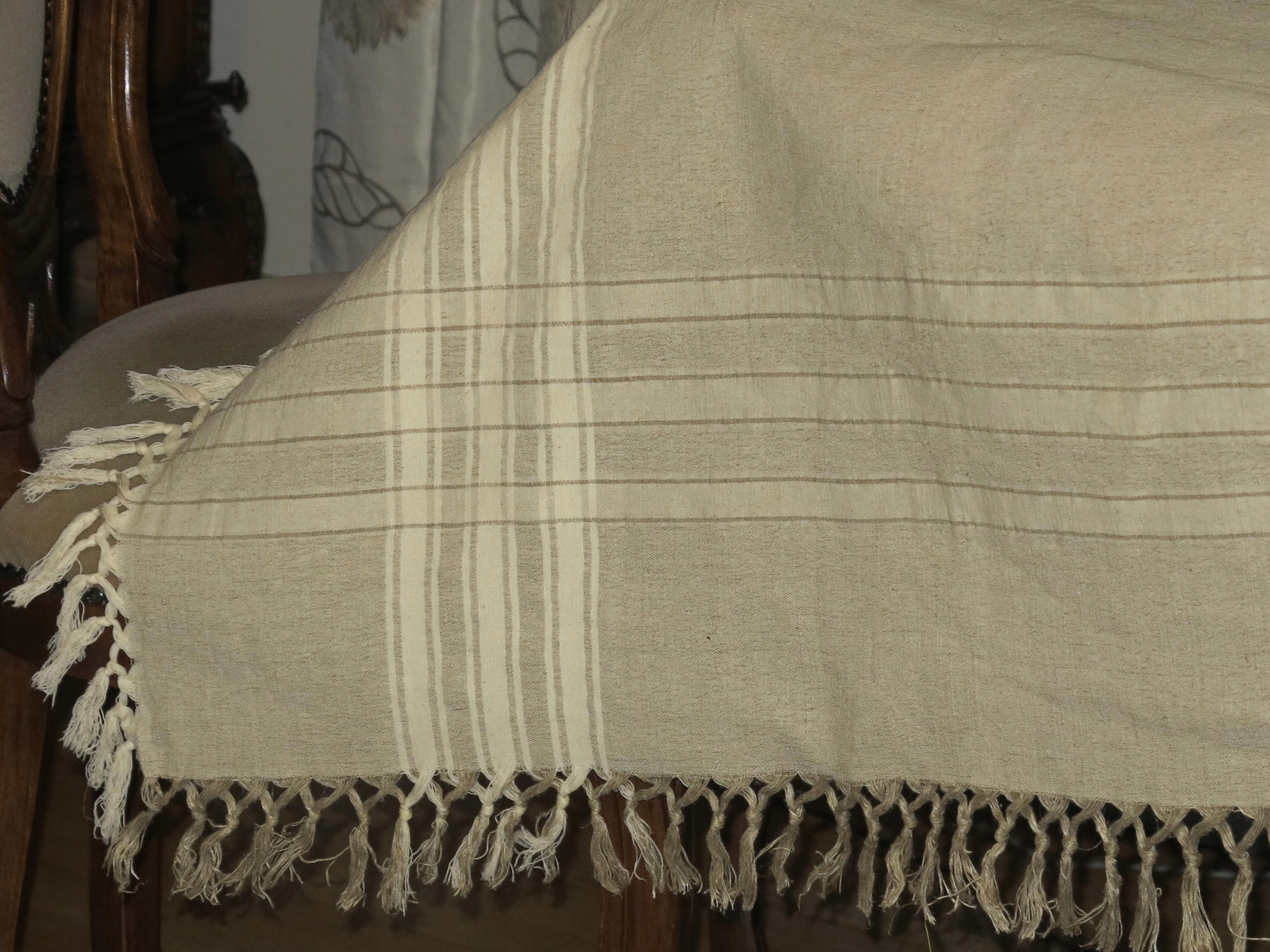 Красивая возрастная скатерть хлопка в бежевых с кремовыми полосками. Примерно привязанными к краям