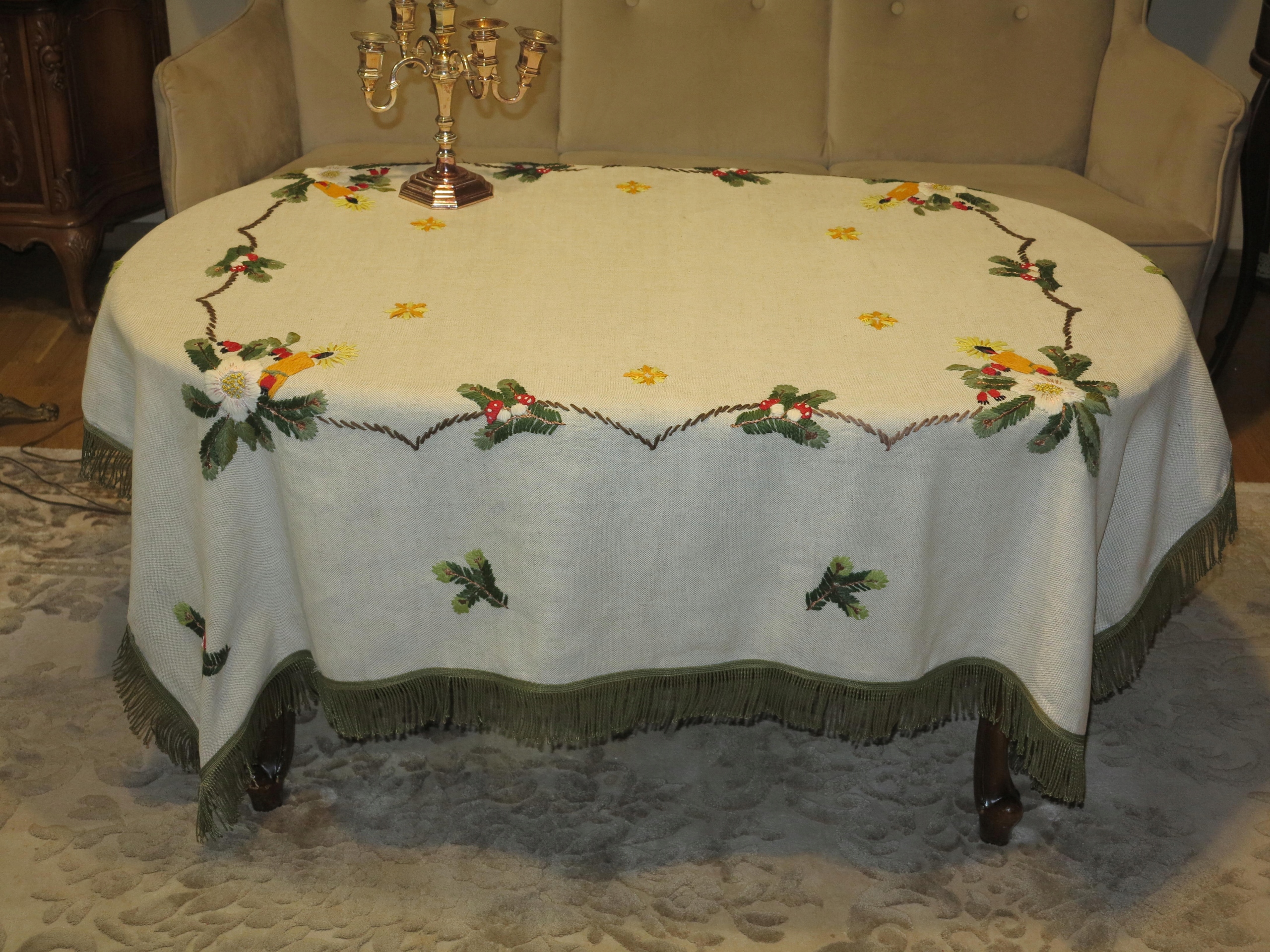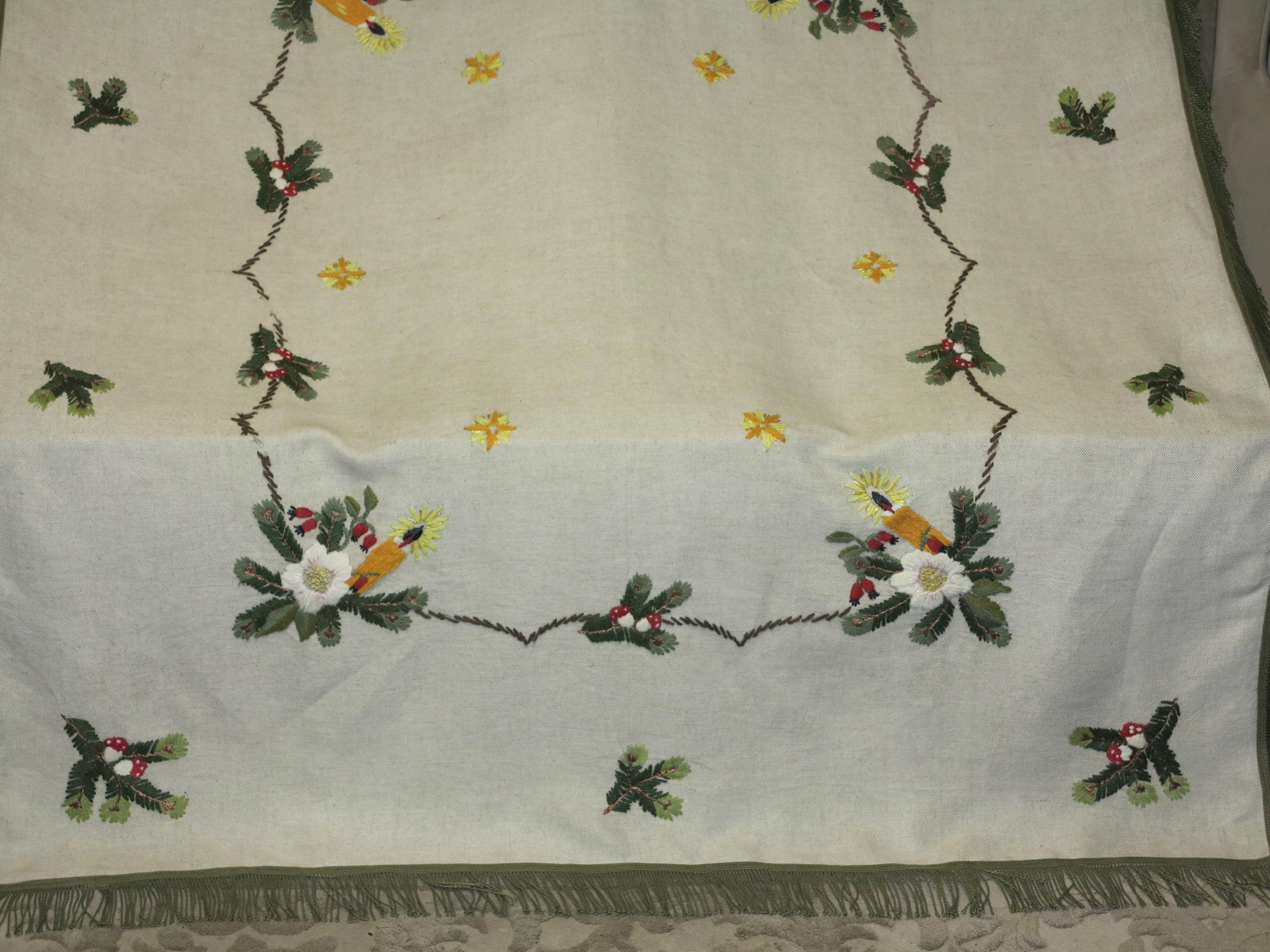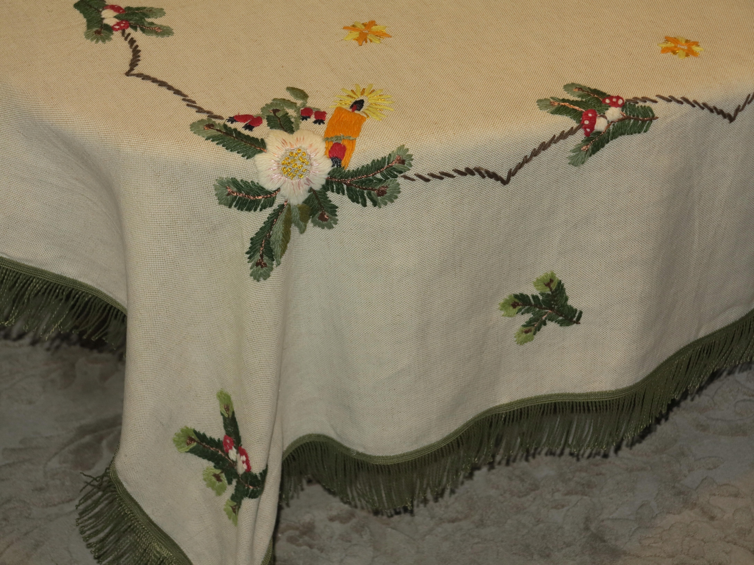 КРАСИВУЮ Рождественскую Льняную Скатерть С РУКОВОЙ ВЫШИВКОЙ ШЕРСТЯНЫМИ НИТЬЯМИ. ПЛОТНОЕ, ТОЛСТОЕ, СЛЕГКА струящееся белье. ВОКРУГ ЗЕЛЕНОЙ БАХОРКИ