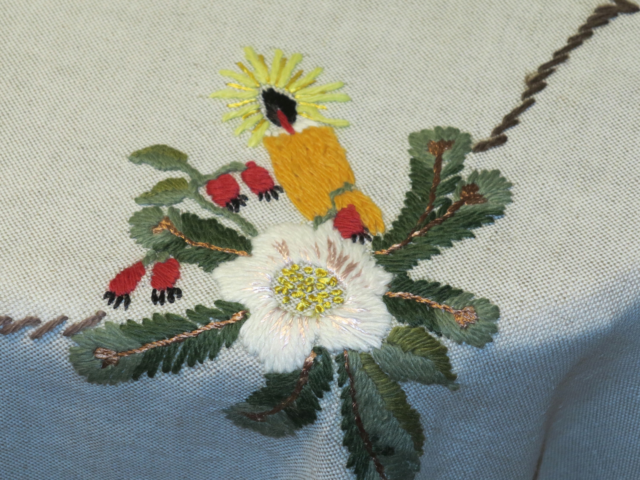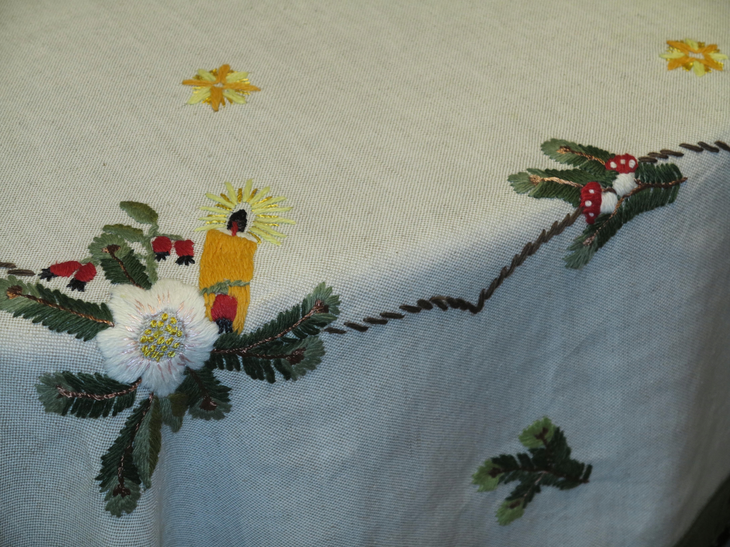 КРАСИВАЯ РОЖДЕСТВЕНСКАЯ ЛЬНЯНАЯ СКАТЕРТЬ С РУЧНОЙ ВЫШИВКОЙ ШЕРСТЯНЫМИ НИТКАМИ 152/135+7