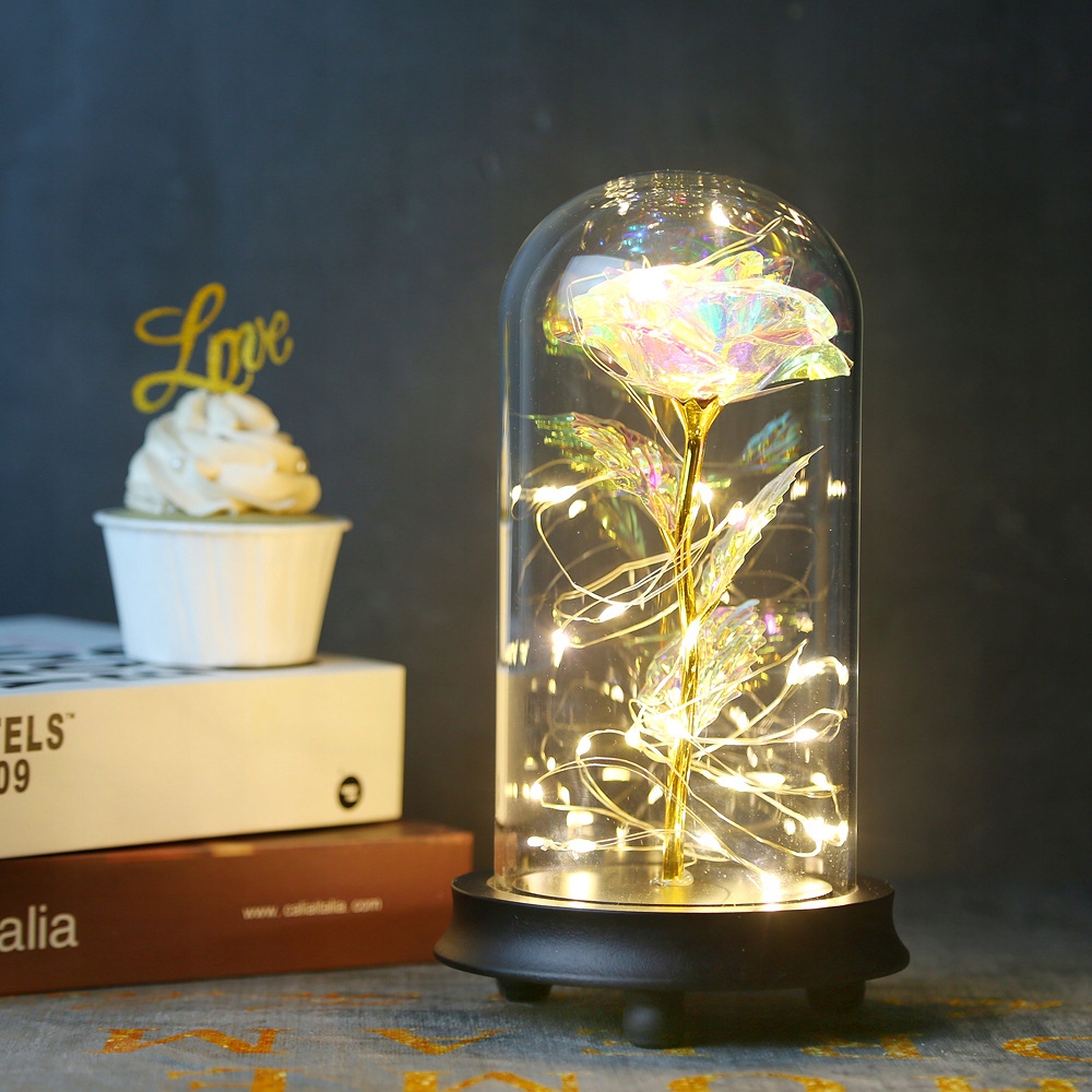 Красочная, прозрачная, опаловая искусственная роза с золотым стеблем в стеклянном куполе, со светодиодной подсветкой, на стильной черной деревянной подставке с три ножки. h2>