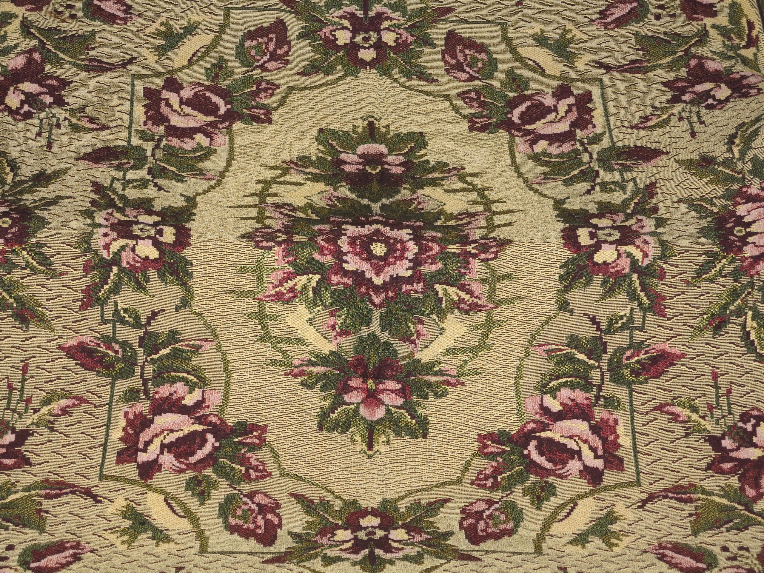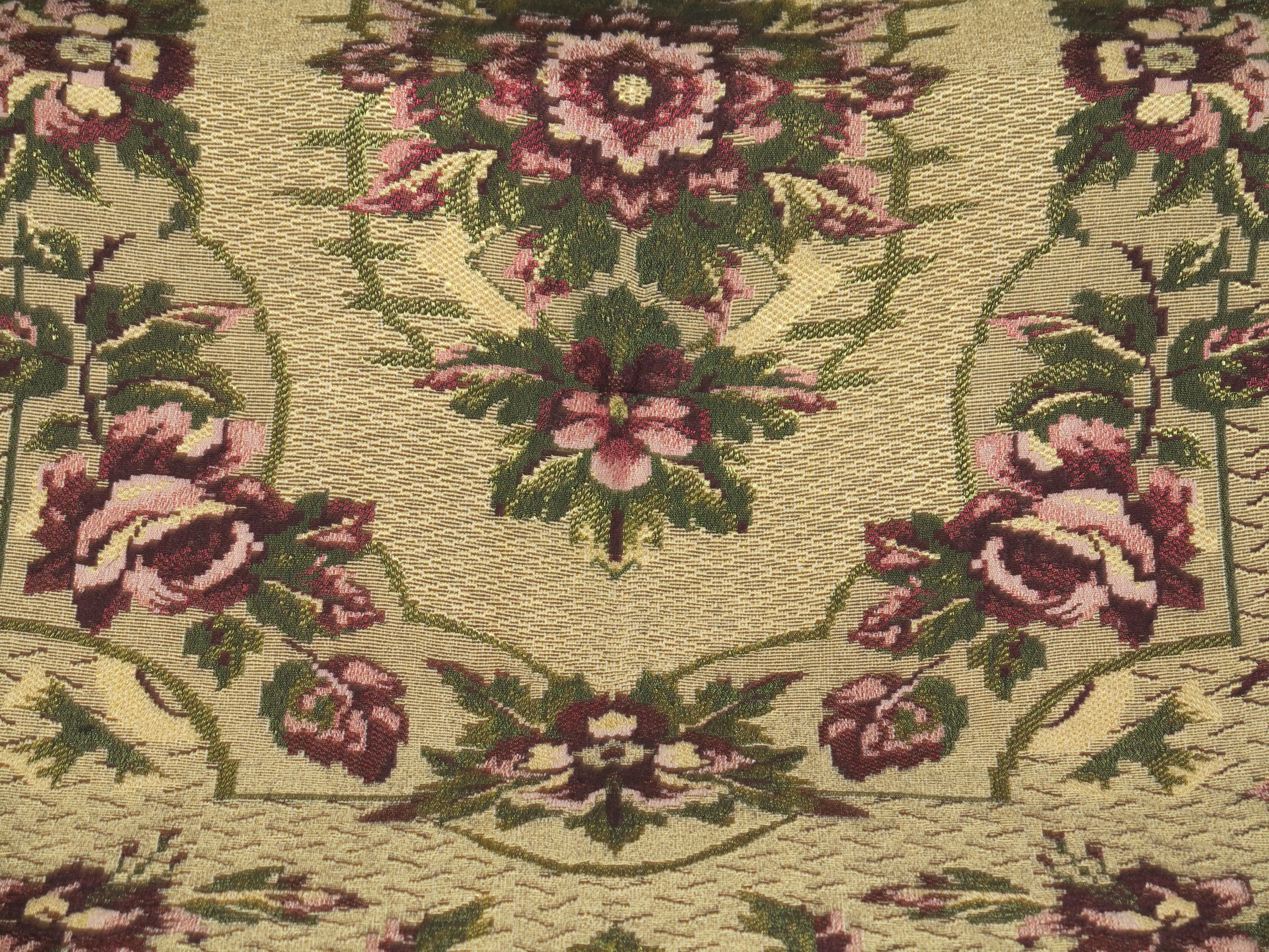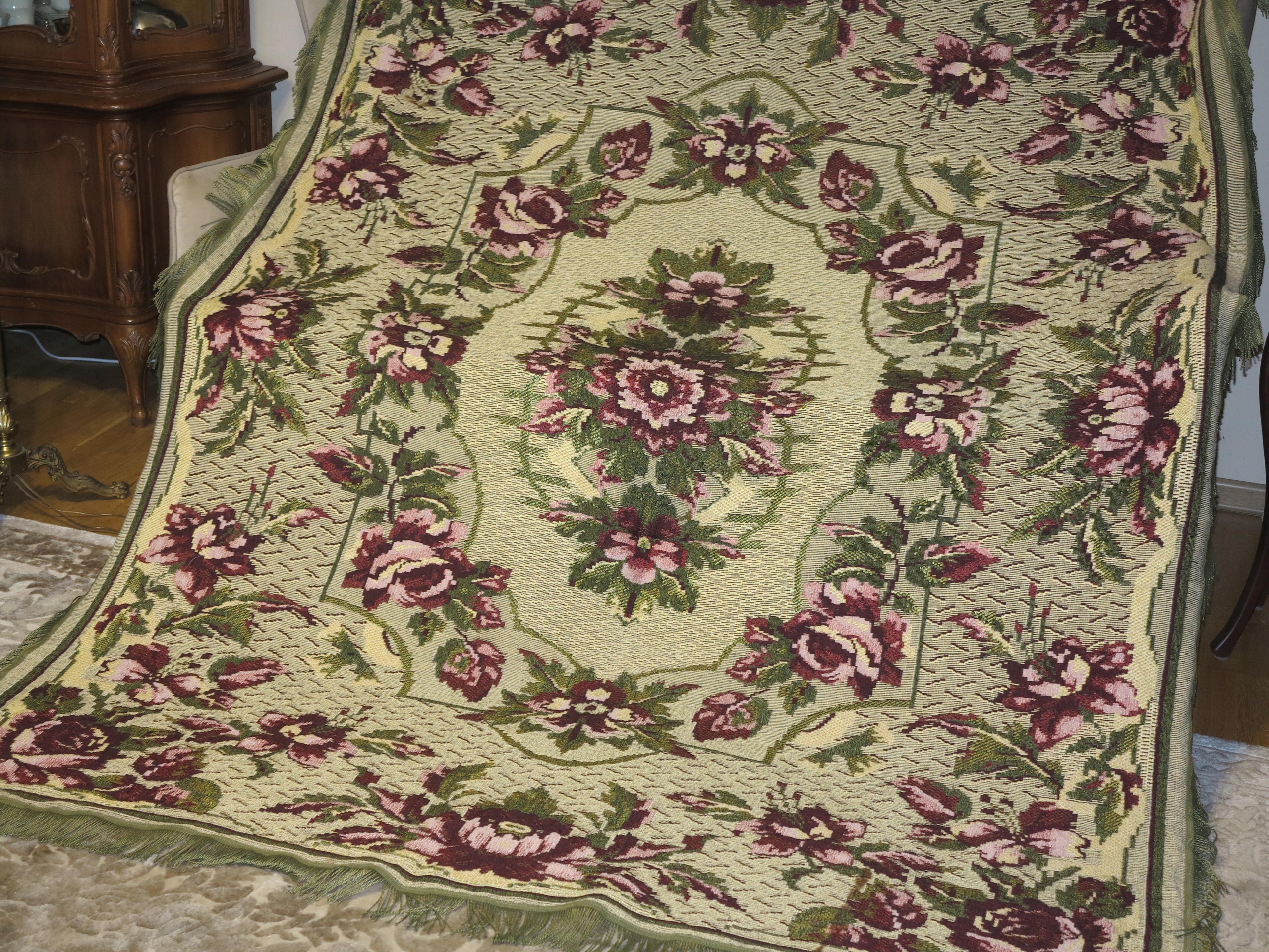 КРАСИВУЮ, ВЕКОВУЮ, СТИЛЬНУЮ, ОГРОМНУЮ СКАТЕРТЬ ИЛИ ГОБЕЛЕНОВУЮ ПОКРЫТИЕ С ОЧЕНЬ ДЕКОРАТИВНЫМИ УЗОРАМИ, РОЗАМИ И ЦВЕТАМИ. ПРИМЕРНО ОТДЕЛЕНА ЗЕЛЕНОЙ БАХИРОЙ