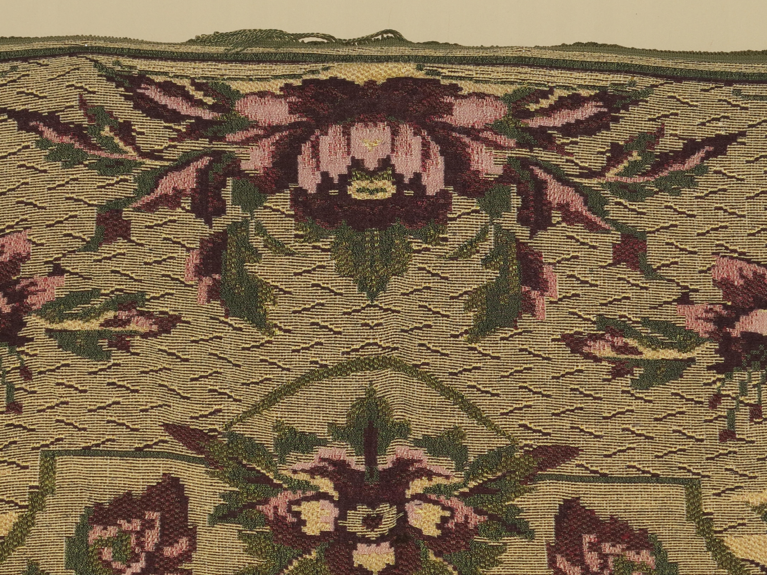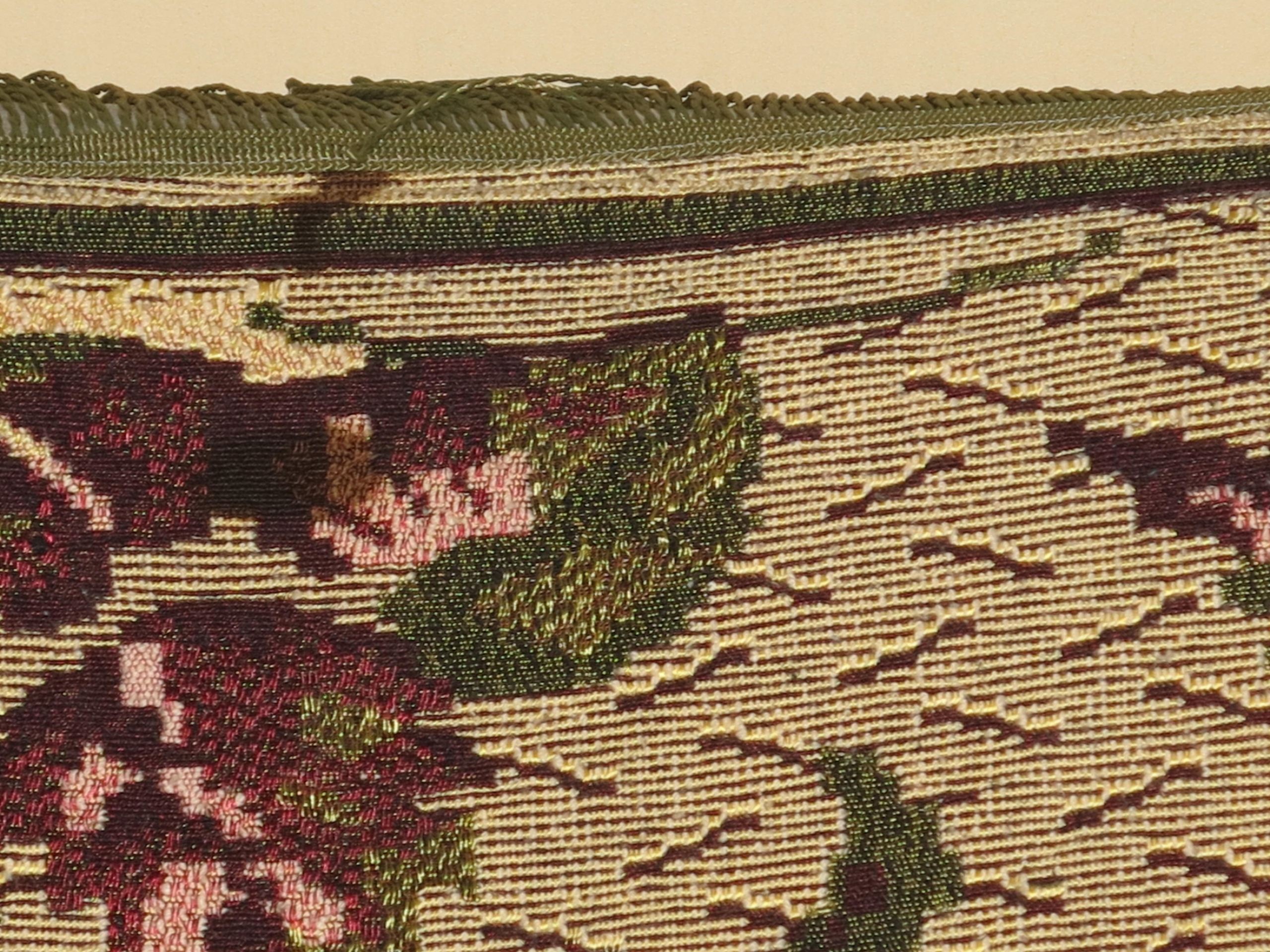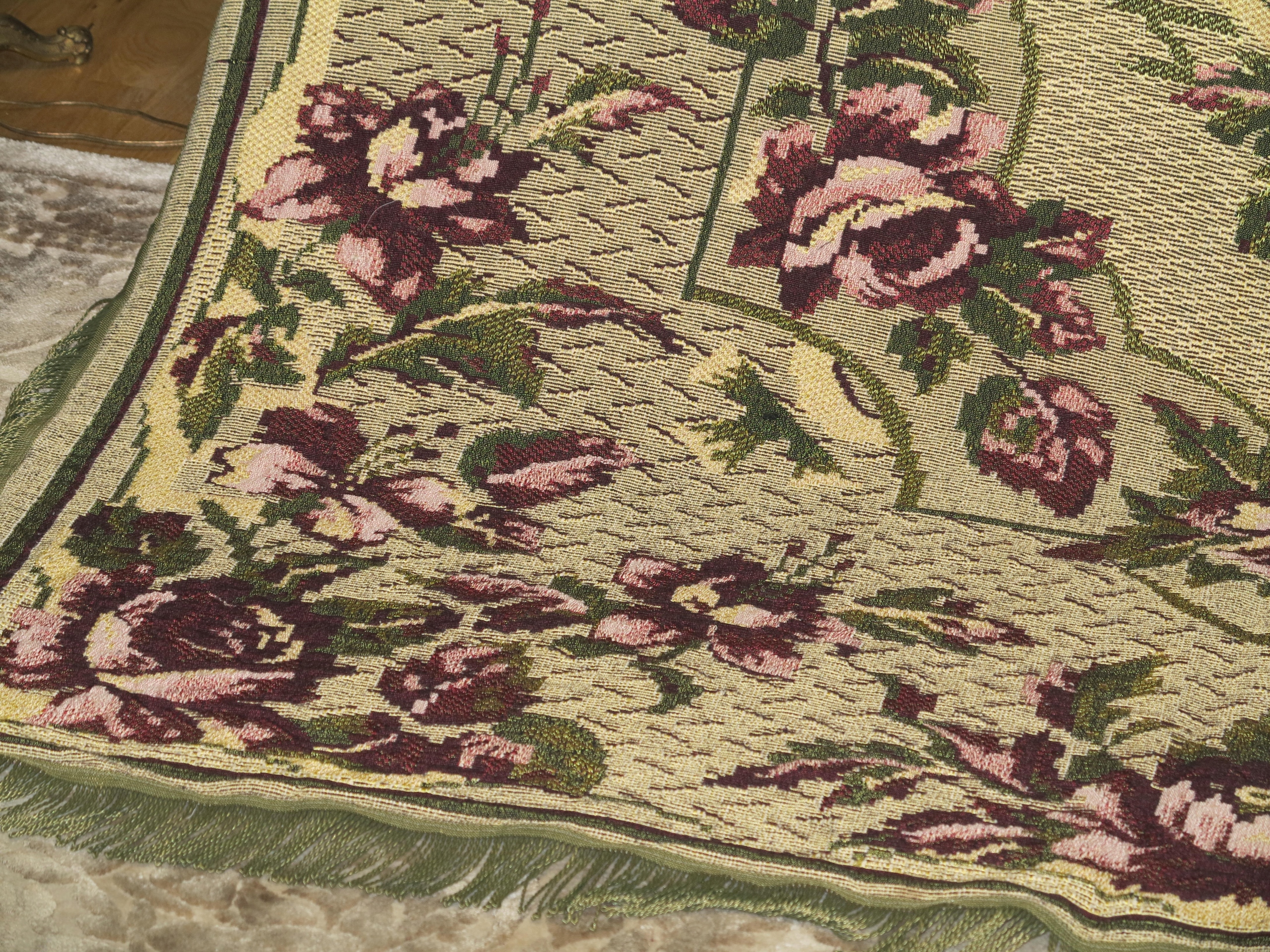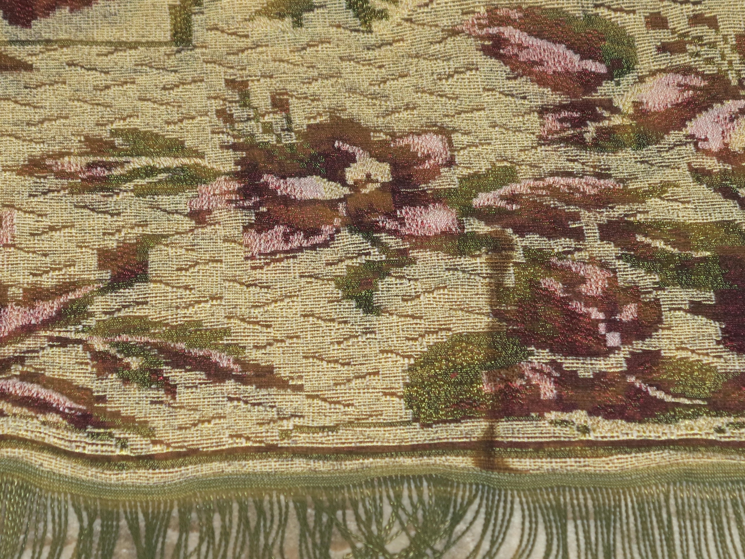 КРАСИВУЮ, ВЕКОВУЮ, СТИЛЬНУЮ, ОГРОМНУЮ СКАТЕРТЬ ИЛИ ГОБЕЛЕНОВУЮ ПОКРЫТИЕ С ОЧЕНЬ ДЕКОРАТИВНЫМИ УЗОРАМИ, РОЗАМИ И ЦВЕТАМИ. ПРИМЕРНО ОТДЕЛЕНА ЗЕЛЕНОЙ БАХИРОЙ