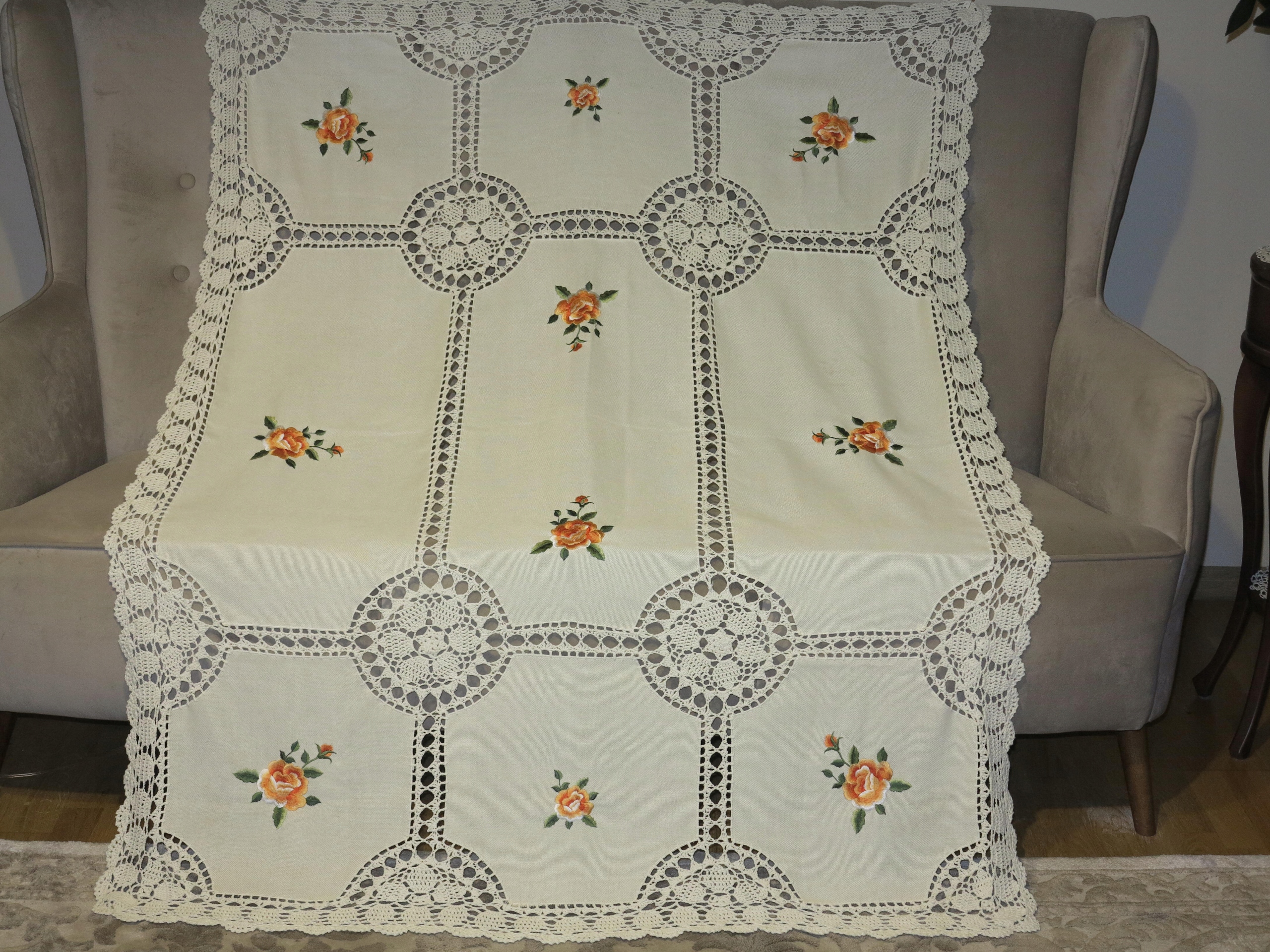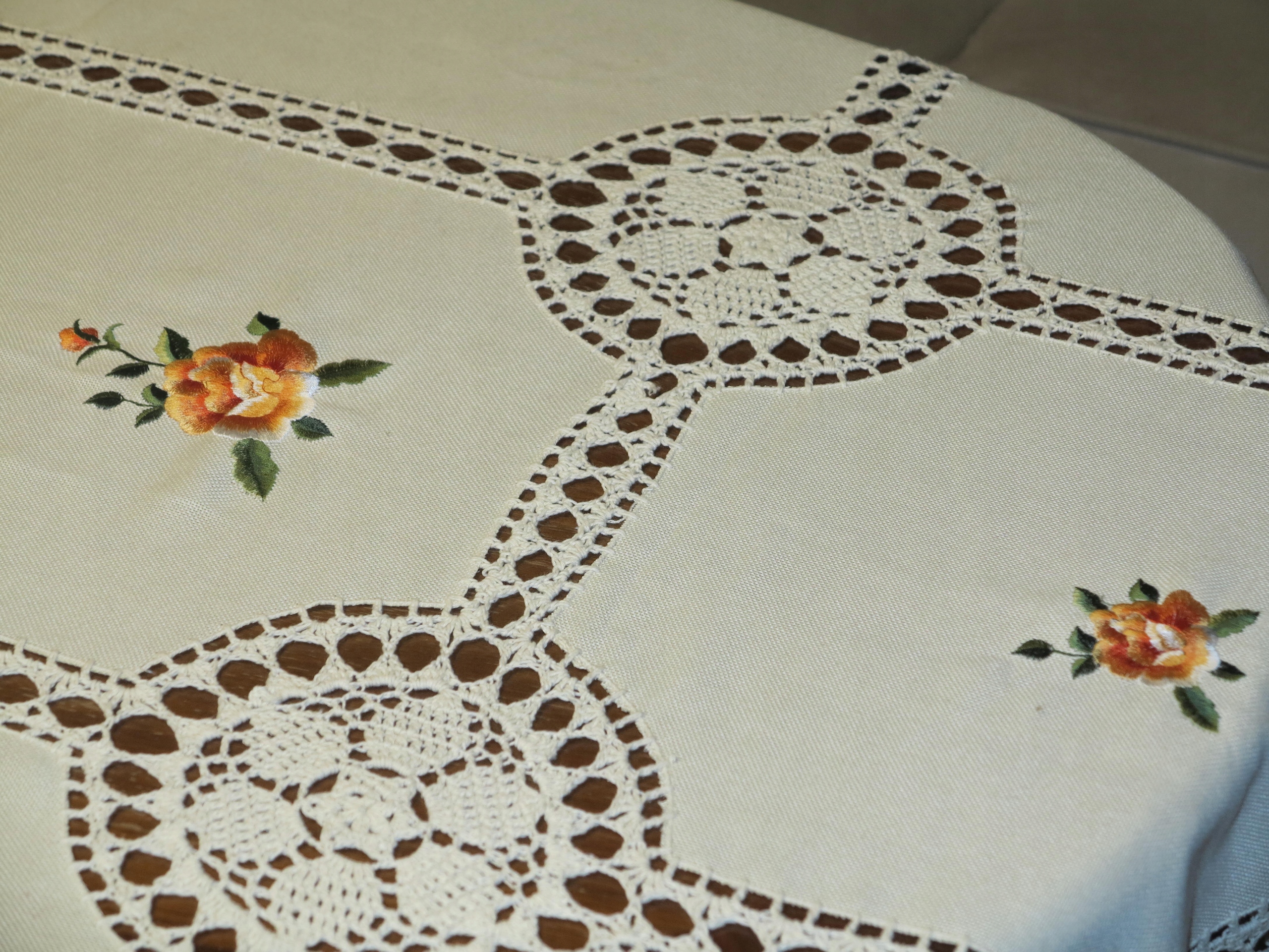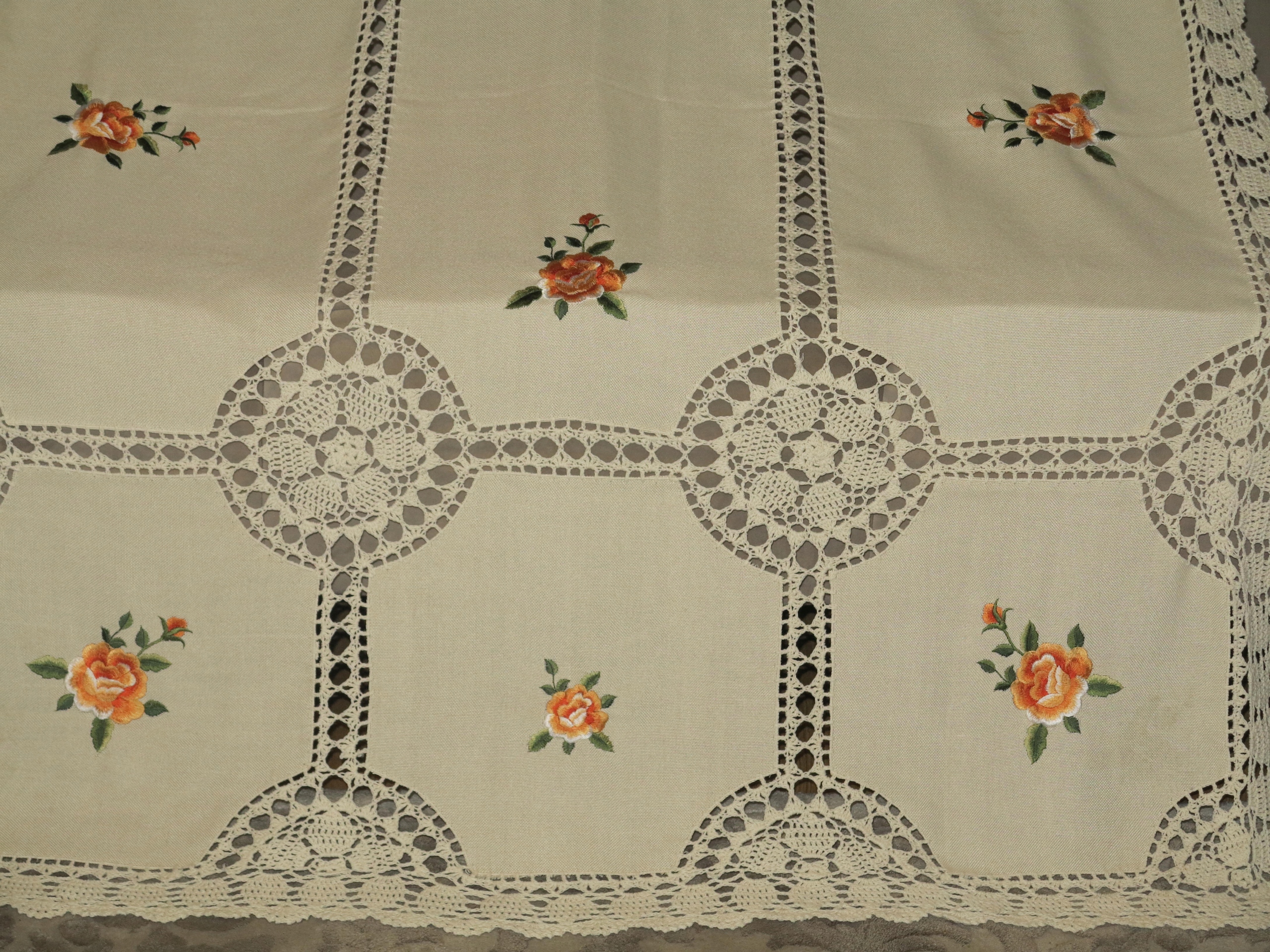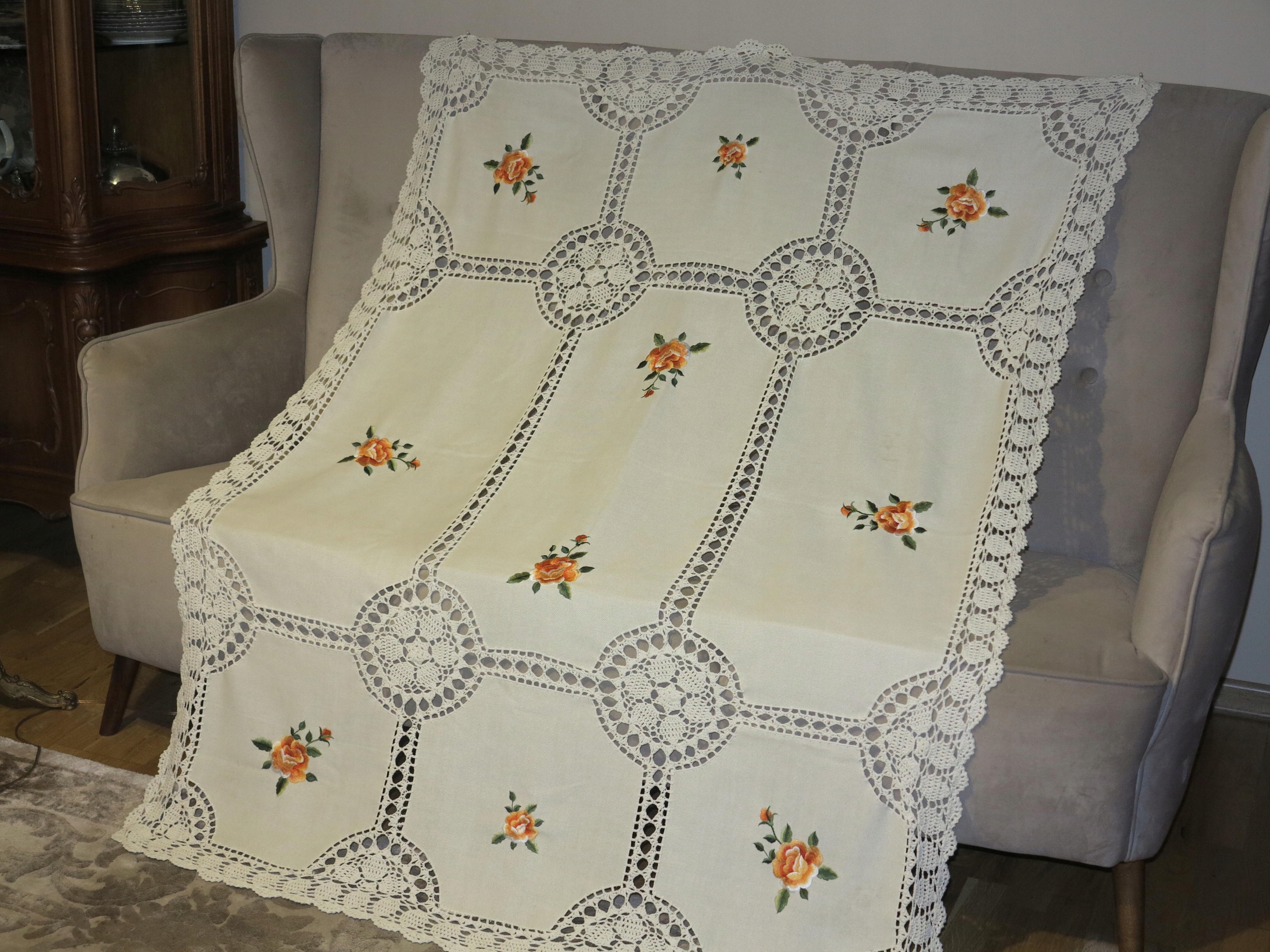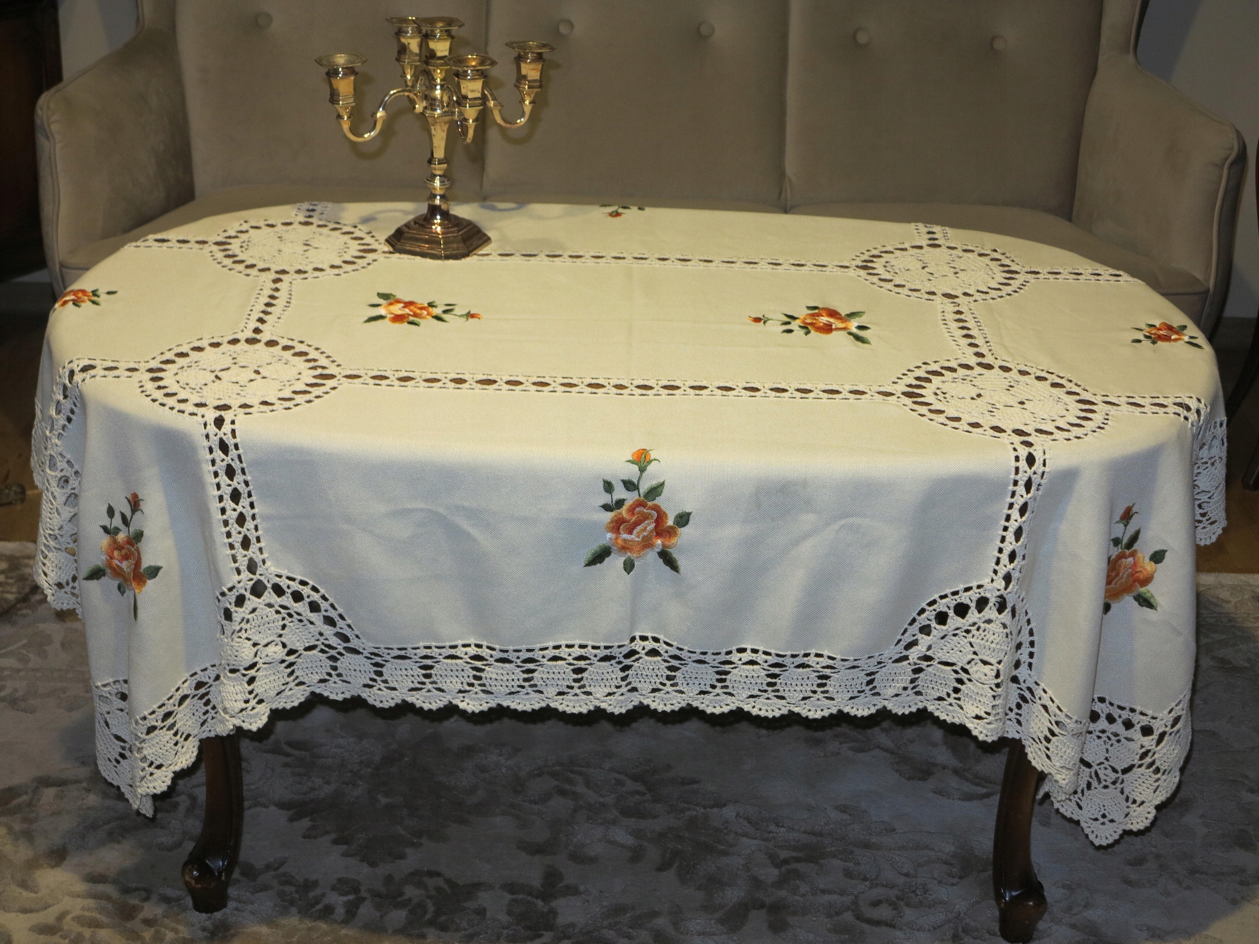 Предмет аукциона - красивое сочетание канвы и крючка, украшенное вышивкой роз.Красиво смотрится на столе. Имеет размеры: 164/132см. Б/у, в очень хорошем состоянии и качестве.
