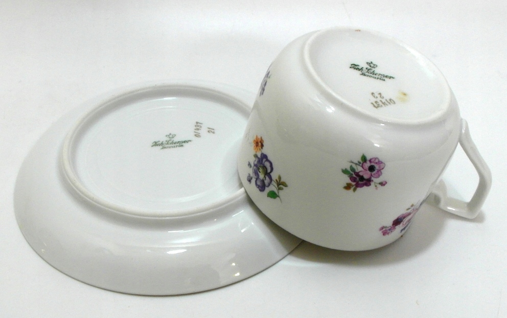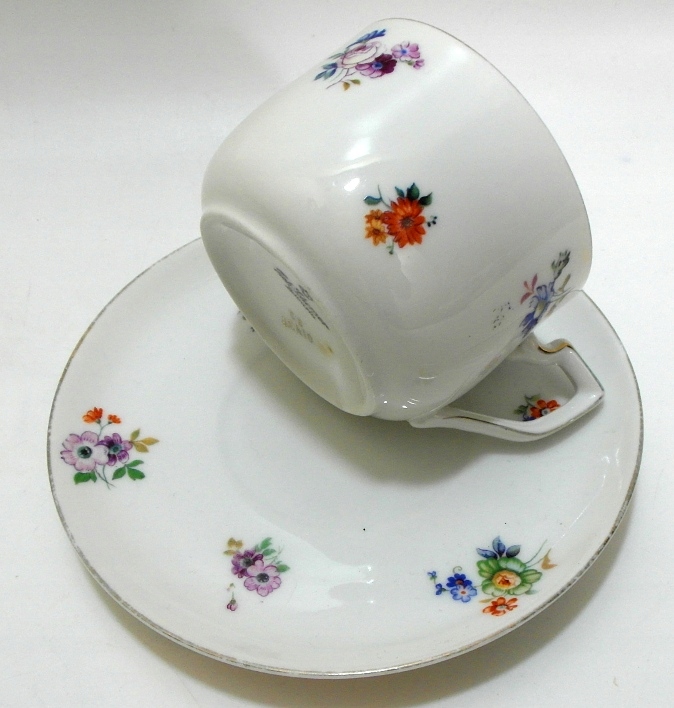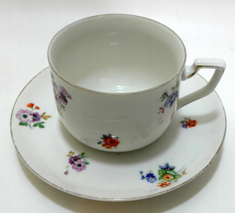 Красивая, старинная чашка, из белого фарфора, украшенная цветами и позолотой.