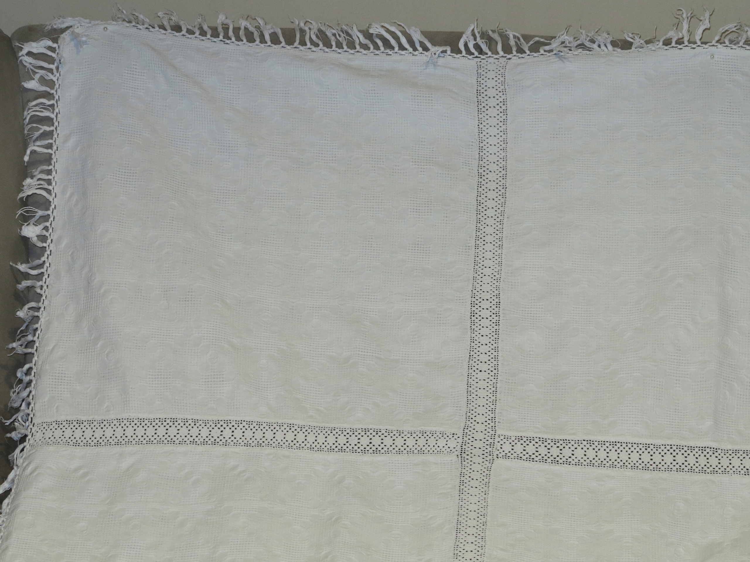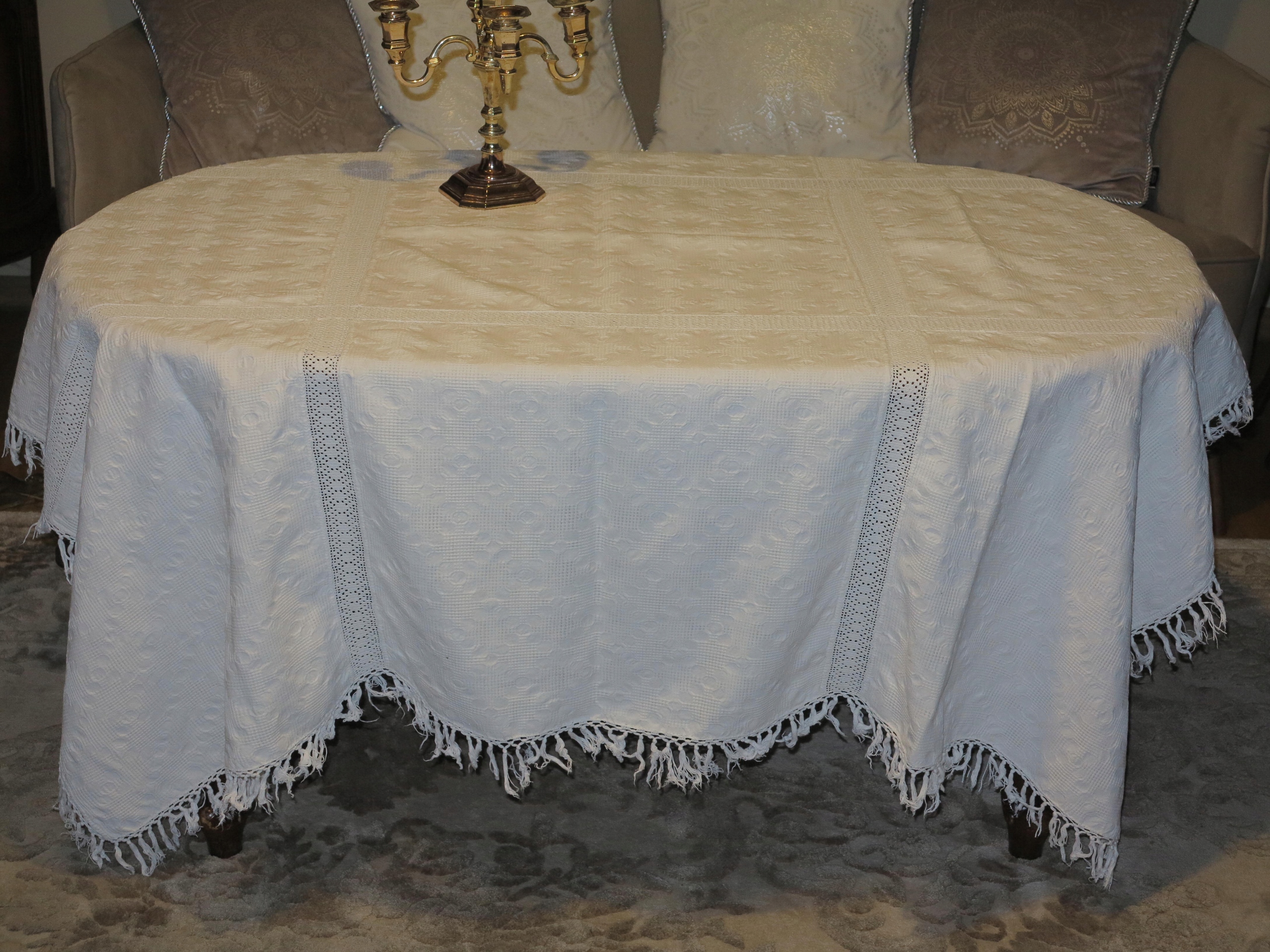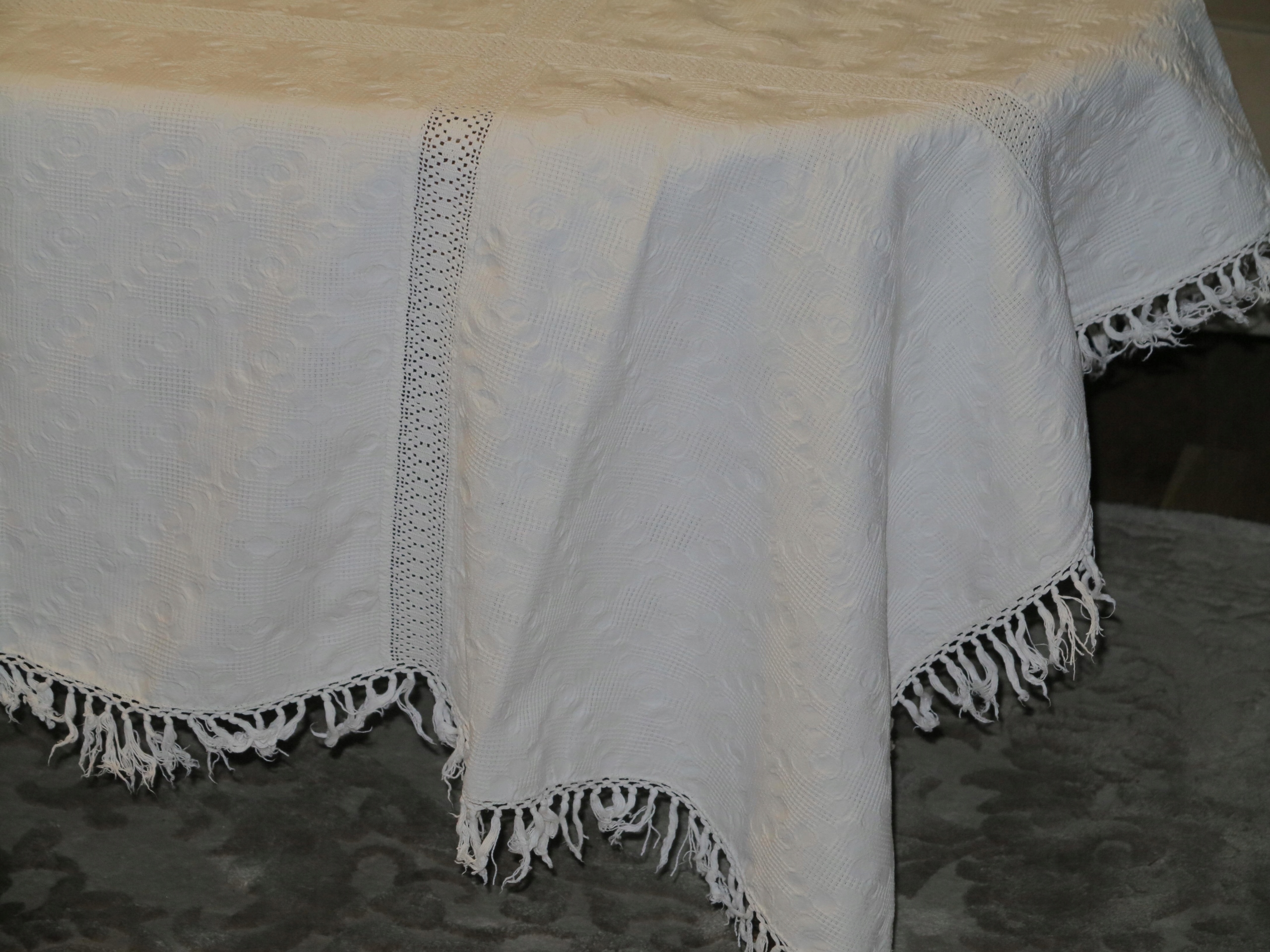 КРАСИВАЯ, ВЕКОВАЯ, ПЛОТНАЯ ХЛОПКОВАЯ СКАТЕРТЬ, С ХЛОПКОВЫМ КРУЖЕВОМ. КРУГЛЫЕ ЗАВЯЗАННЫЕ ПЕРЕДЫ. КРЕМОВО-БЕЛЫЙ ЦВЕТ