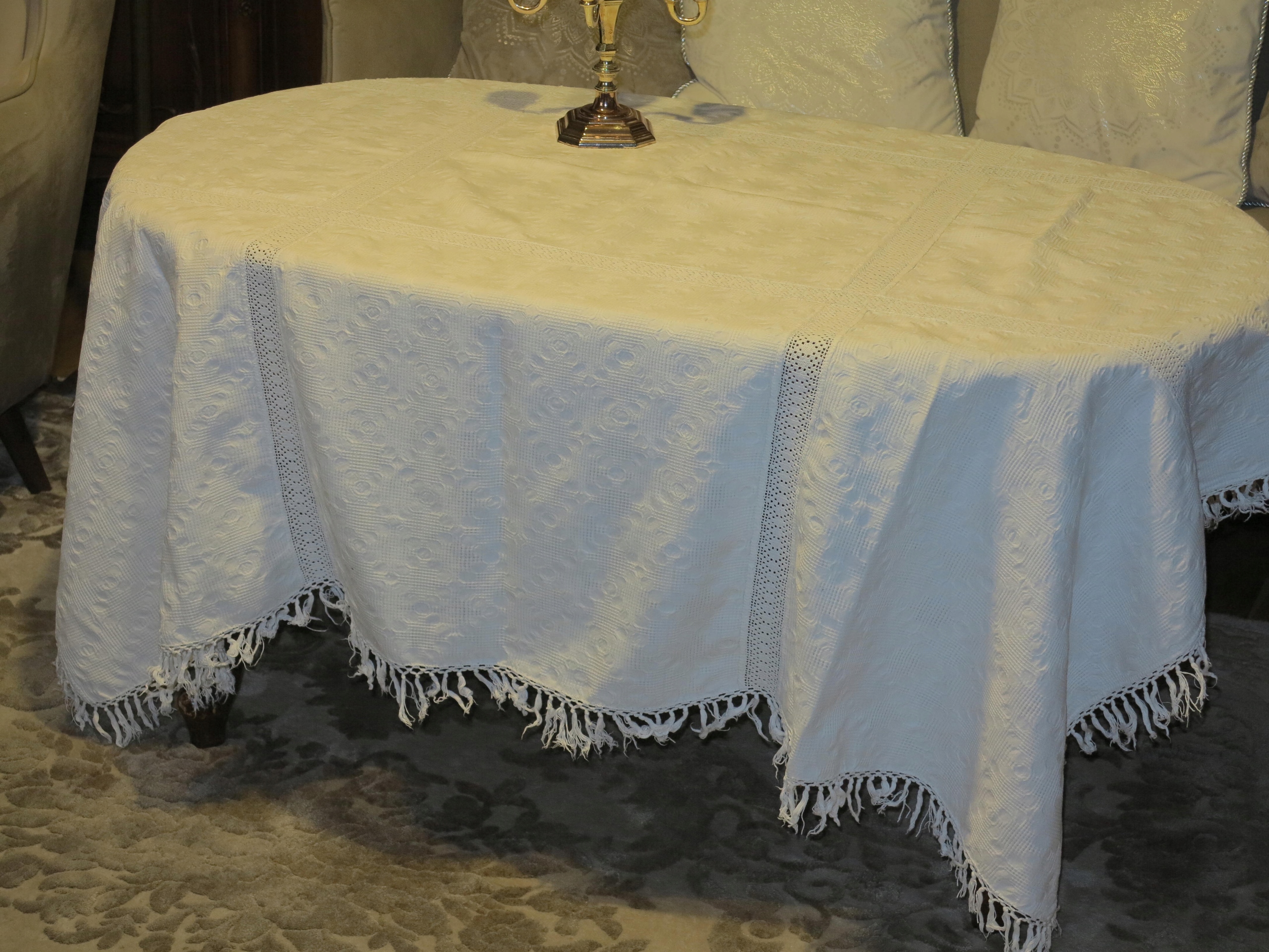 Предмет аукциона — красивая старая скатерть с кружевом и бахромой по периметру. Размеры скатерти: 172/154см + 6см бахрома. Скатерть б/у, в очень хорошем состоянии. Рекомендую