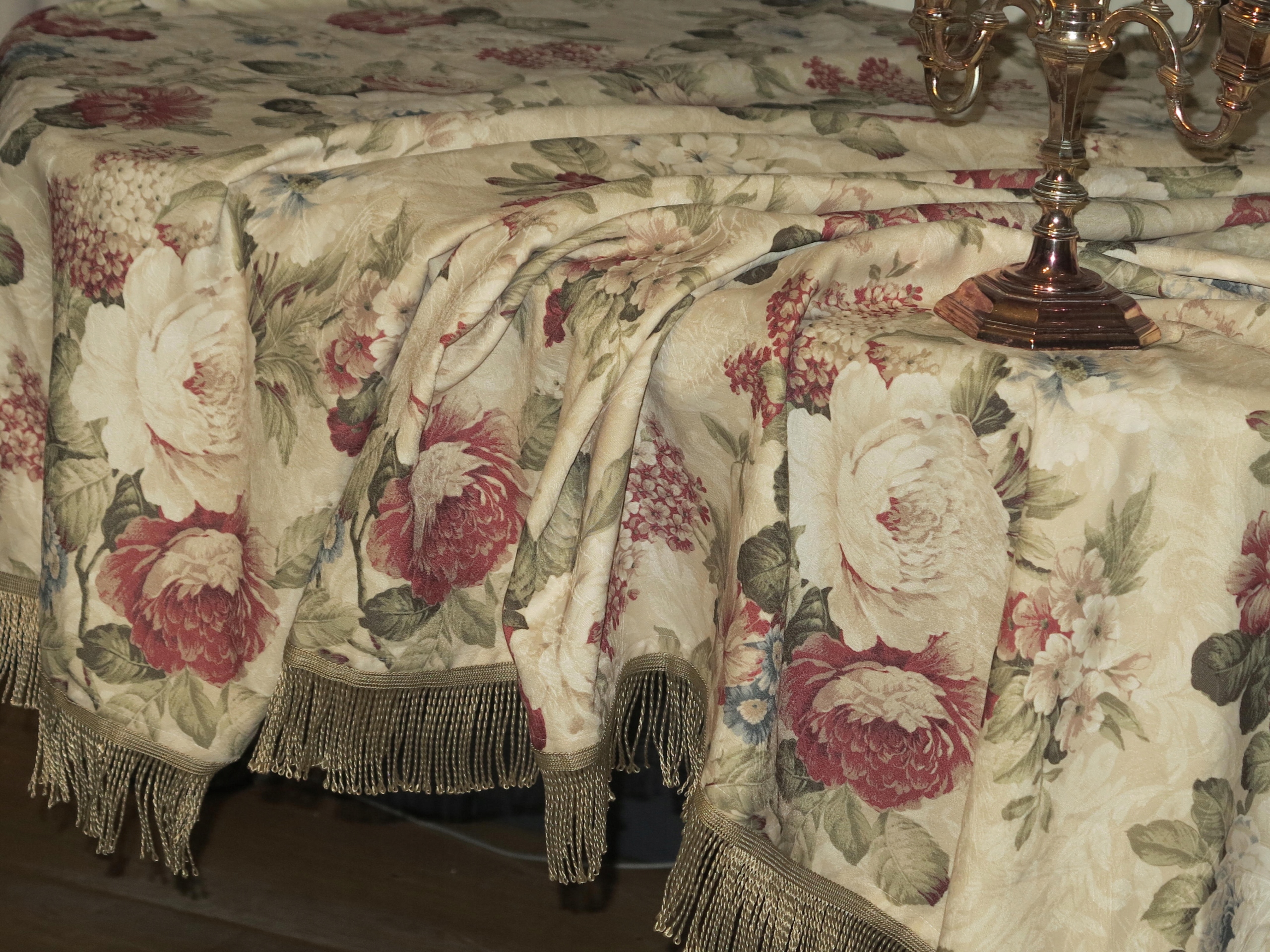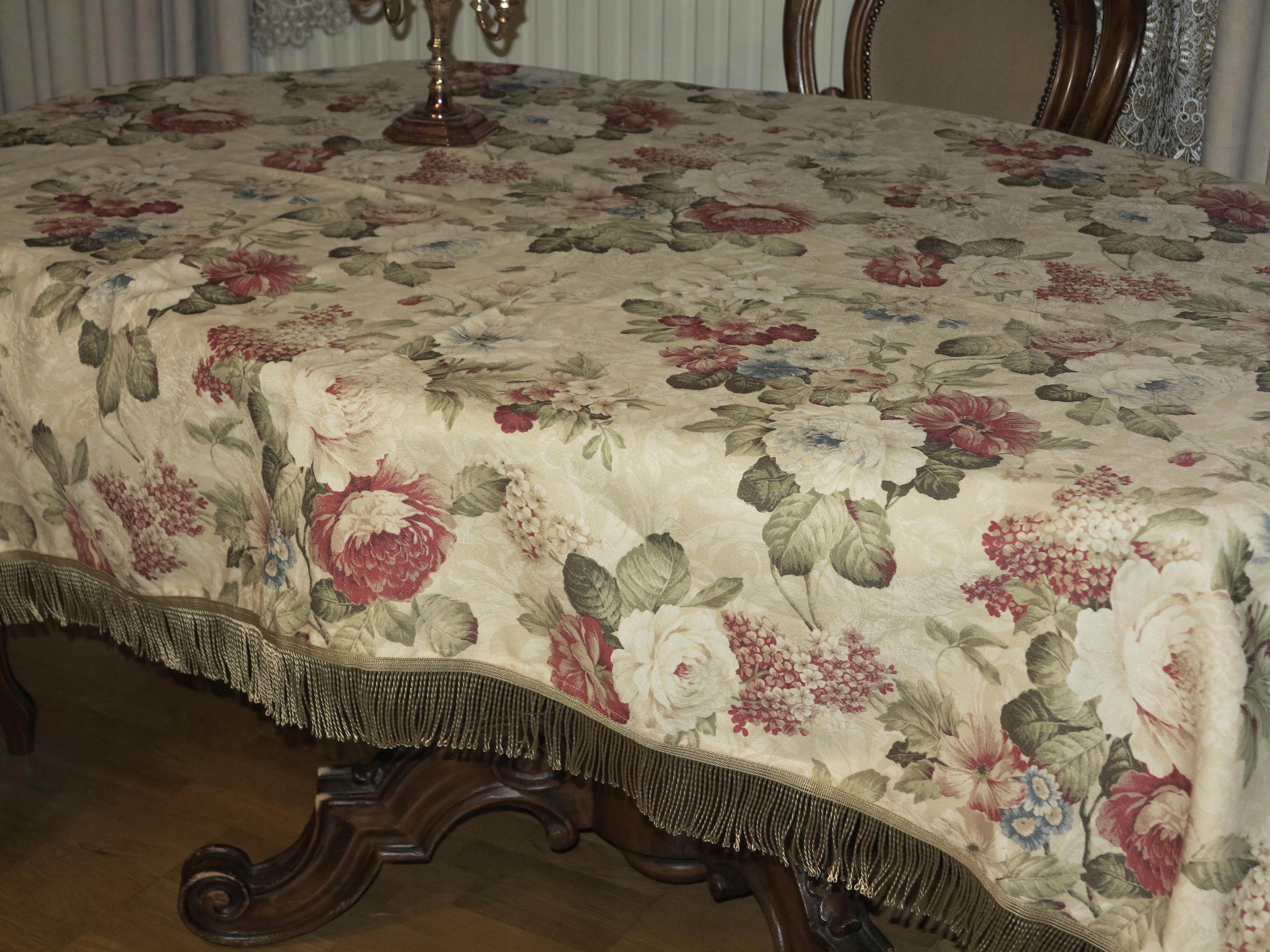КРАСИВУЮ АНГЛИЙСКУЮ ОГРОМНУЮ СКАТЕРТЬ С БОЛЬШИМИ ОЧАРОВАТЕЛЬНЫМИ БУКЕТАМИ ЦВЕТОВ, КАК НАРИСОВАННЫЕ, ОТДЕЛЕННЫЕ ЗОЛОТОЙ БАХИРОЙ ВОКРУГ. НА ТКАНИ ИМЕЕТСЯ ДОПОЛНИТЕЛЬНО ТИСНЕННЫЙ УЗОР. ТКАНЬ ПРЕИМУЩЕСТВЕННО ХЛОПКОВЫЙ ЖАККАРД