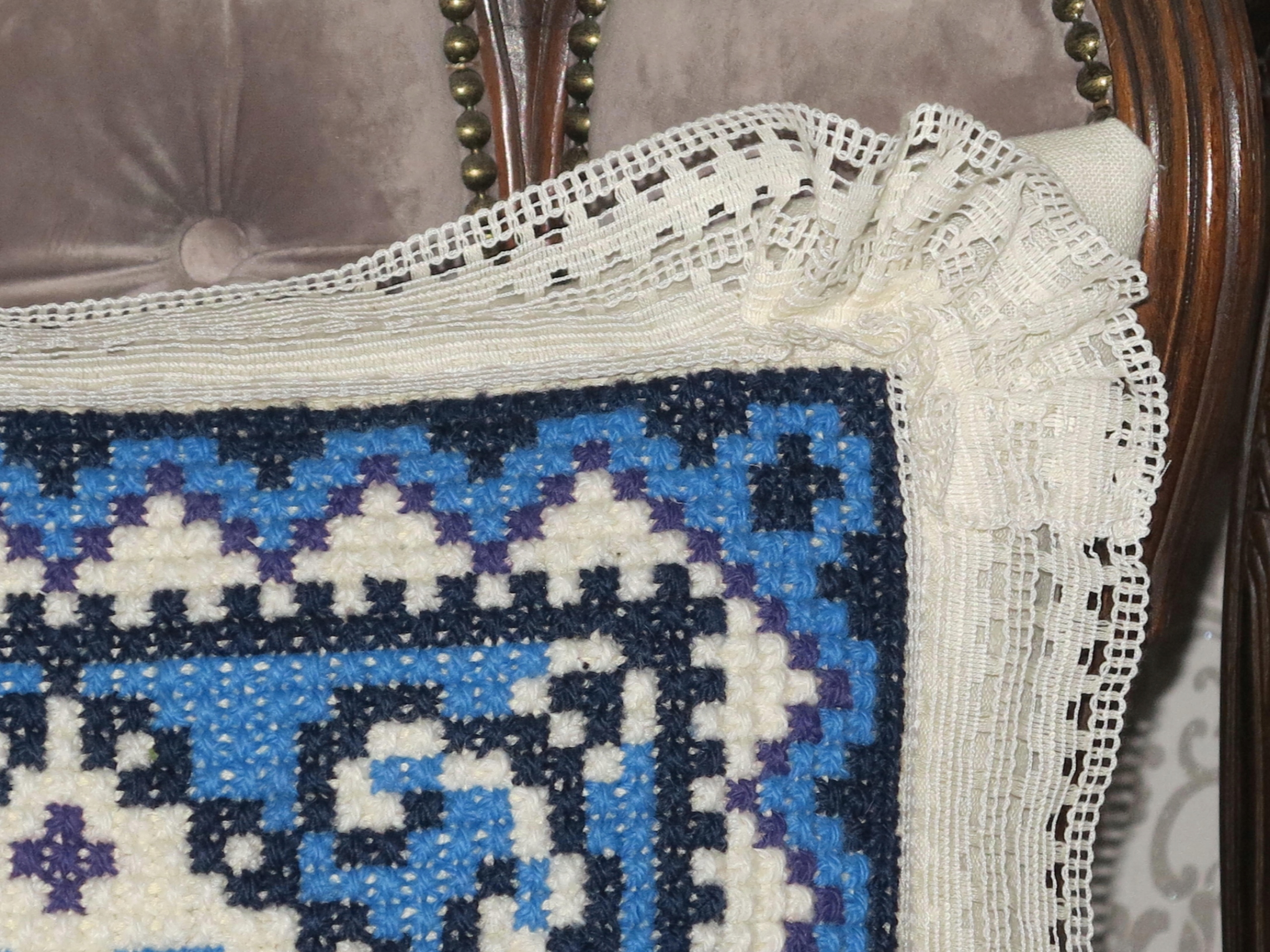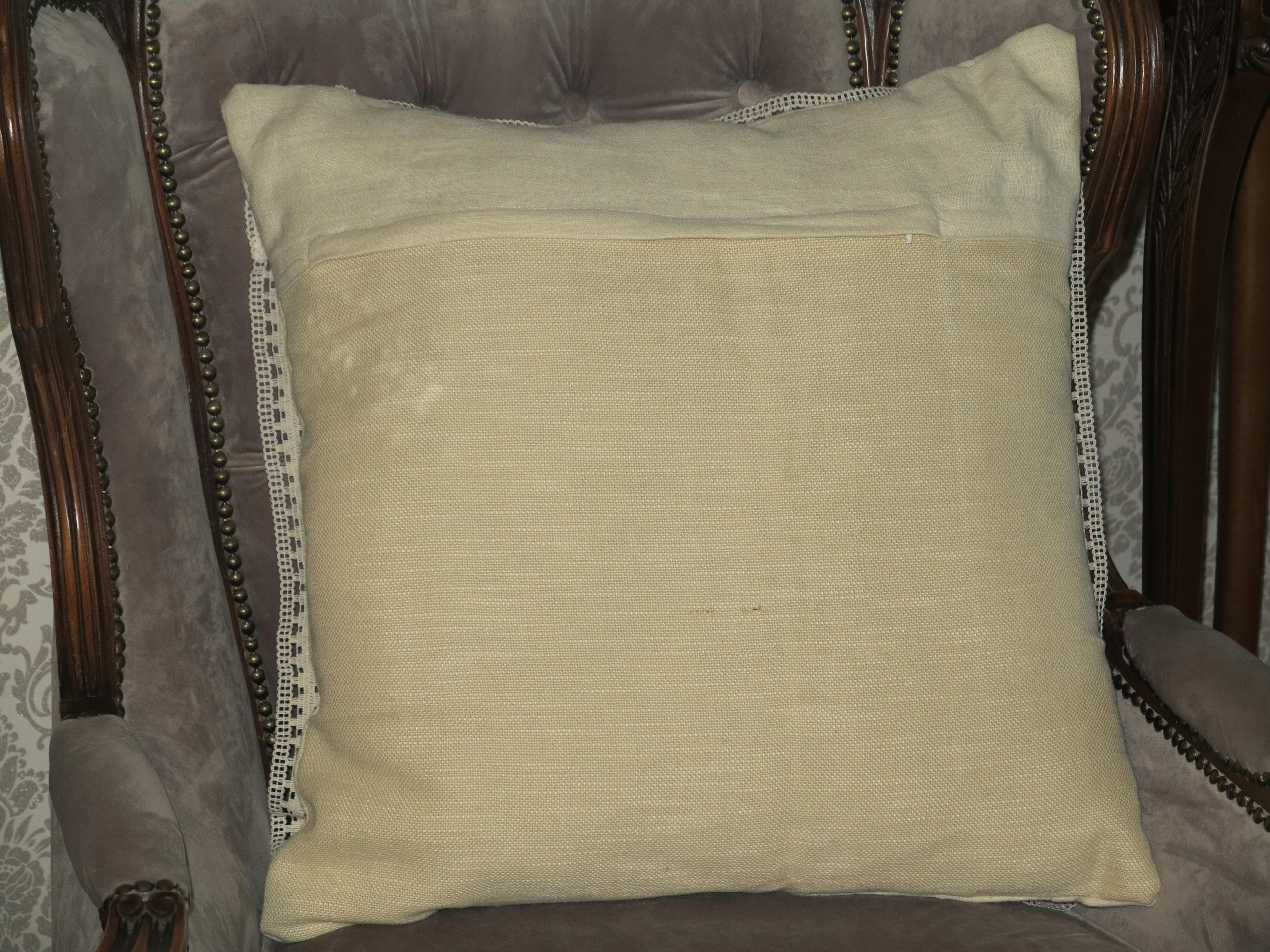 КРАСИВУЮ И ОЧЕНЬ ДЕКОРАТИВНУЮ БОЛЬШУЮ ЛЬНЯНУЮ ПОДУШКУ С НАПОЛНИТЕЛЕМ ПЕРЕДНЕЙ С ВЫШИВКОЙ РУЧНОЙ КРЕСТОМ, ВЫПОЛНЕННОЙ ШЕРСТЯНЫМИ НИТЬЯМИ И КРУЖЕВОМ. ПОДУШКА С СИНТЕТИЧЕСКИМ НАПОЛНИТЕЛЕМ - МЯГКАЯ И ПУШИСНАЯ
