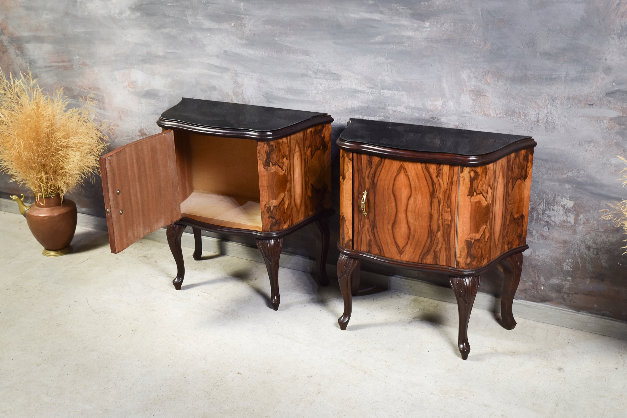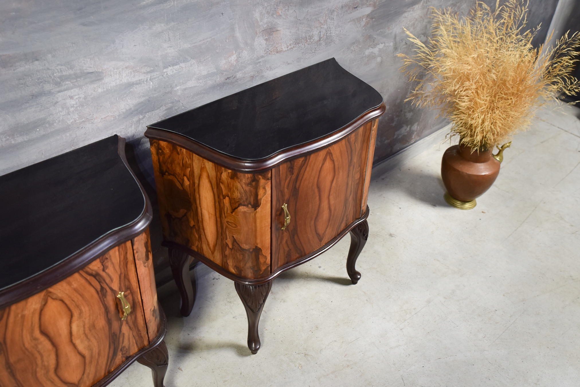 Красивый комплект из двух прикроватных тумбочек из орехового дерева, оформленных в стиле неорококо. Мебель была создана в 1950-1960-е годы и тщательно отреставрирована, вернув ей былое великолепие и элегантность.