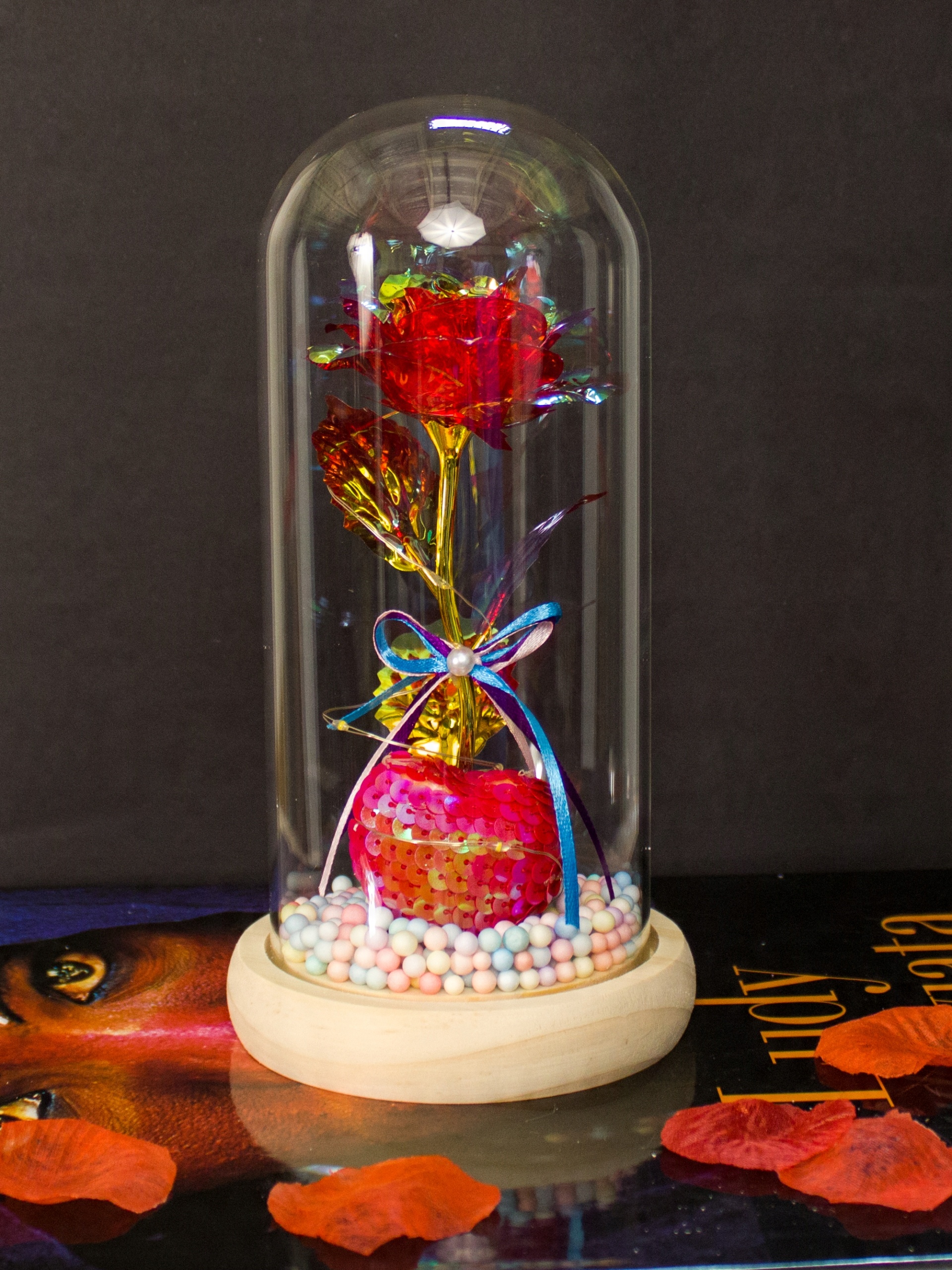 Эта тщательно изготовленная роза, символ любви, была помещена в красивый стеклянный купол, сквозь который ее красоту можно увидеть постоянно, даже в темноте, поскольку она подсвечена 20 светодиодными лампочками
