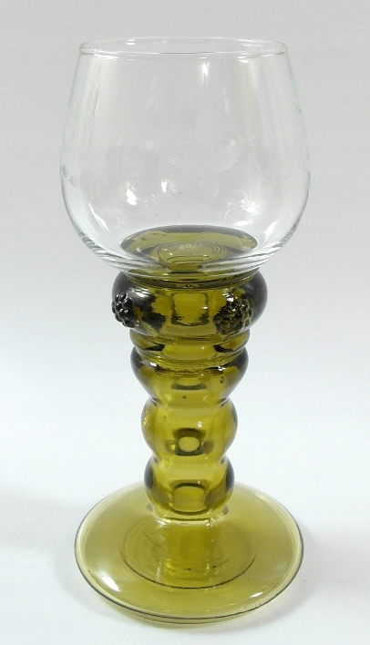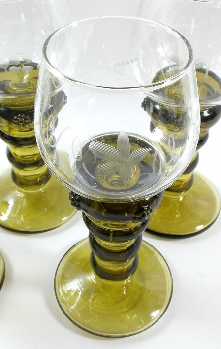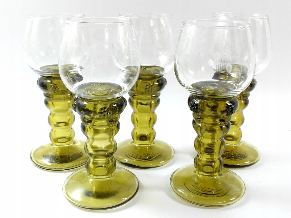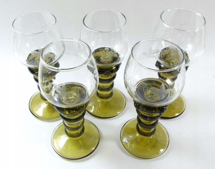 Красивый старинный набор из 5 бокалов из тонированного в массе бесцветного хрустального стекла. Комплект украшен вырезом, ножки закрыты. Бокалы в отличном состоянии.