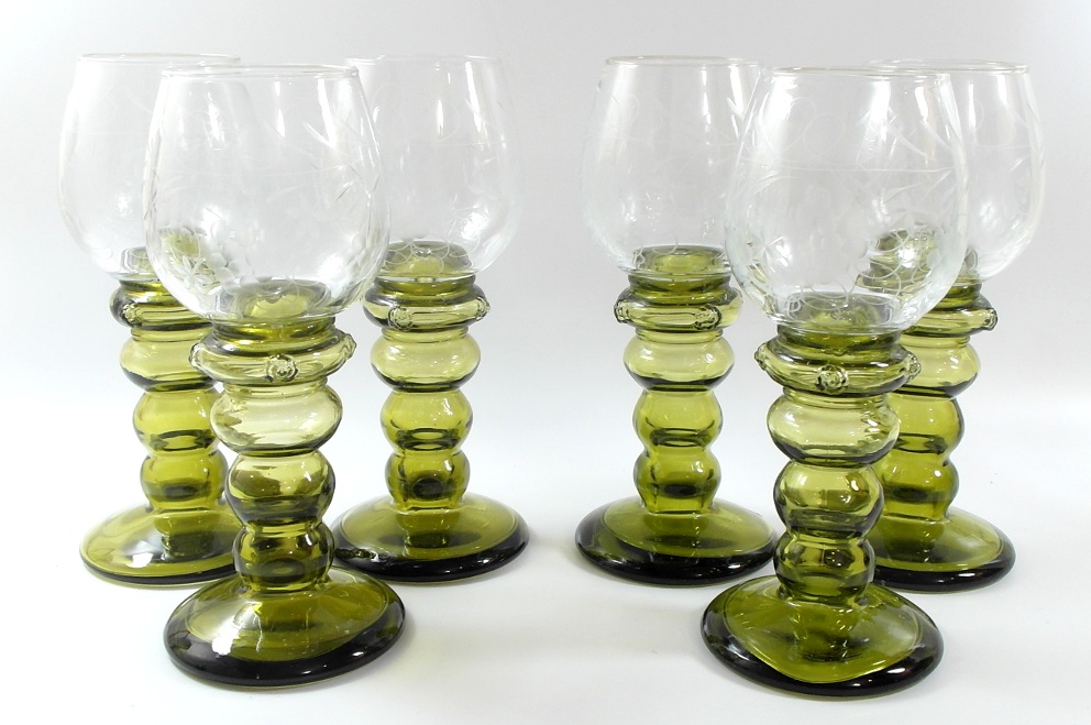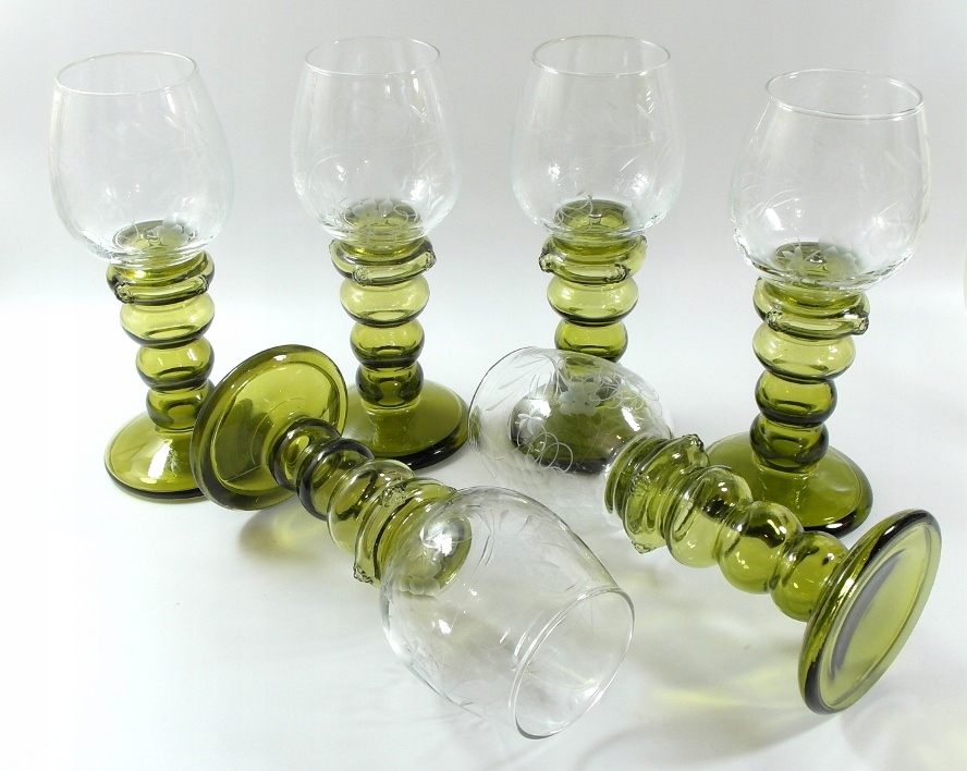 Красивый старинный набор из 6 бокалов из тонированного в массе бесцветного хрустального стекла. Комплект украшен вырезом, ножки закрыты. Стаканы в отличном состоянии.
