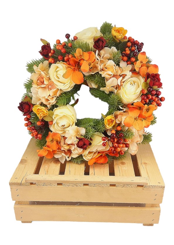 Вывешивая венок на улице, помните, что под воздействием погодных условий цветы могут испачкаться, окраска цветов может испачкаться. теряют интенсивность и т. д.