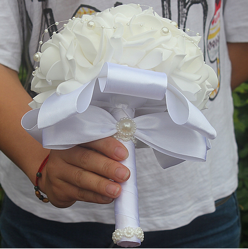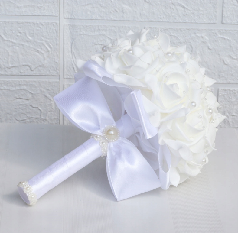 Белые розы из искусственного пенопласта, украшенные жемчугом на нитке, белоснежные, создают красивый букетаккуратно ручная работа. Низ оплетен атласной лентой, красиво оформлен для еще большего эффекта.