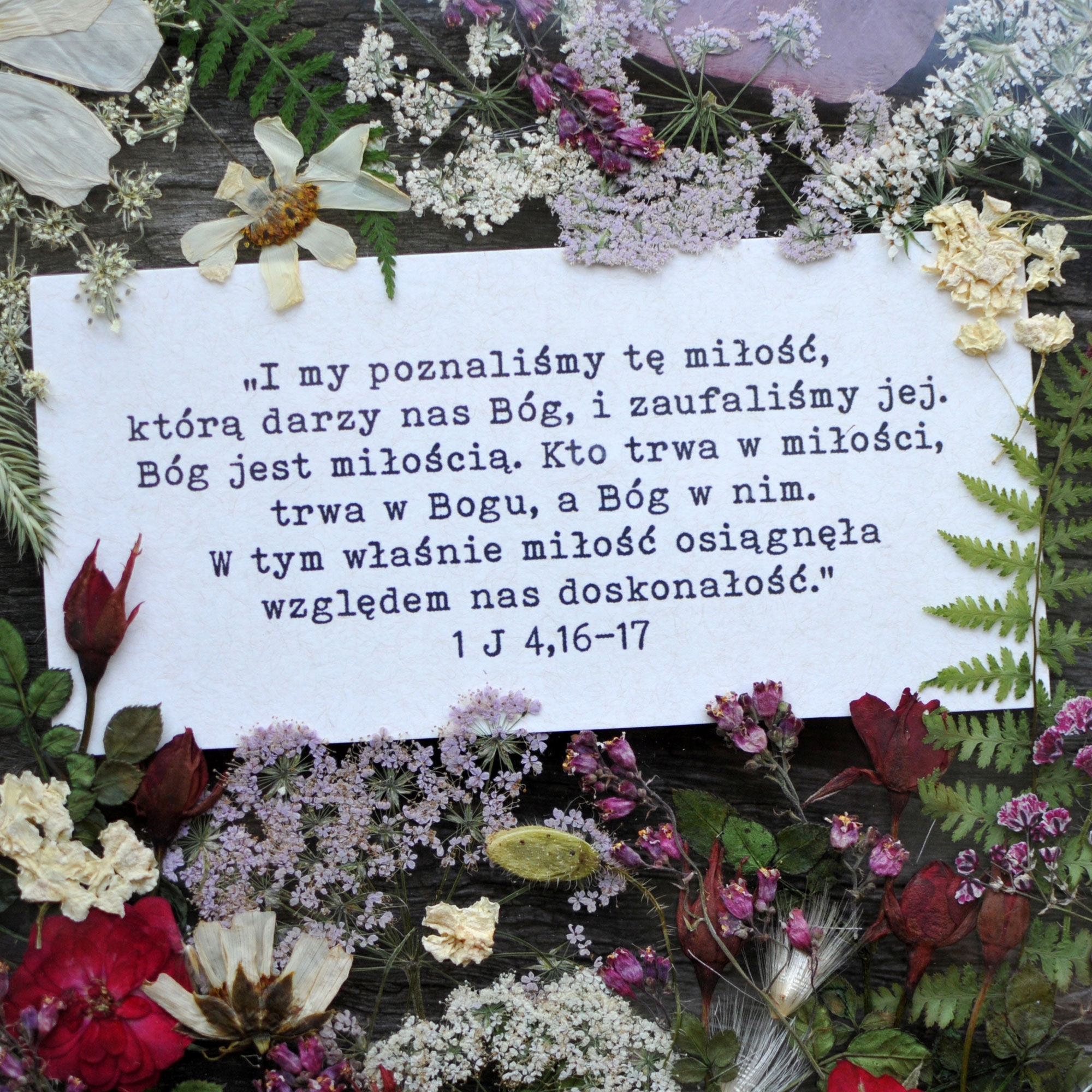 Piękny dekor z cytatem i suszonymi kwiatami, idealny prezent dla nowożeńców