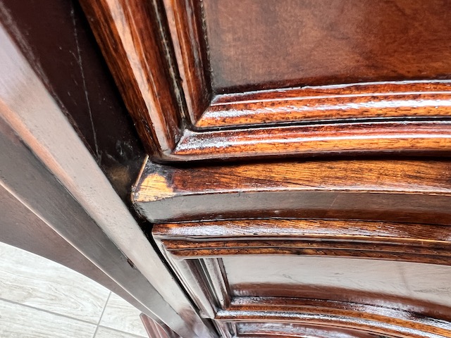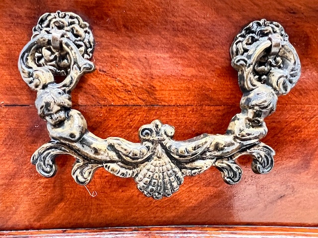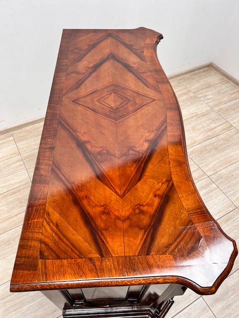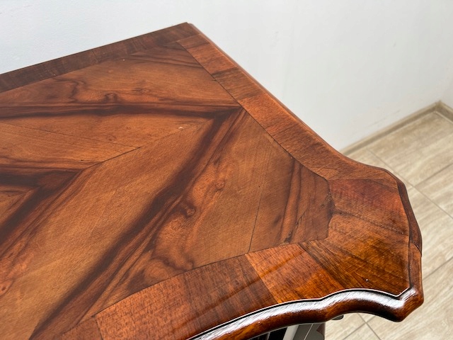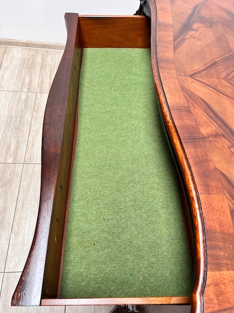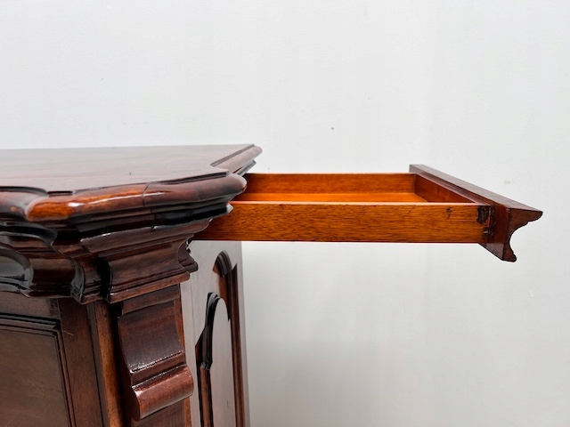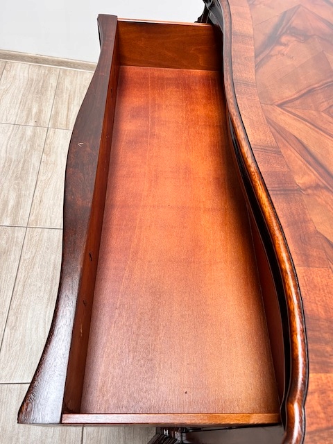 Красивый комод с тремя ящиками. Изготовлен из дуба. Он тяжелый, массивный. Гламурный. Имеет неправильную форму. Под столешницей есть два потайных отделения. Он сохранился в очень хорошем состоянии. Имеет следы использования; небольшие потертости на краю под ящиком, скорее результат возраста, чем неправильного использования. Внутри ящики в хорошем состоянии. Они застелены тонким ковром. Лак в хорошем состоянии. Стильные ручки также заслуживают внимания. По нашим оценкам, комоду может быть более ста лет. Он сразу станет украшением любого стильного помещения. Готово к вставке.