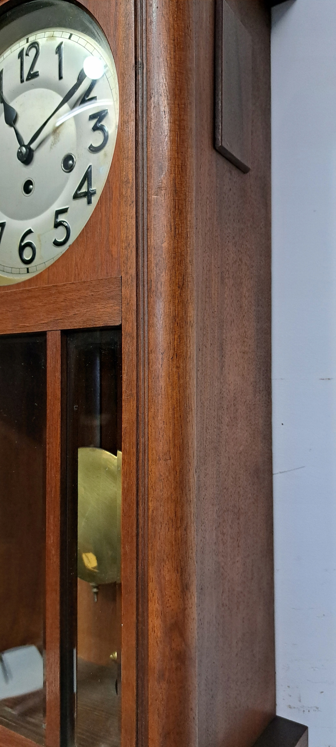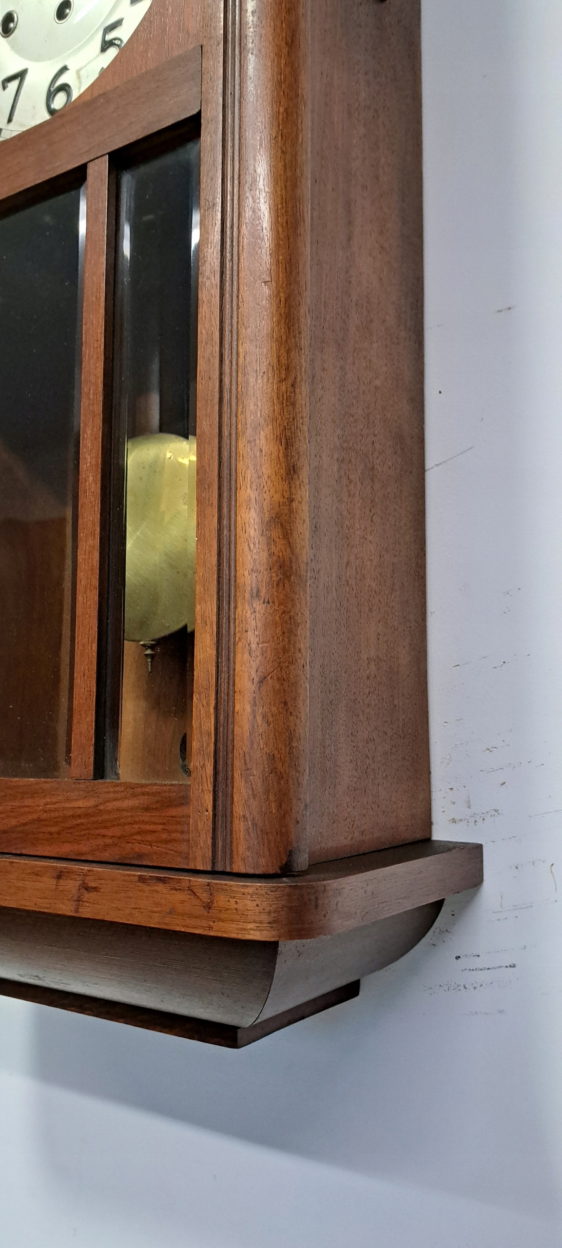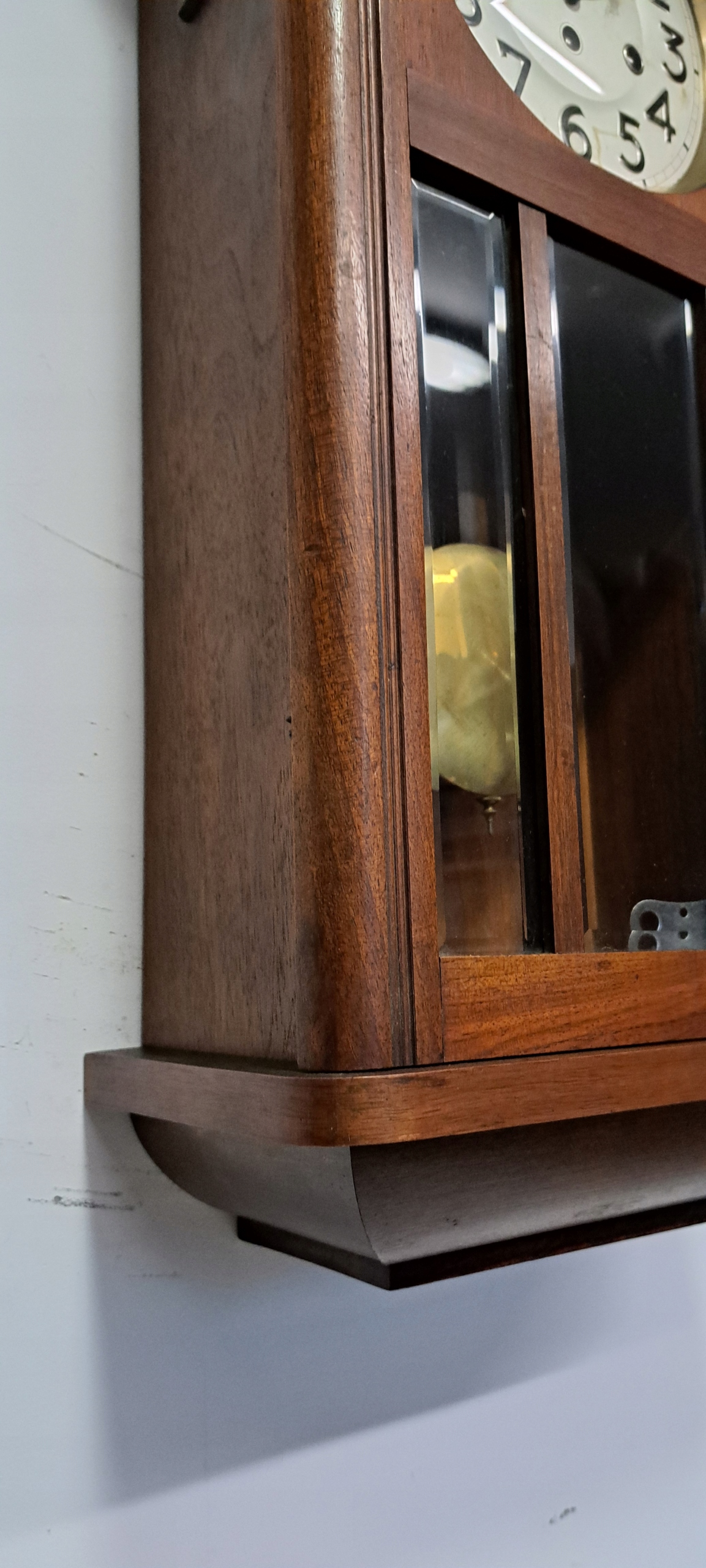 КРАСИВЫЙ ВИТРАЖ С 3 ОЧЕНЬ ТОЛСТЫМИ, ХРУСТАЛЬНЫМИ СТЕКЛО С ФАСКОЙ, РАЗДЕЛЕННОЕ ПОЛОСАМИ, ЗА КОТОРЫМ ДВИГАЕТСЯ МАЯТНИК, ПРАВИЛЬНО И ПУНКТУАЛЬНО ОТКАЗЫВАЯ ВРЕМЯ