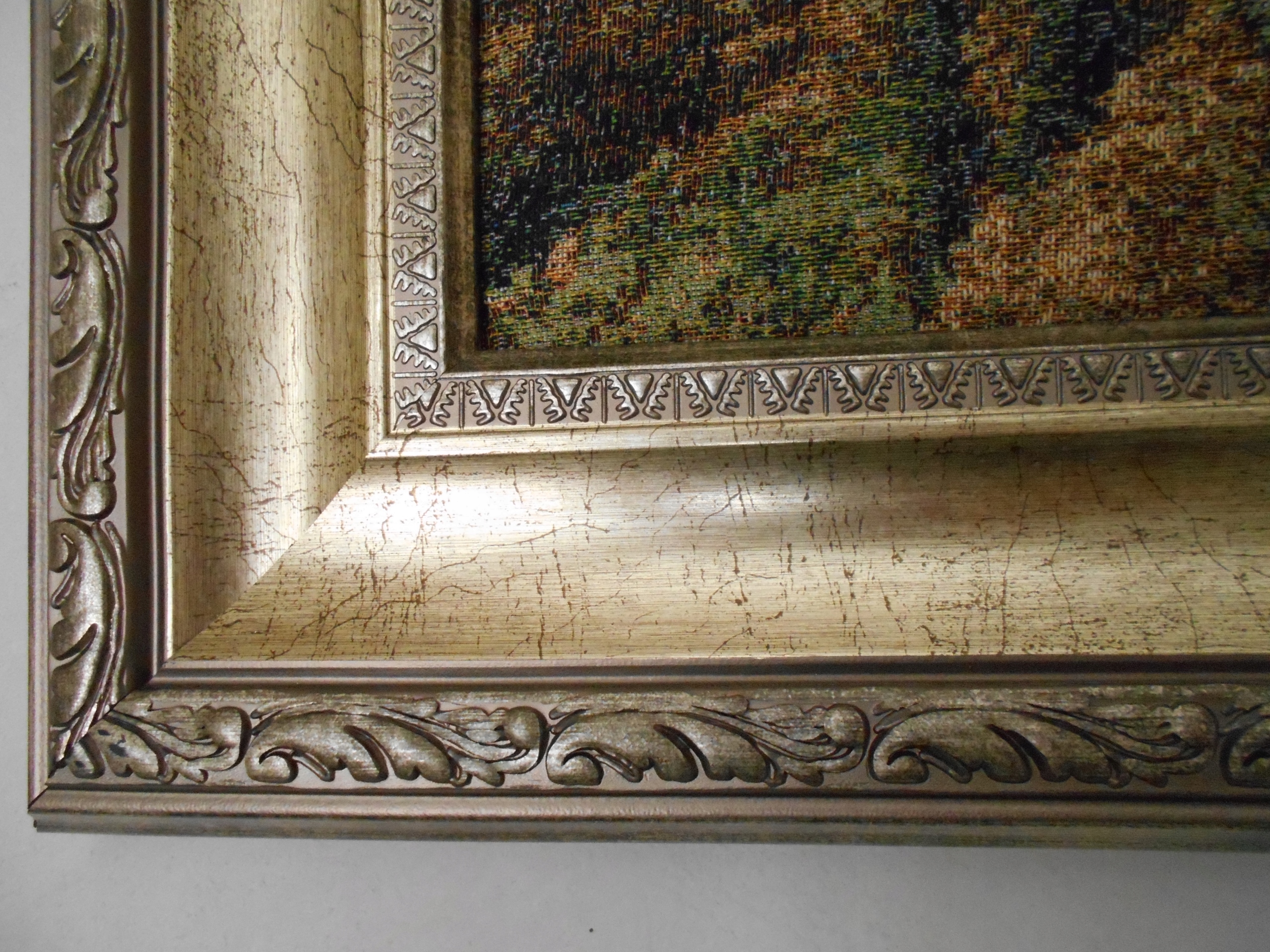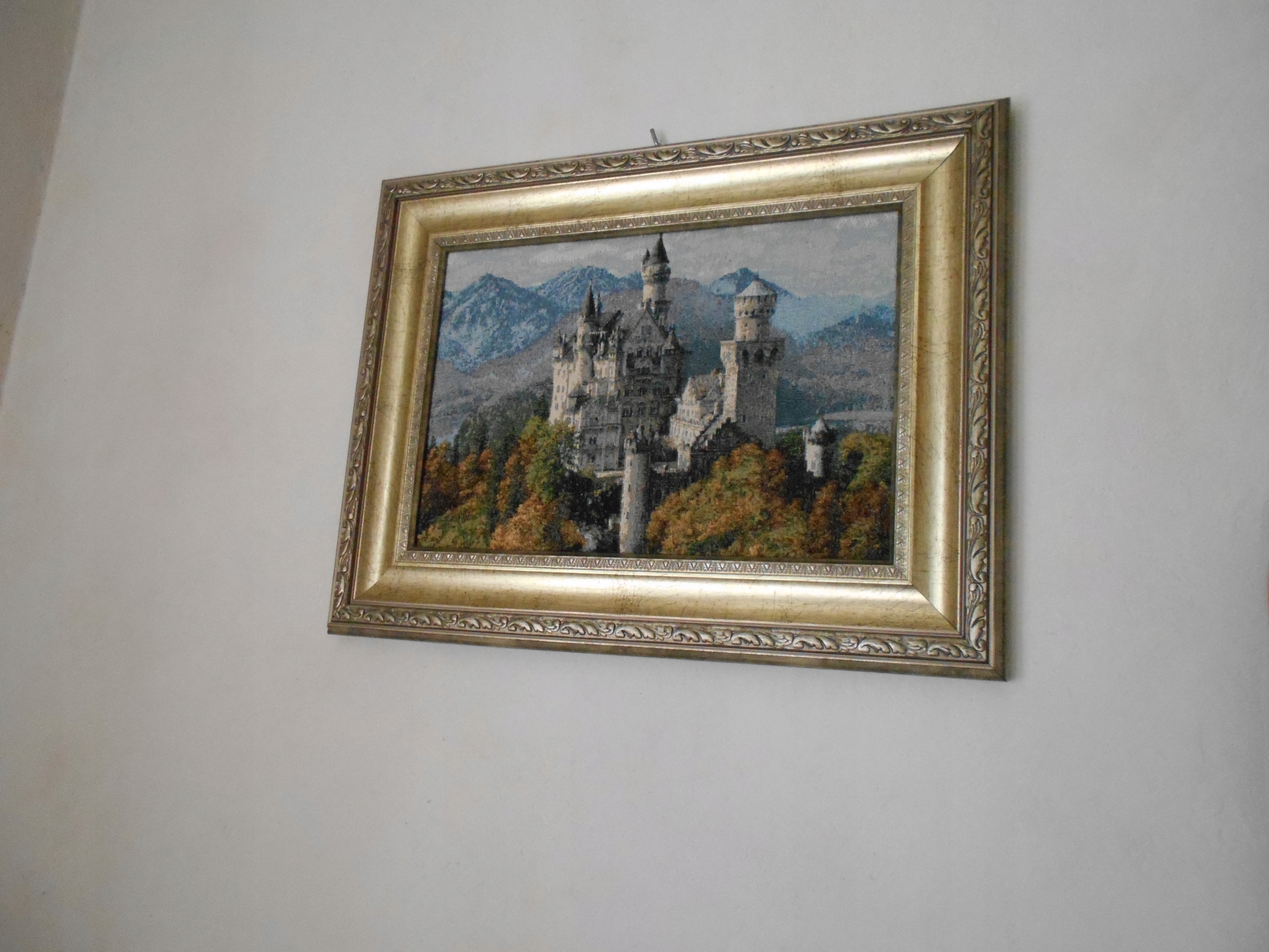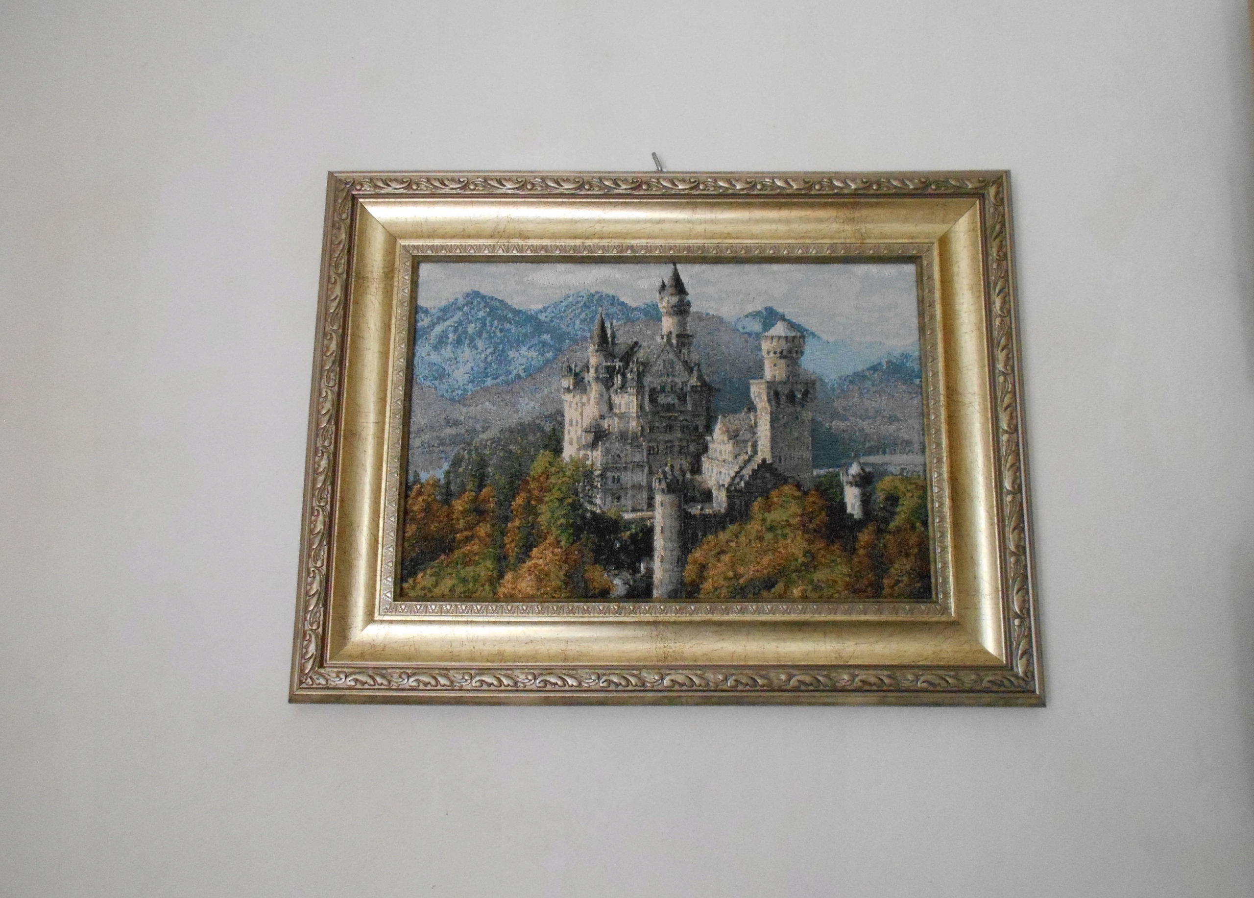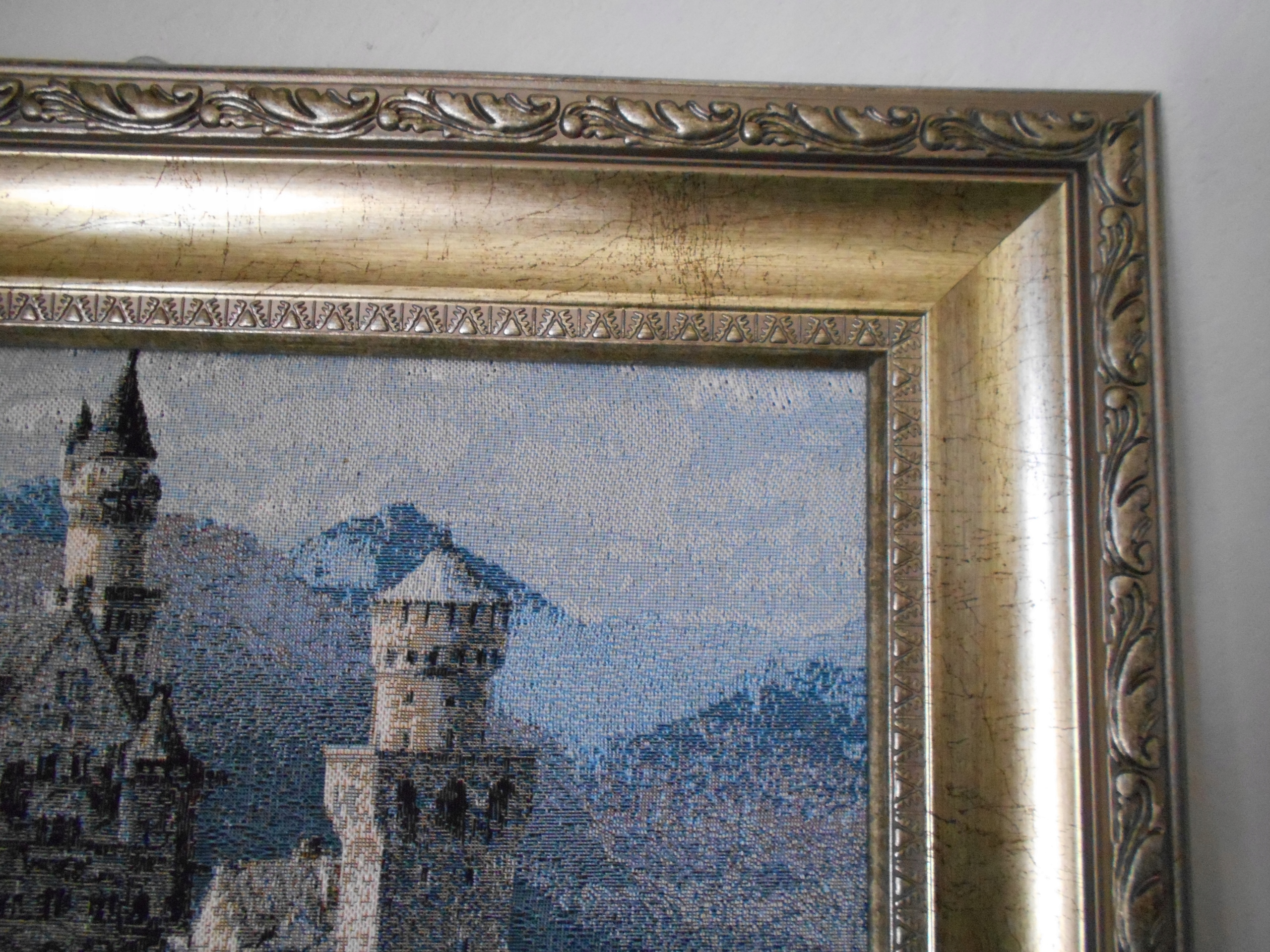 Красивый тканый гобелен в старинной широкой раме. Рамка красиво блестит в зависимости от освещения. На гобелене изображен сказочный замок Нойшванштайн, расположенный в Баварии, Германия. Это один из самых посещаемых замков в мире.