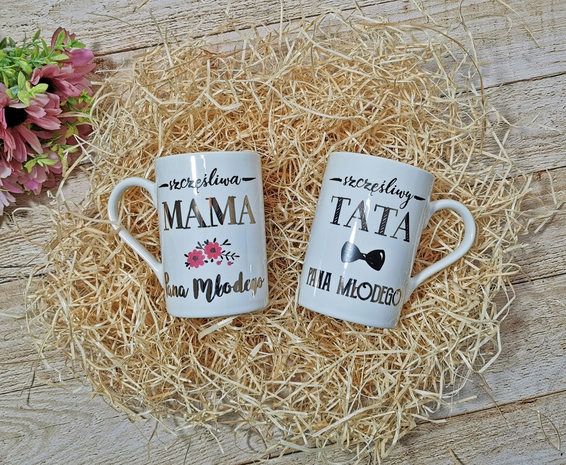 Набор из двух кружек со словами благодарности родителям жениха. На чашках надписи «счастливая мама жениха», «счастливый отец жениха»