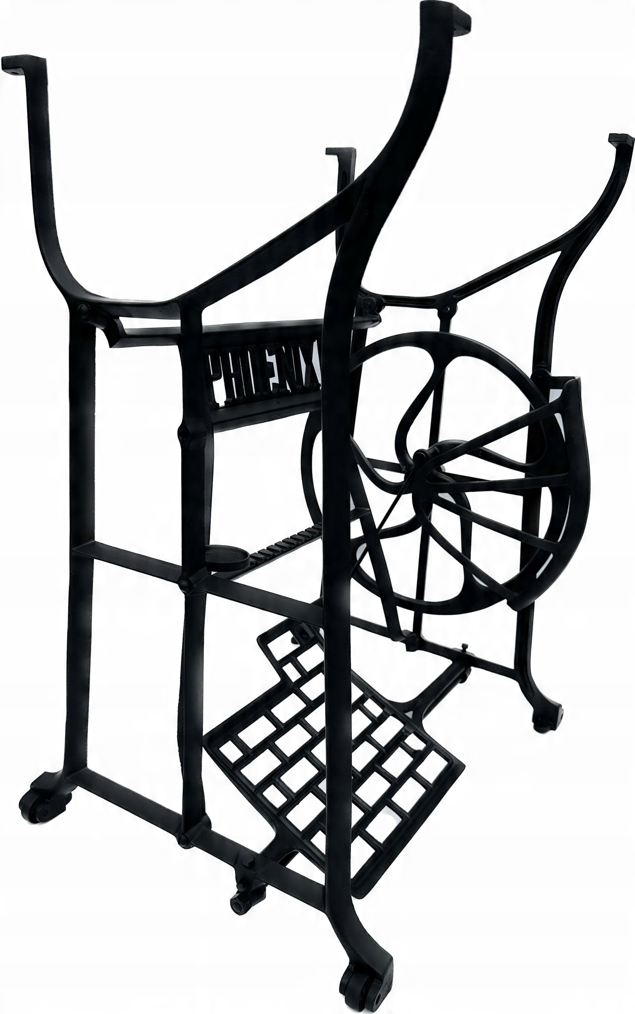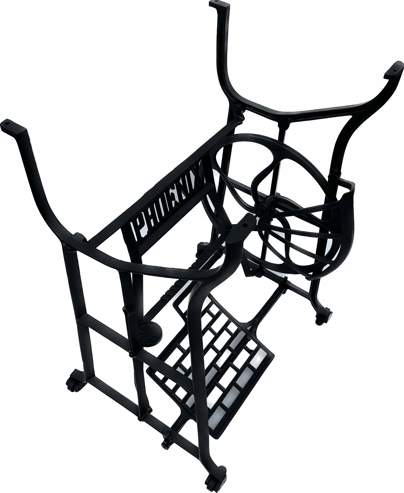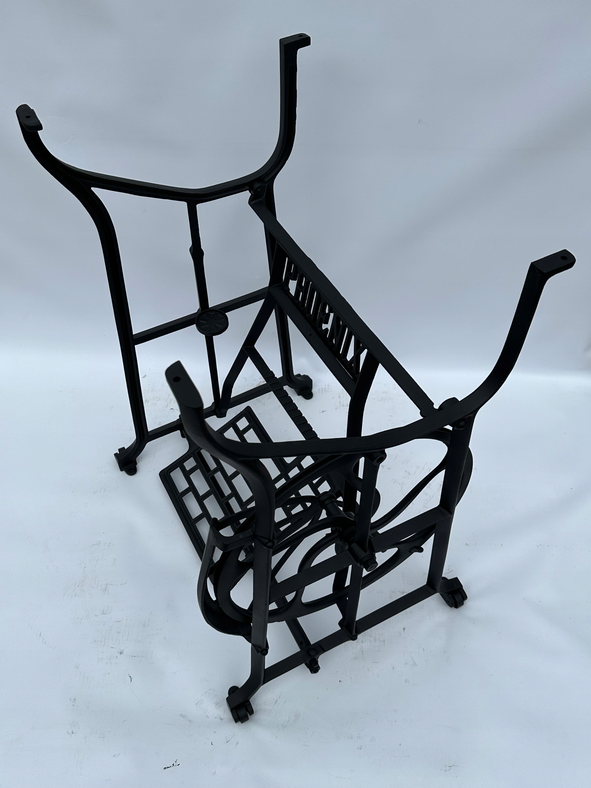 Предмет продажи — старая чугунная основа от швейной машины ФЕНИКС. Очень красивый узор. Посередине надпись с логотипом компании. У него все 4 колеса внизу. Дополнительным преимуществом является металлический элемент, соединяющий колесо с педалью привода, поэтому мы можем быть уверены, что его не съедят деревоеды, что возможно в базах с деревянным элементом.
