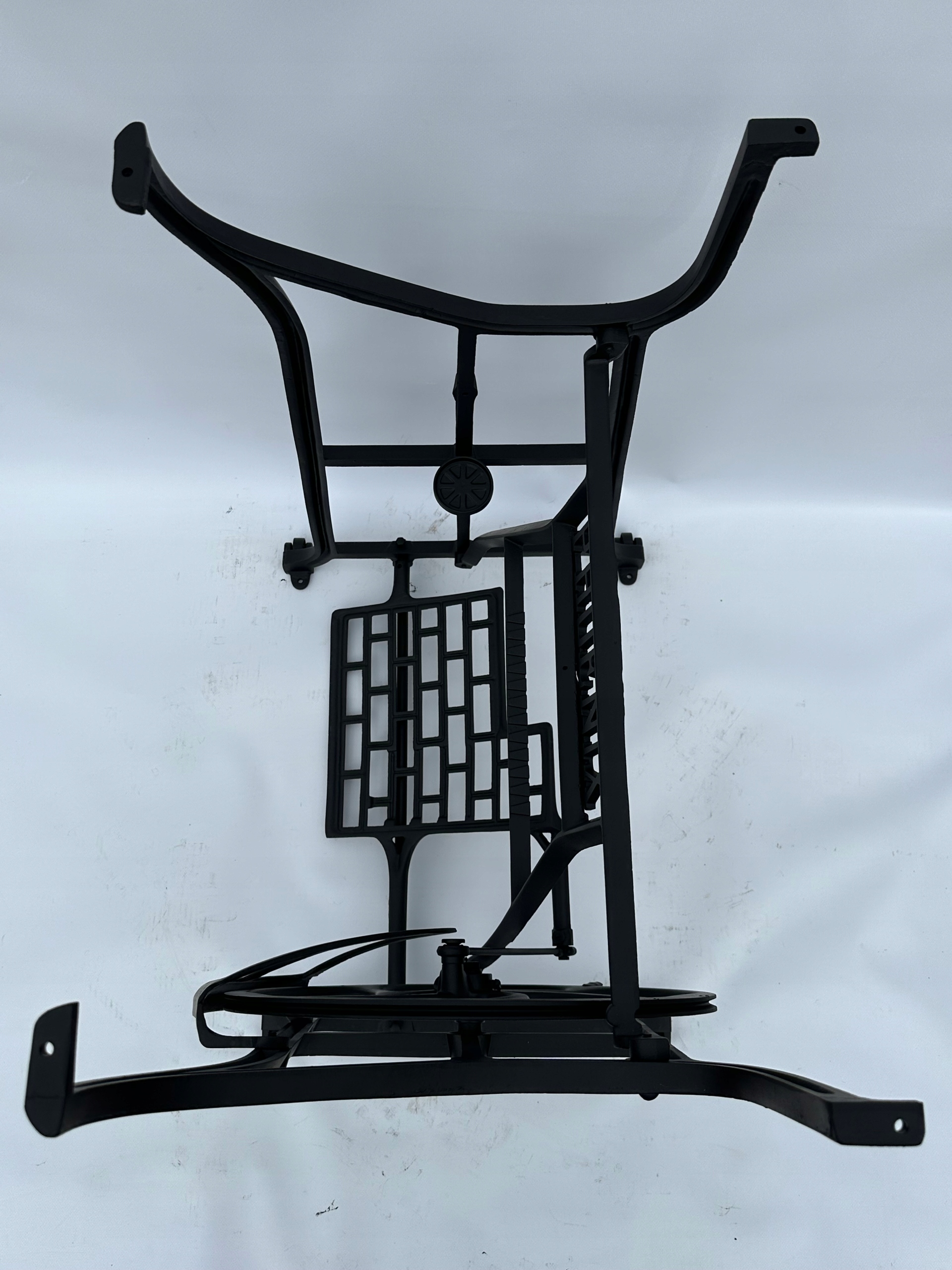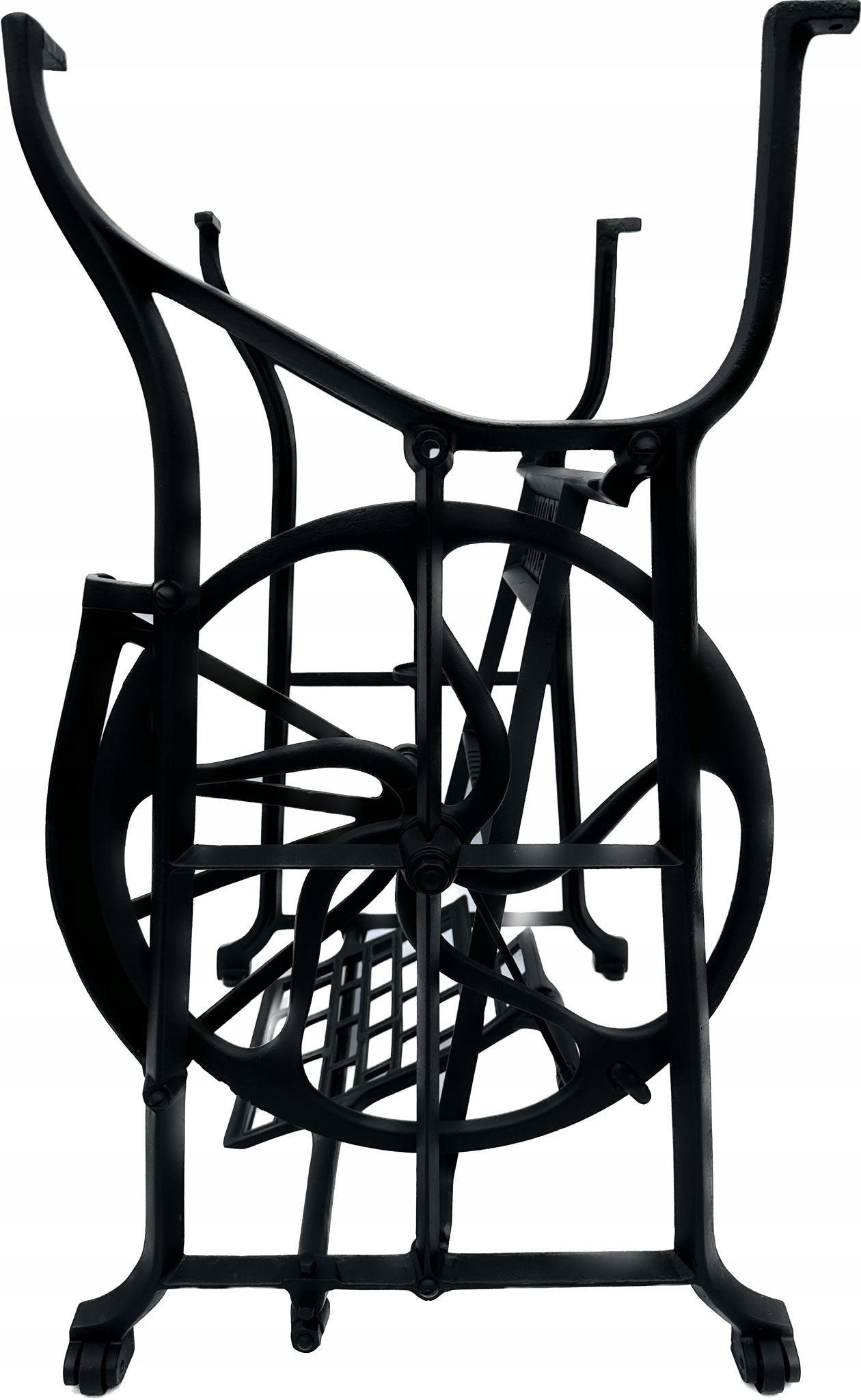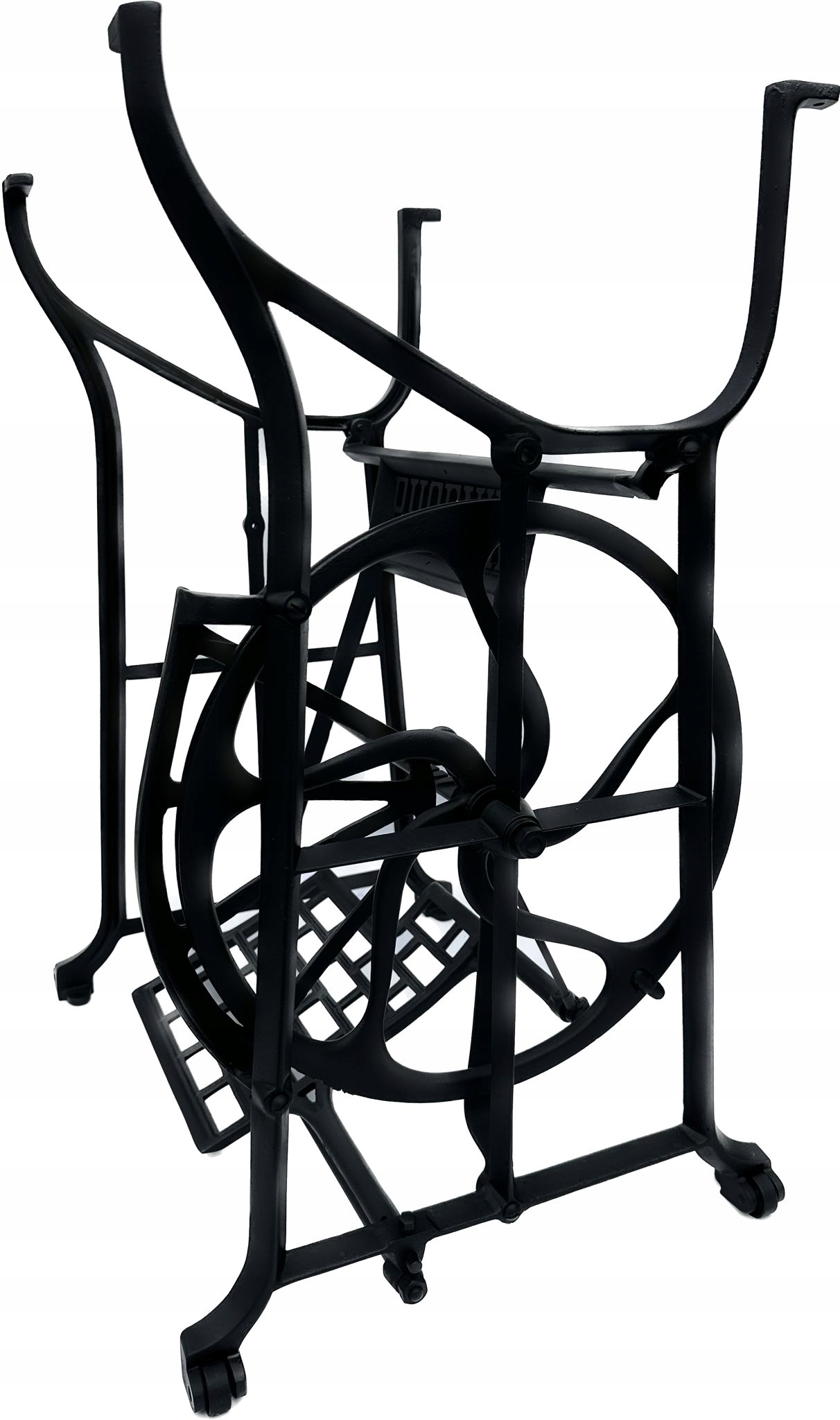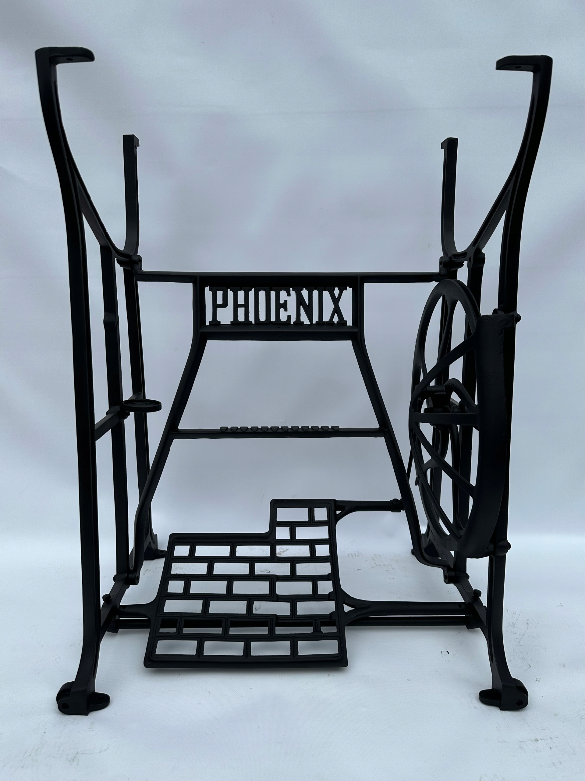 Предмет продажи — старая чугунная основа от швейной машины ФЕНИКС. Очень красивый узор. Посередине надпись с логотипом компании. У него все 4 колеса внизу. Дополнительным преимуществом является металлический элемент, соединяющий колесо с педалью привода, поэтому мы можем быть уверены, что его не съедят деревоеды, что возможно в базах с деревянным элементом.