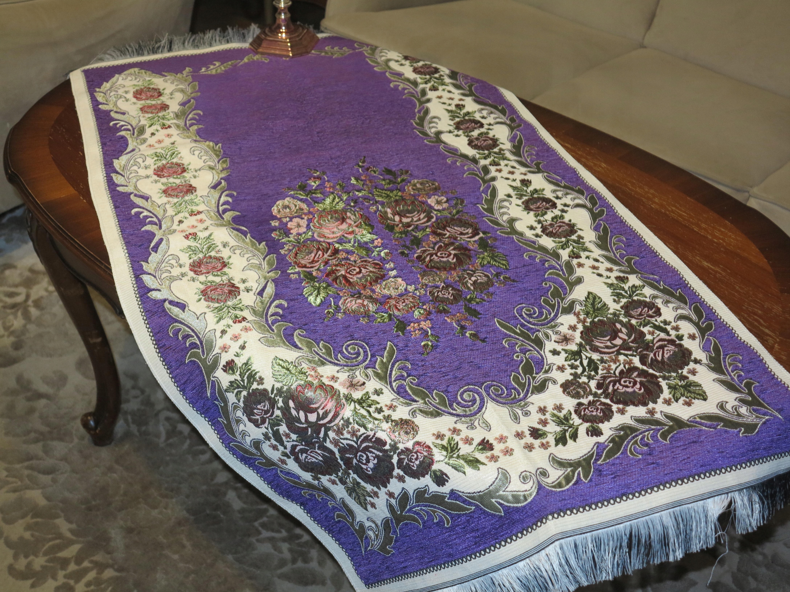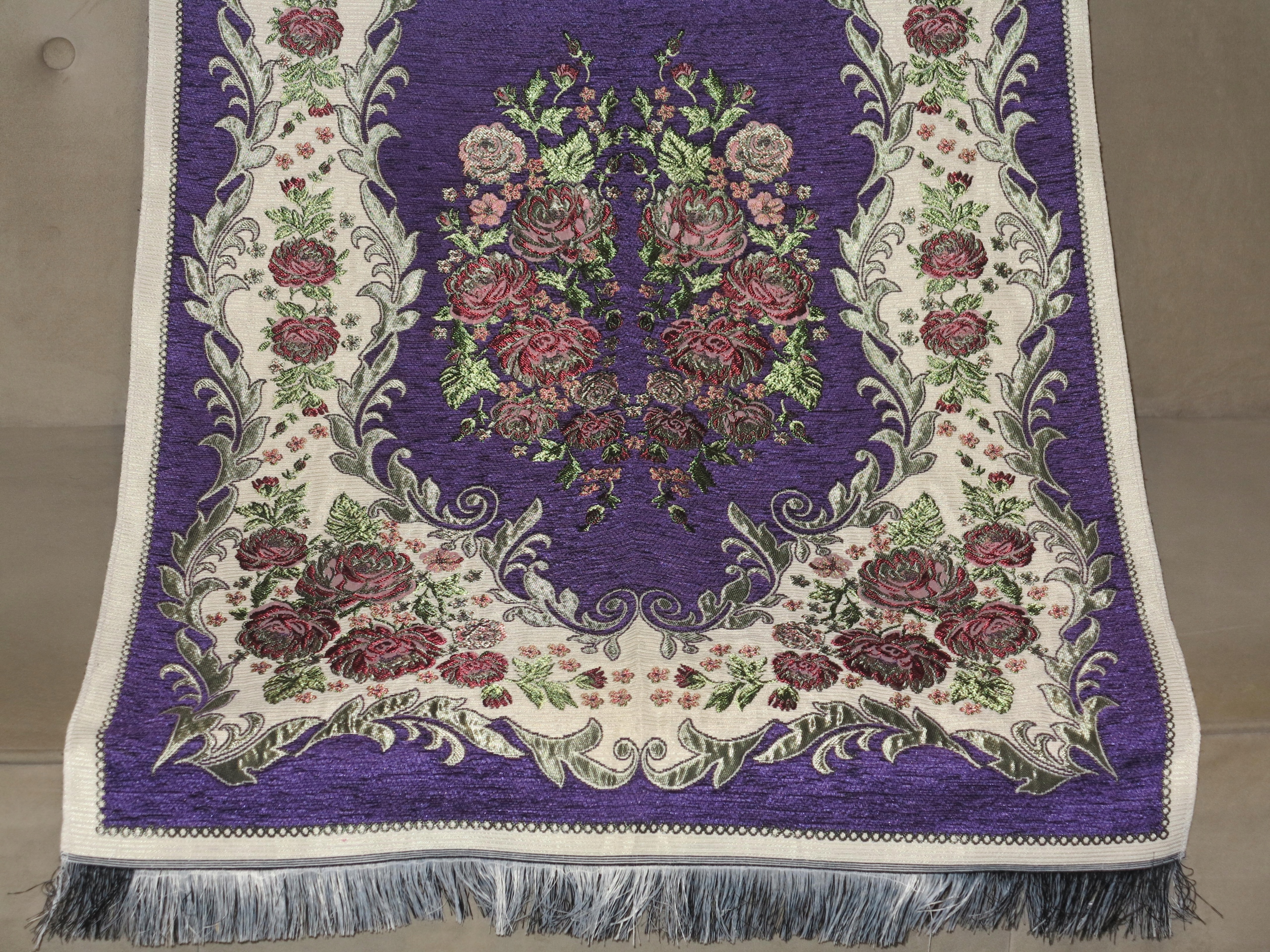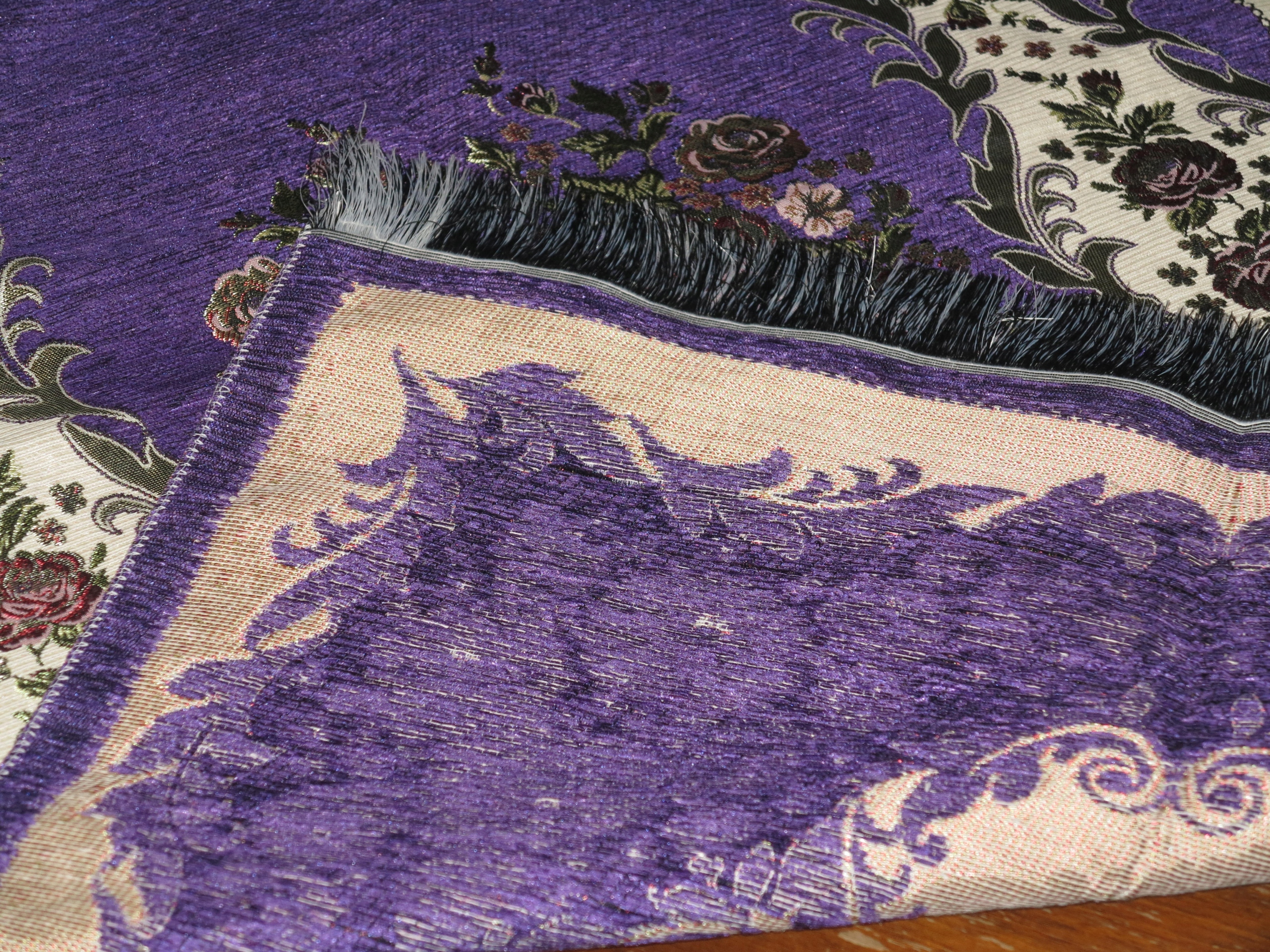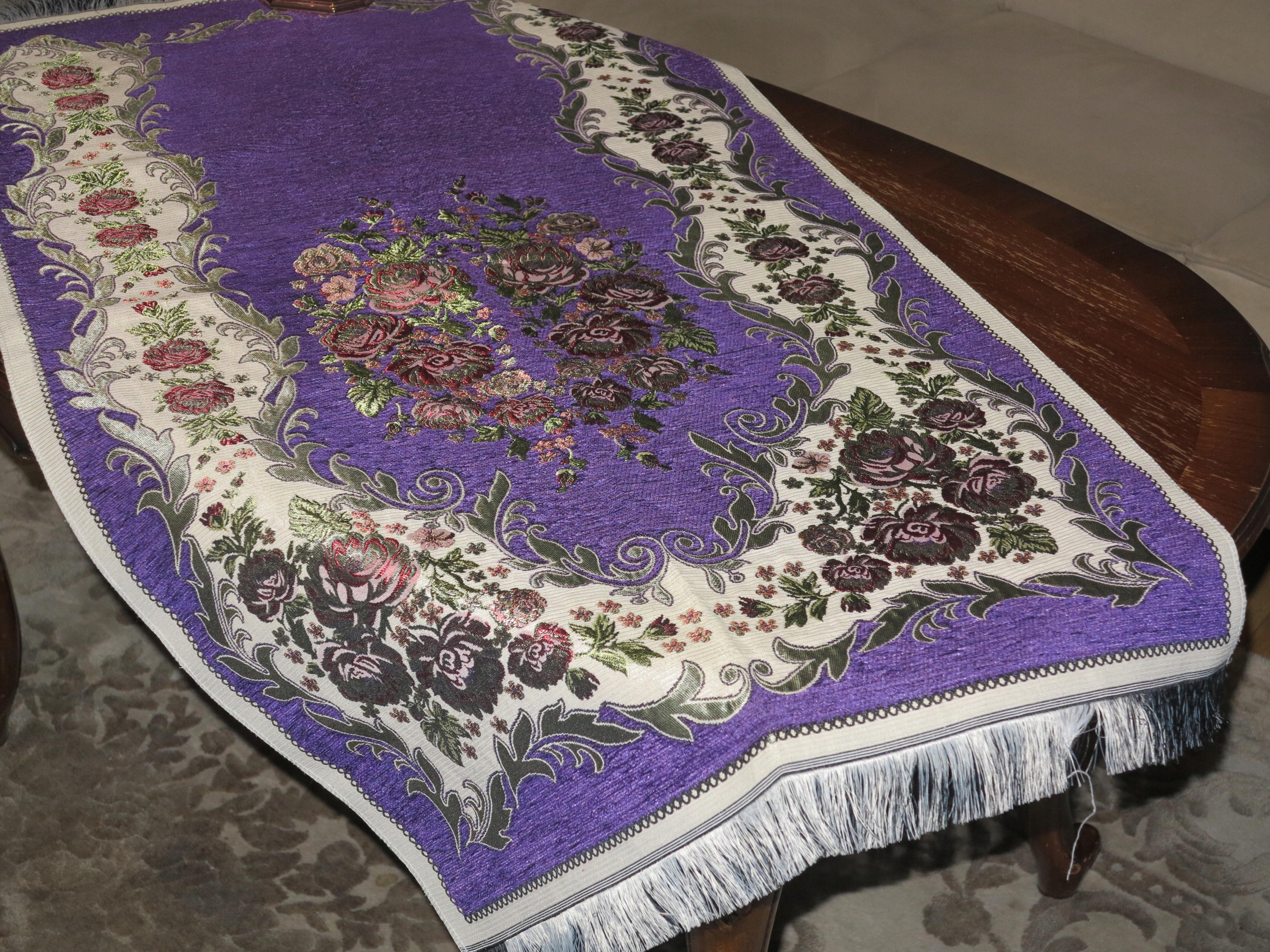 КРАСИВУЮ СТИЛЬНУЮ СТИЛЬНУЮ СКАТЕРЬ-КИЛИМ ГОБЕЛЕН ИЗ ТКАНИ ПОД ШИНЕЛЬ-БАРХАТ. С ЧРЕЗВЫЧАЙНО ДЕКОРАТИВНЫМИ УЗОРАМИ. ЦВЕТ СЛИВЫ. Густая бахрома с обеих сторон