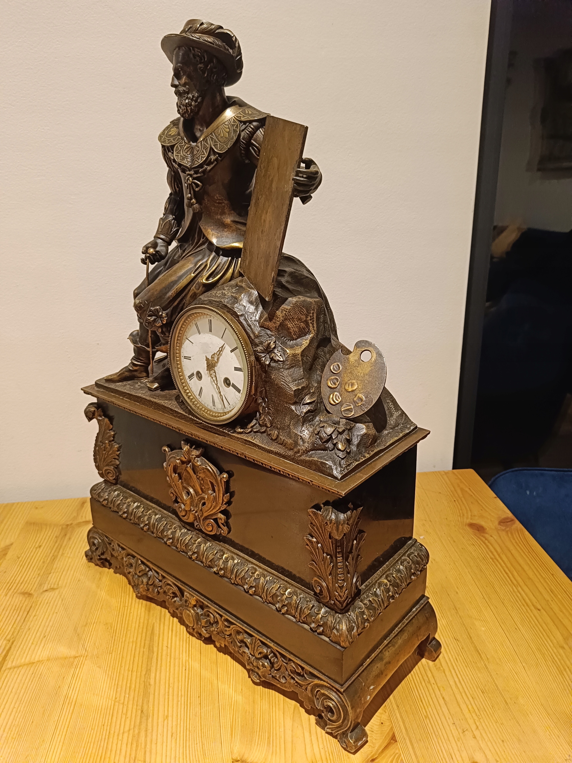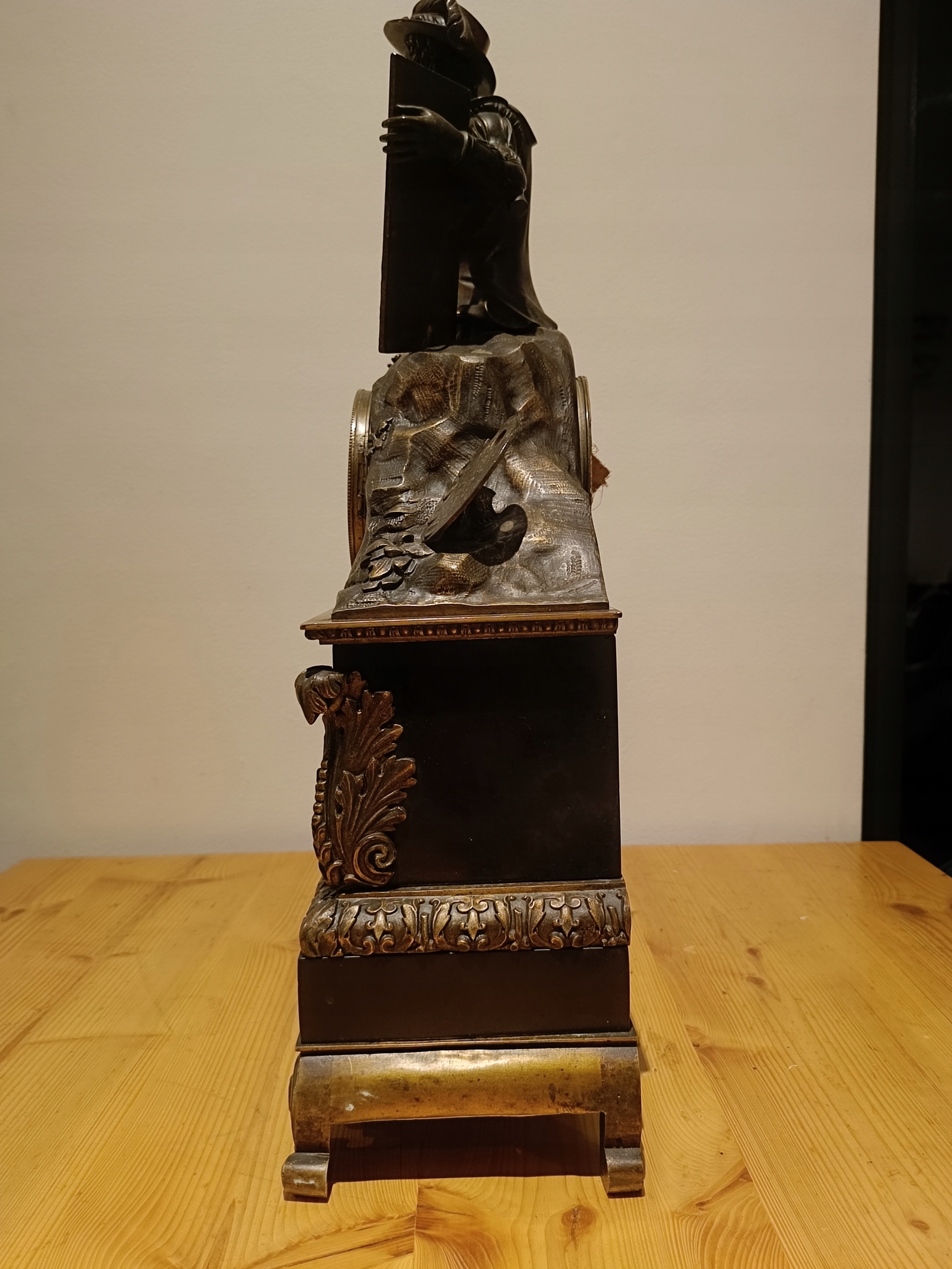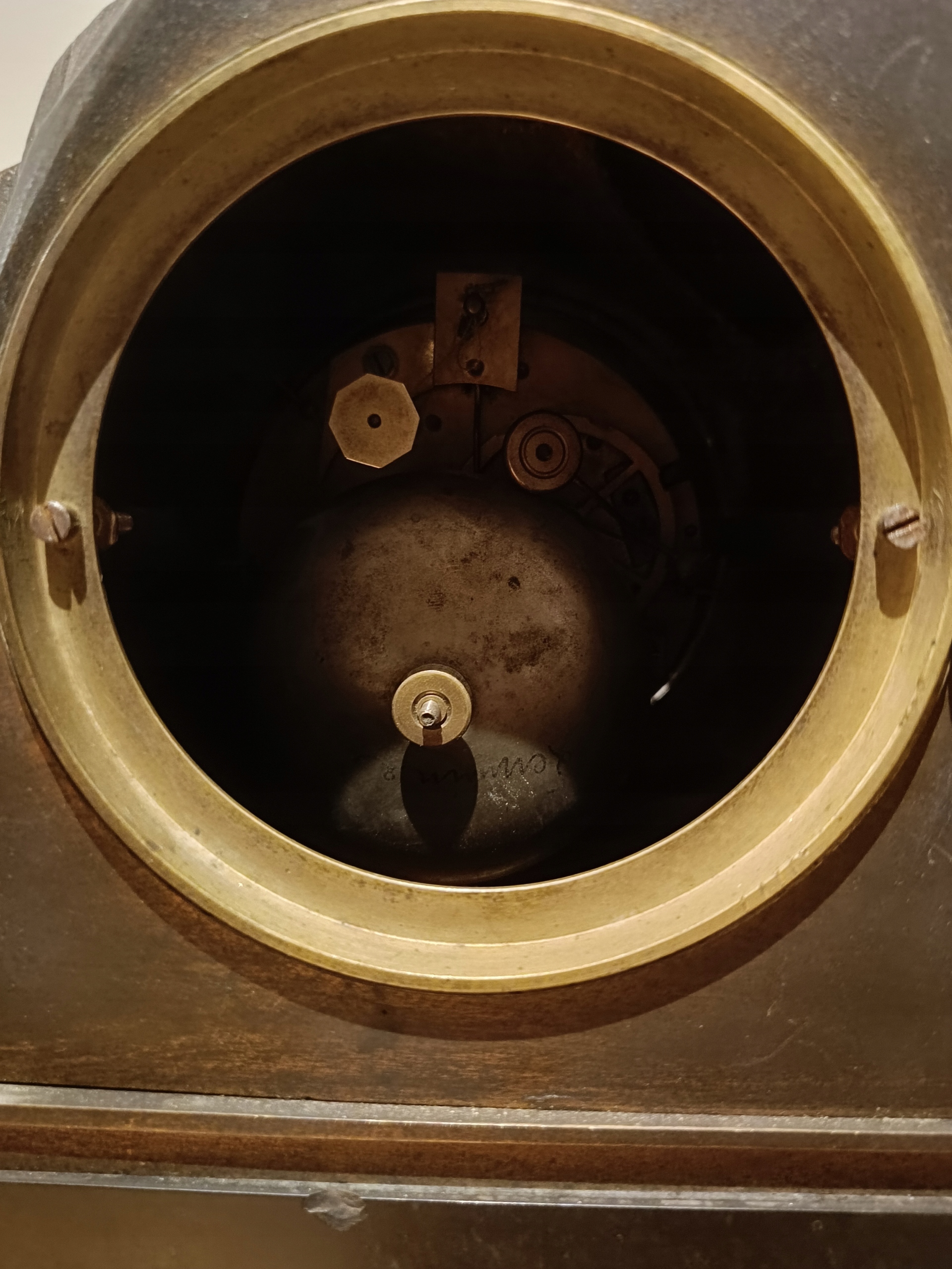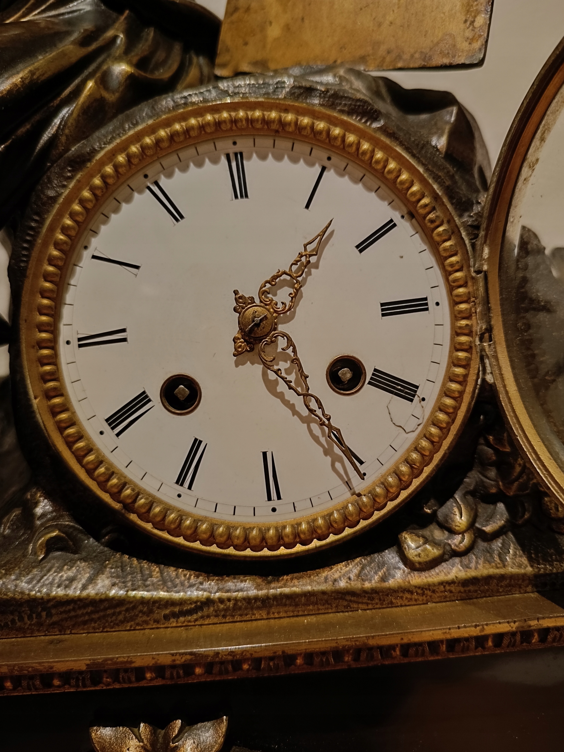 Часы выполнены из бронзы и мрамора. Механизм работает, в сборе и в очень хорошем состоянии, отбивает часы и полчаса. Фарфоровый циферблат механизма в очень хорошем состоянии - минимальный дефект в районе 5 часов. Маятник и ключ в комплекте.