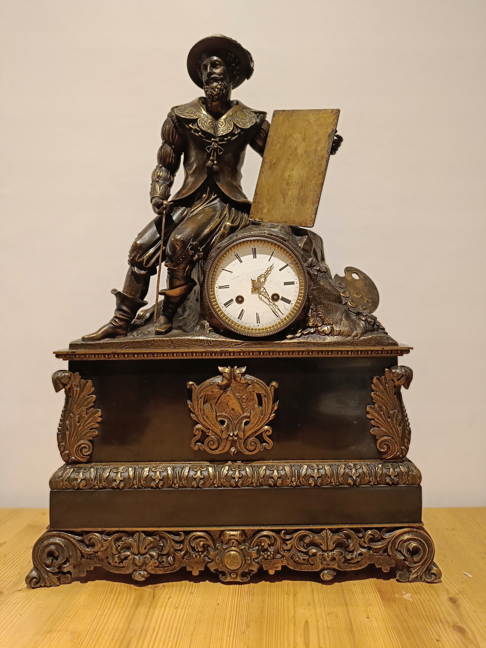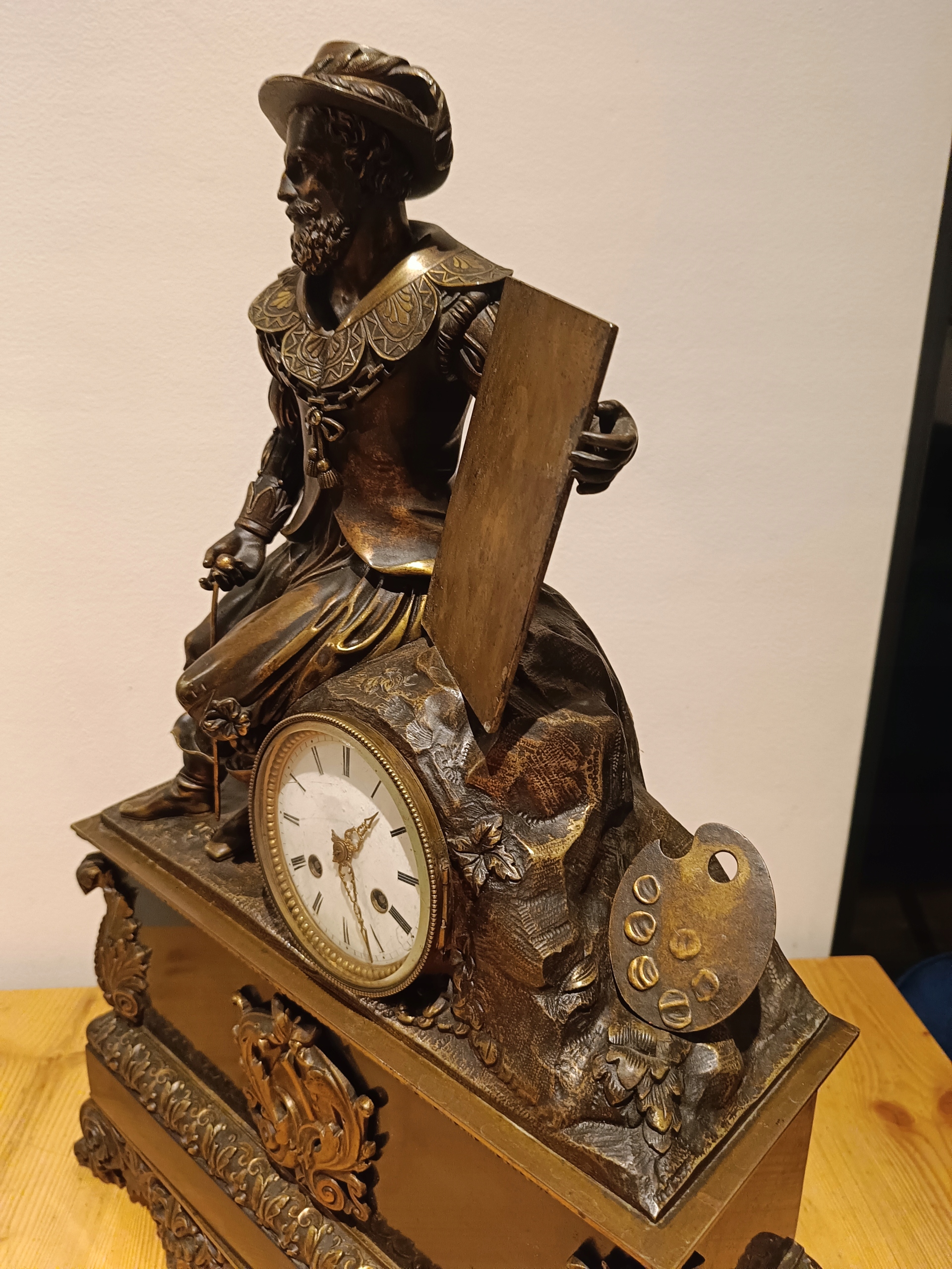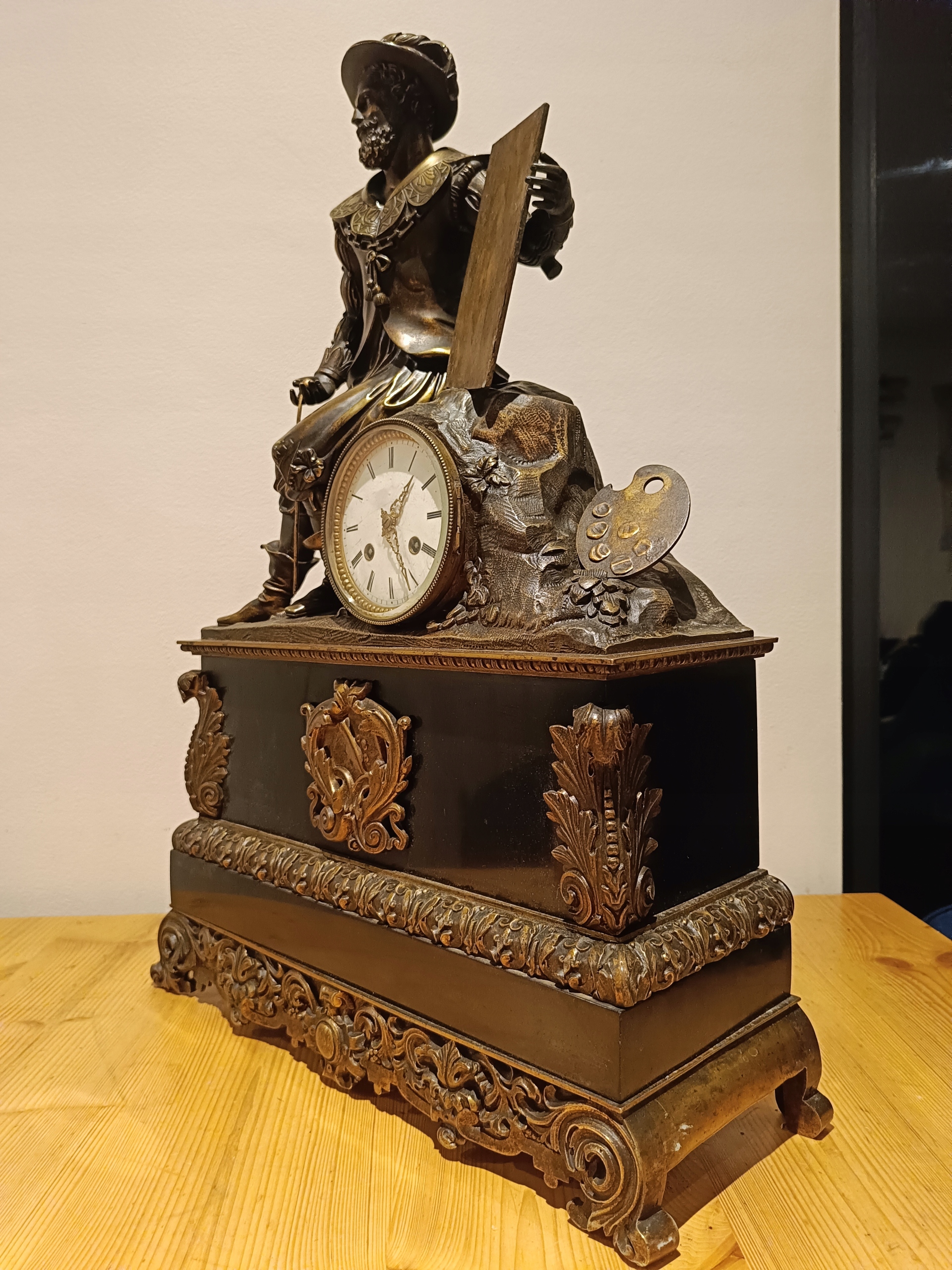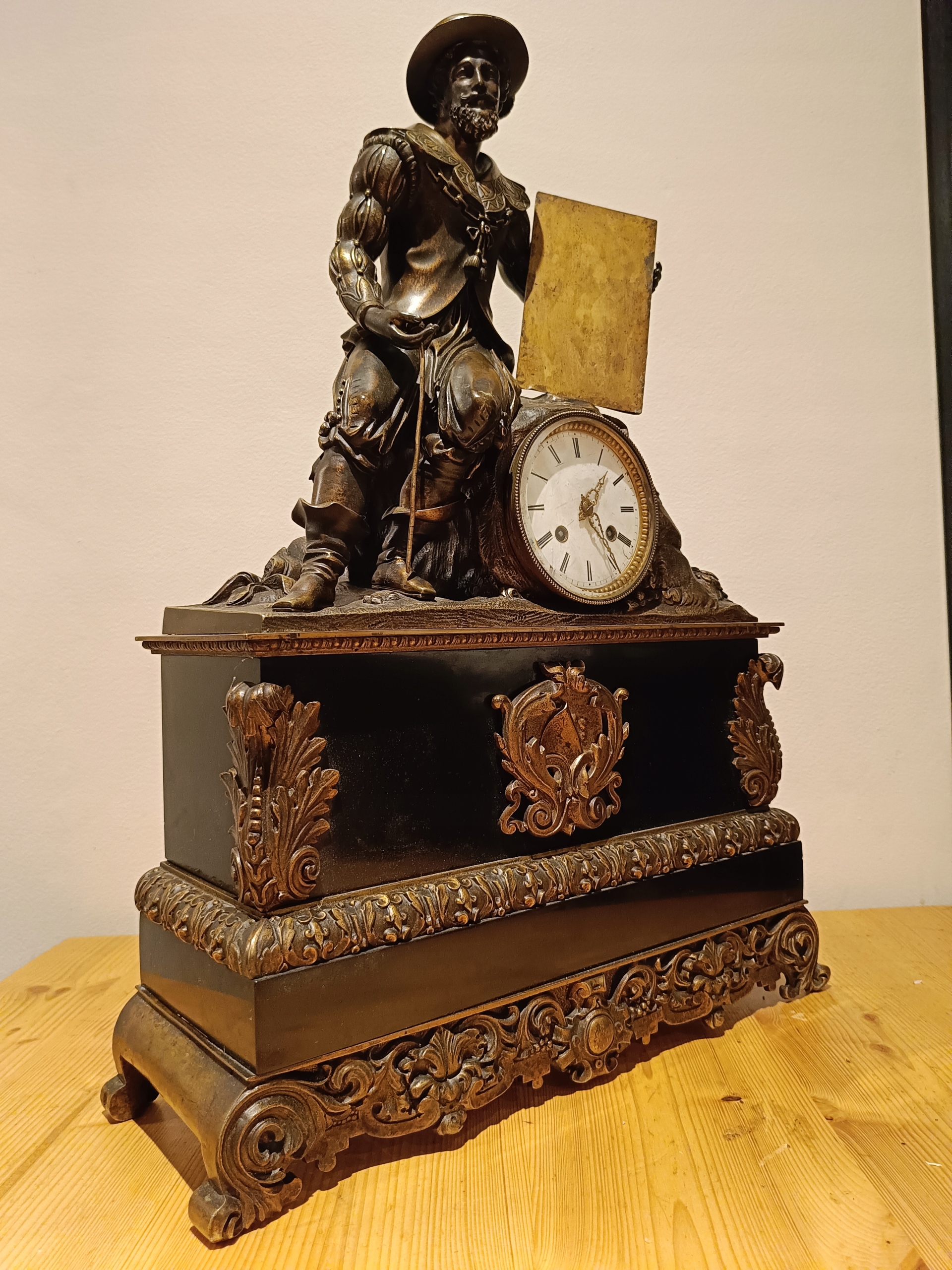 Часы выполнены из бронзы и мрамора. Механизм работает, в сборе и в очень хорошем состоянии, отбивает часы и полчаса. Фарфоровый циферблат механизма в очень хорошем состоянии - минимальный дефект в районе 5 часов. Маятник и ключ в комплекте.