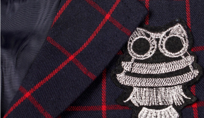 Куртка в одних и тех же цветах на подкладке, куртка, прикрепленная кнопкой. Он имеет приложения сшитых совы.