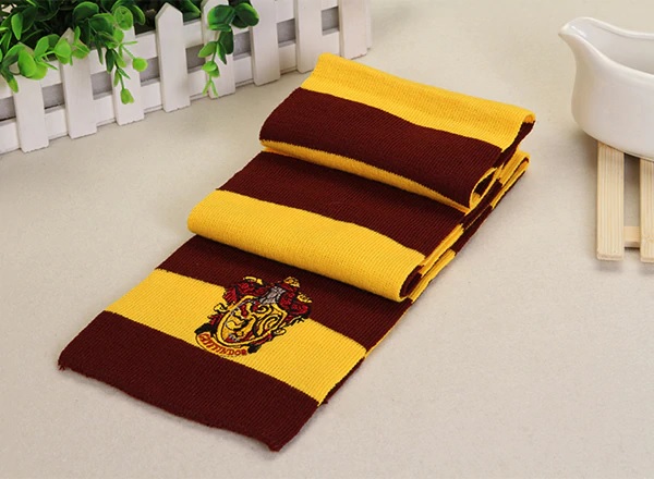 - Шарф в желтые и бордовые полосы с гербом школы Гриффиндора