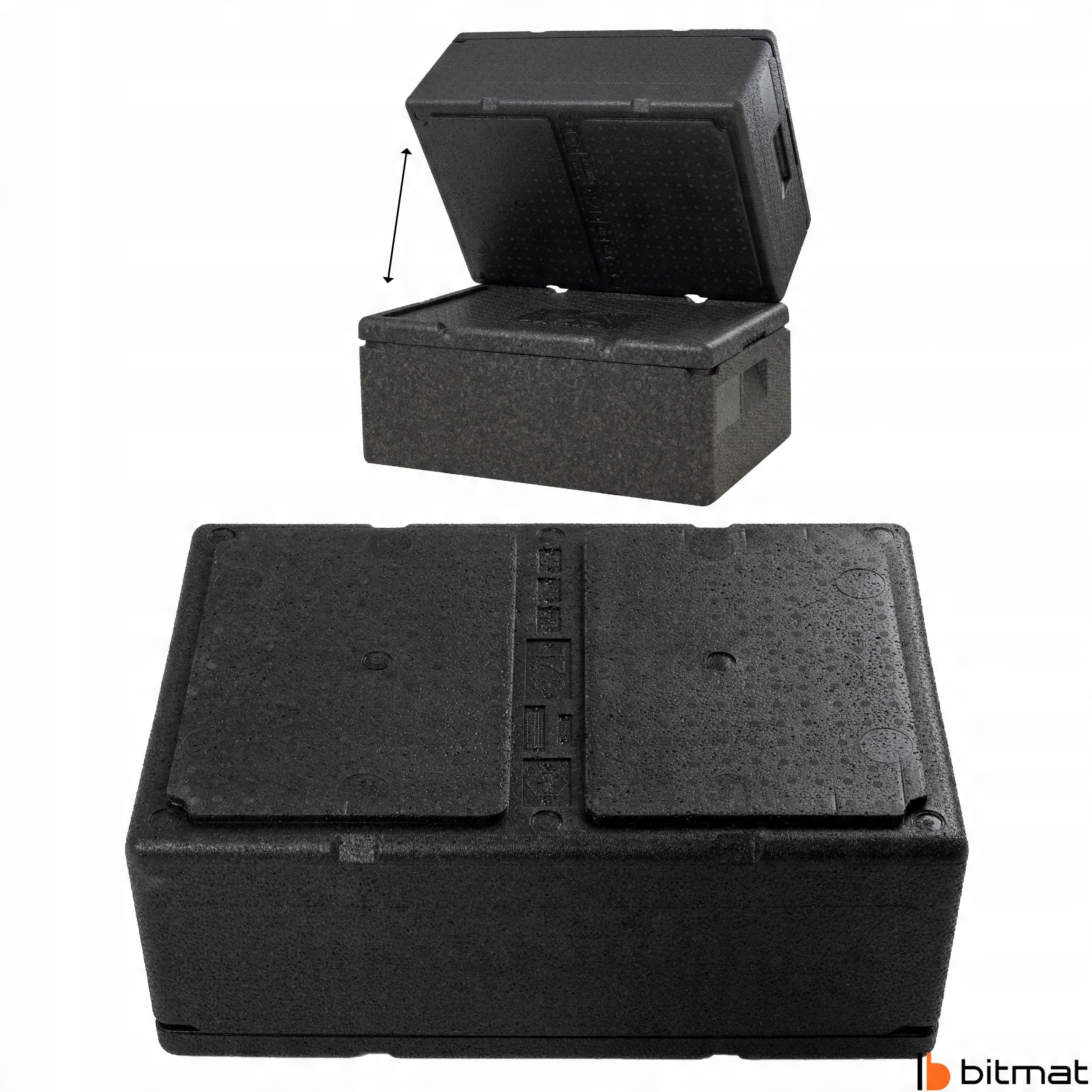 Современный термобокс 48 л представляет собой термоизоляционный контейнер размерами 60×40×23 см, изготовленный из легкого и прочного пиоцелана – современного материала, устойчивого к истиранию, химическим веществам и механическим повреждениям. Благодаря соответствующей структуре материала контейнер эффективно изолирует тепло и холод, а его конструкция позволяет осуществлять безопасную штабелирование (штабелирование).