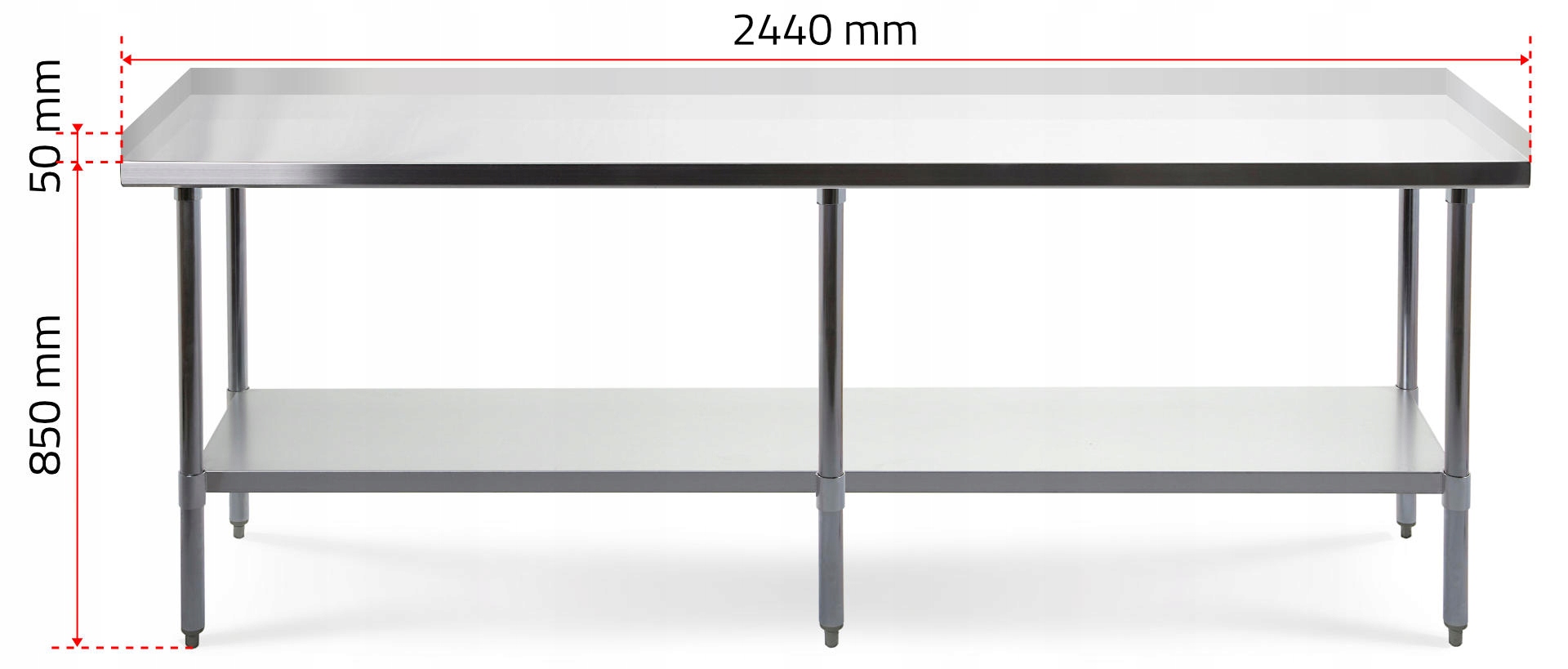 СТОЛЕШНЯ РАБОЧЕГО СТОЛИКА ИЗ НЕРЖАВЕЮЩЕЙ С ПОЛКОЙ, 3 ДИАПАЗОНА (ВОДОНЕПРОНИЦАЕМЫЙ НА СТЕНЕ И БОКОВИНАХ), 2400 x 700 x 850 мм