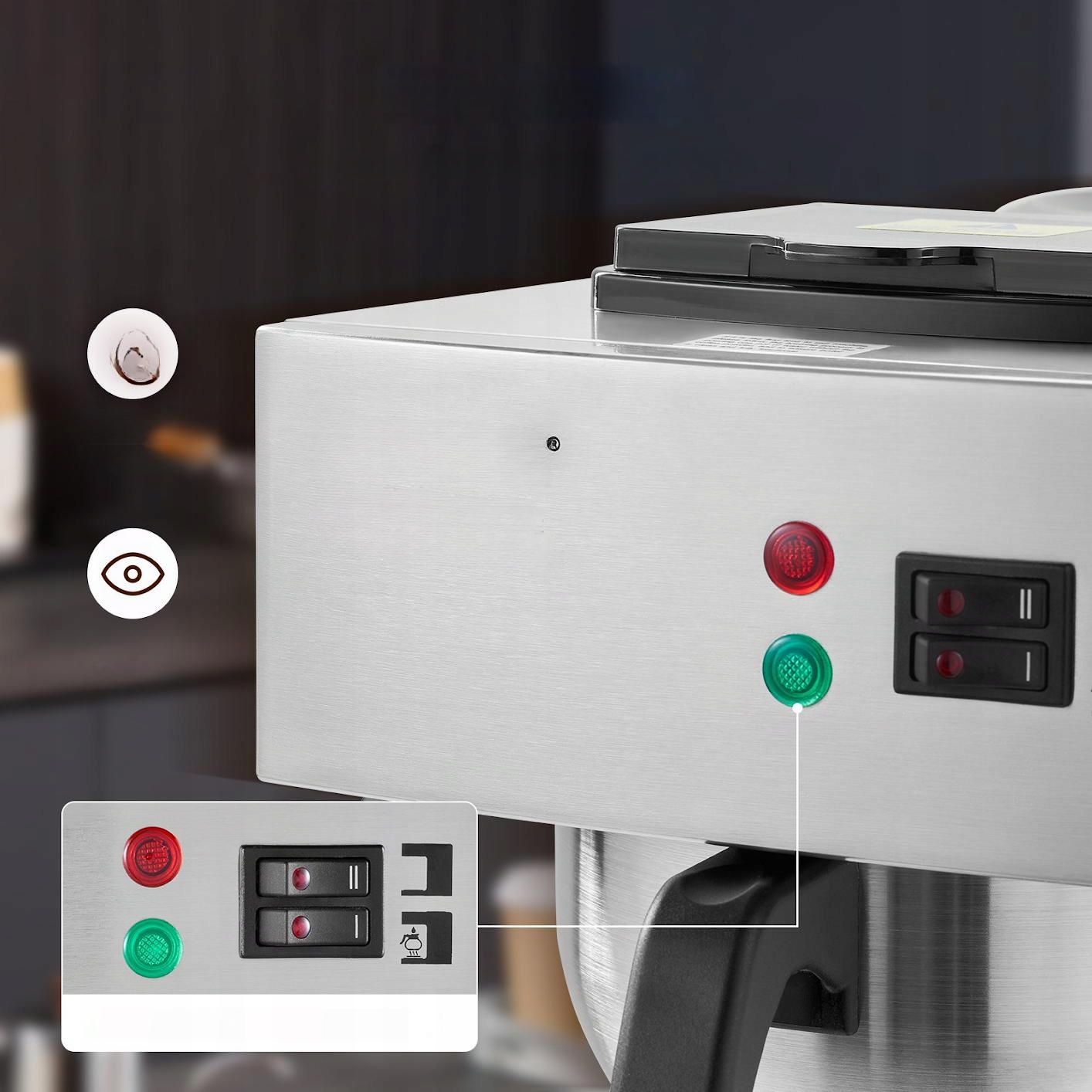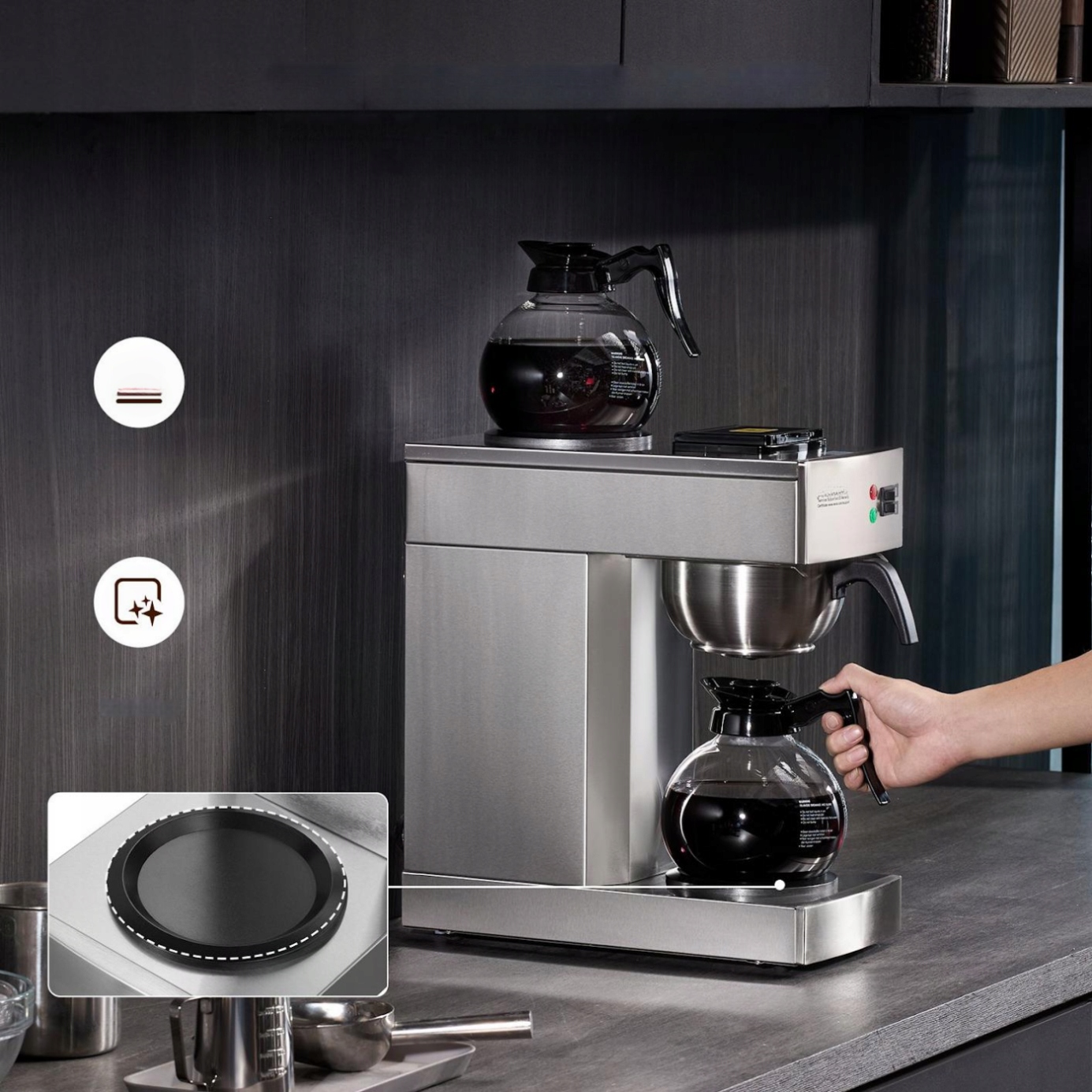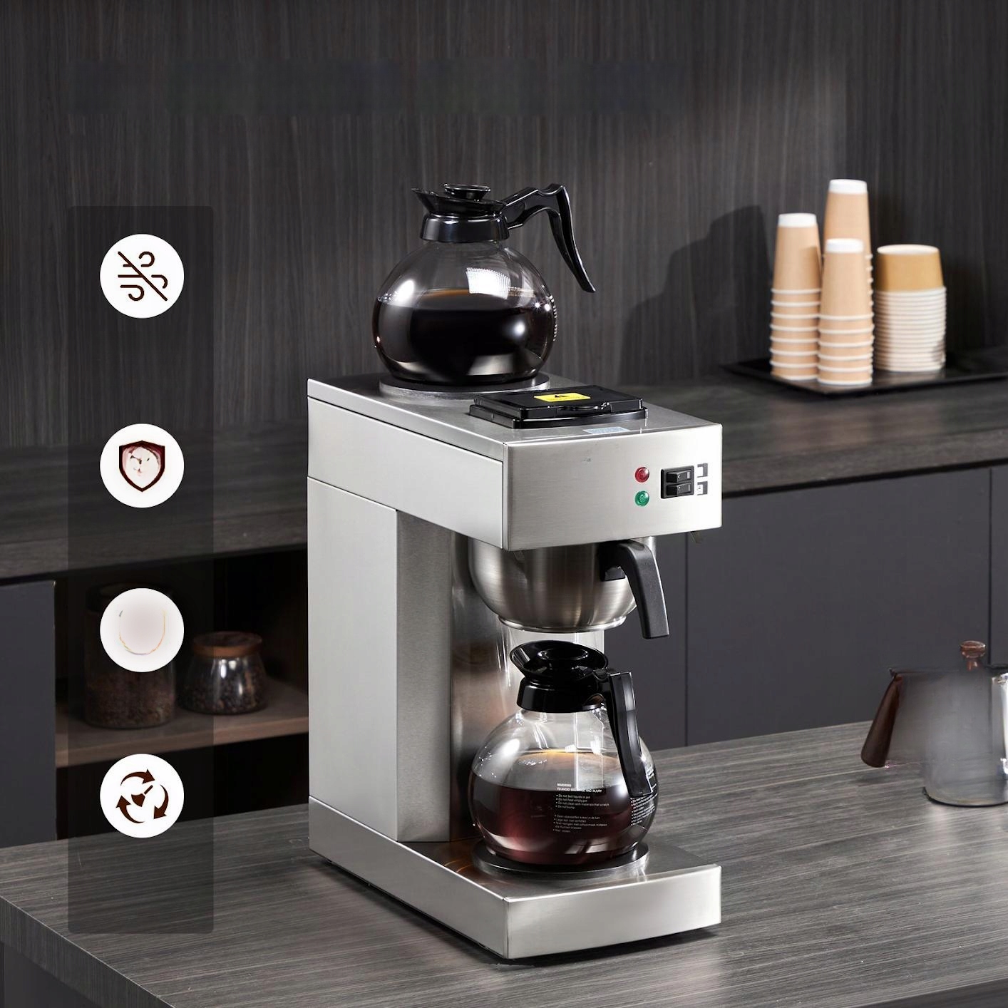 - ✅ поддержка тепла: оснащена 2 нагревающими пластинами и 2 стеклянных кувшин, обеспечивает горячий кофе в течение длительного времени.