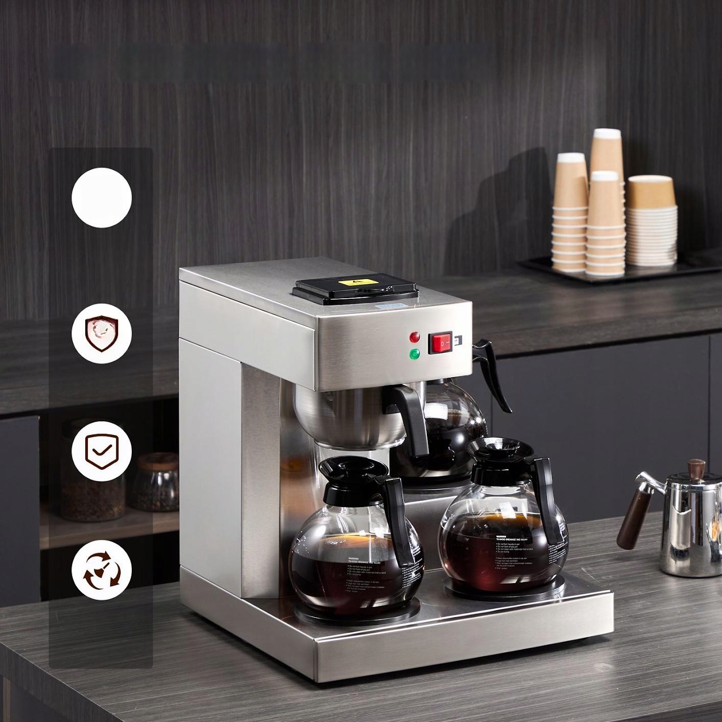 - ✅ поддержка тепла: оснащен 3 нагревательными пластинами и 3 стеклянных кувшин, всегда обеспечивает горячий кофе.