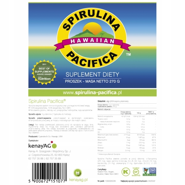 - Гавайская спирулина Pacifica имеет международные сертификаты качества (в том числе ISO9002 и сертификат кошерности) и сертификаты безопасности использования.