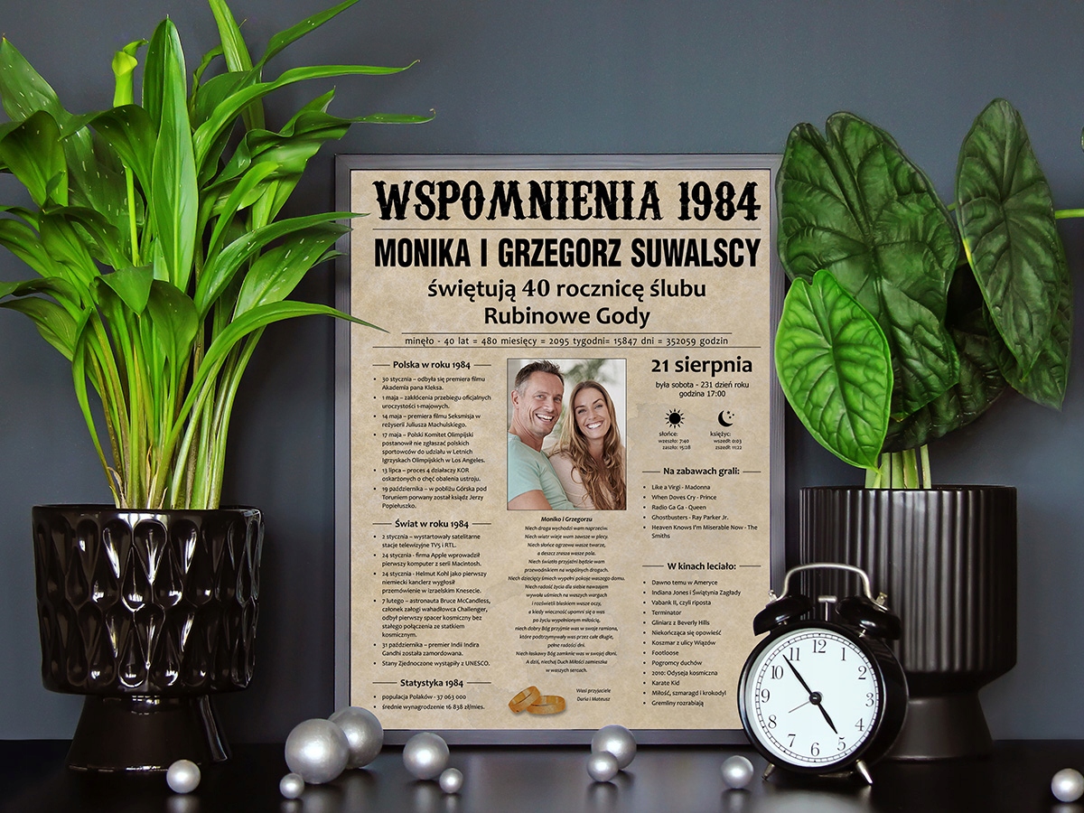 Вы можете рассказать о том, что произошло в этот особенный год, просто и эффективно. Важные события в Польше и мире, музыкальные хиты и популярные фильмы делают плакат интересным путешествием во времени и уникальным сувениром, который, несомненно, вызовет эмоции получателя.