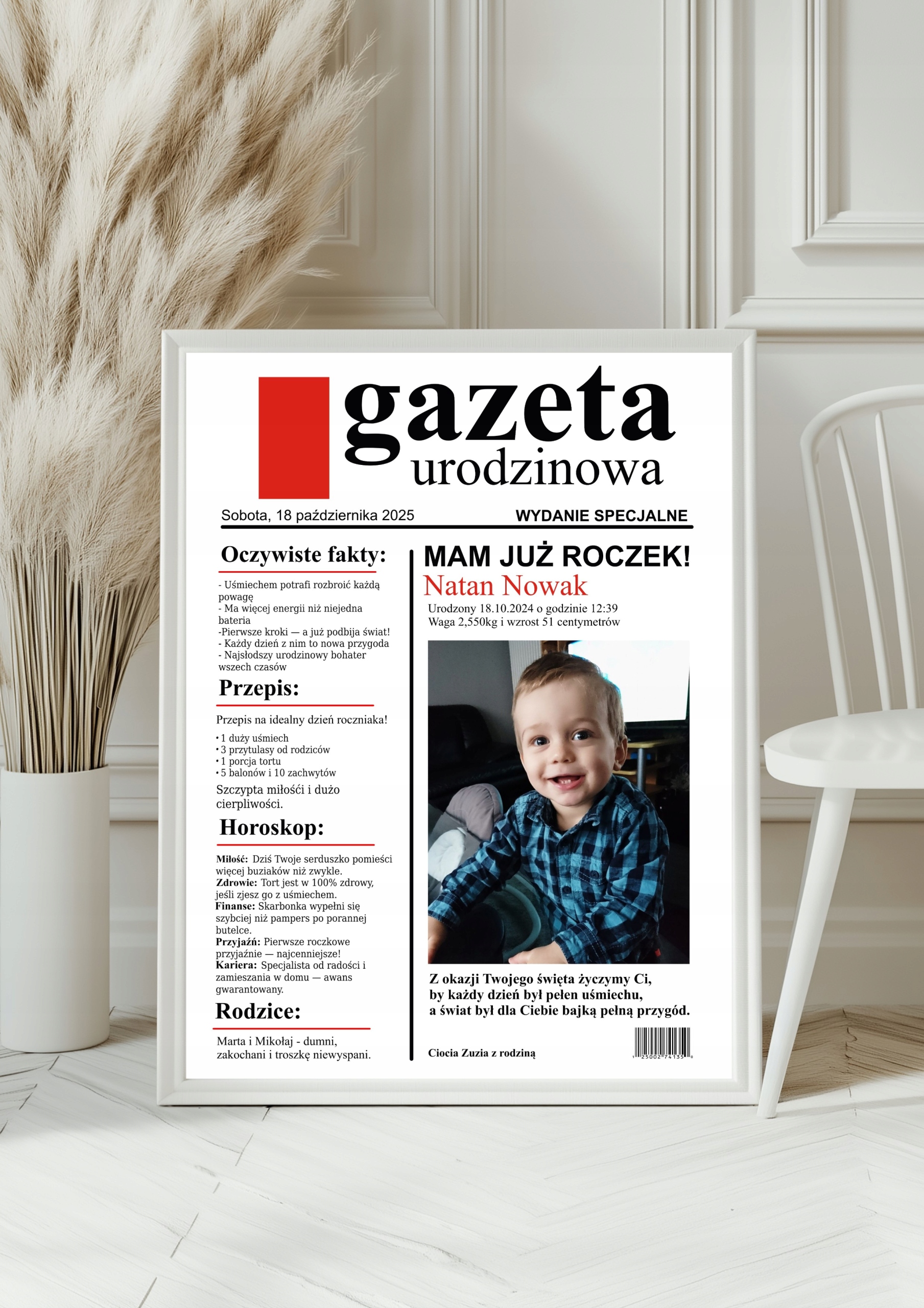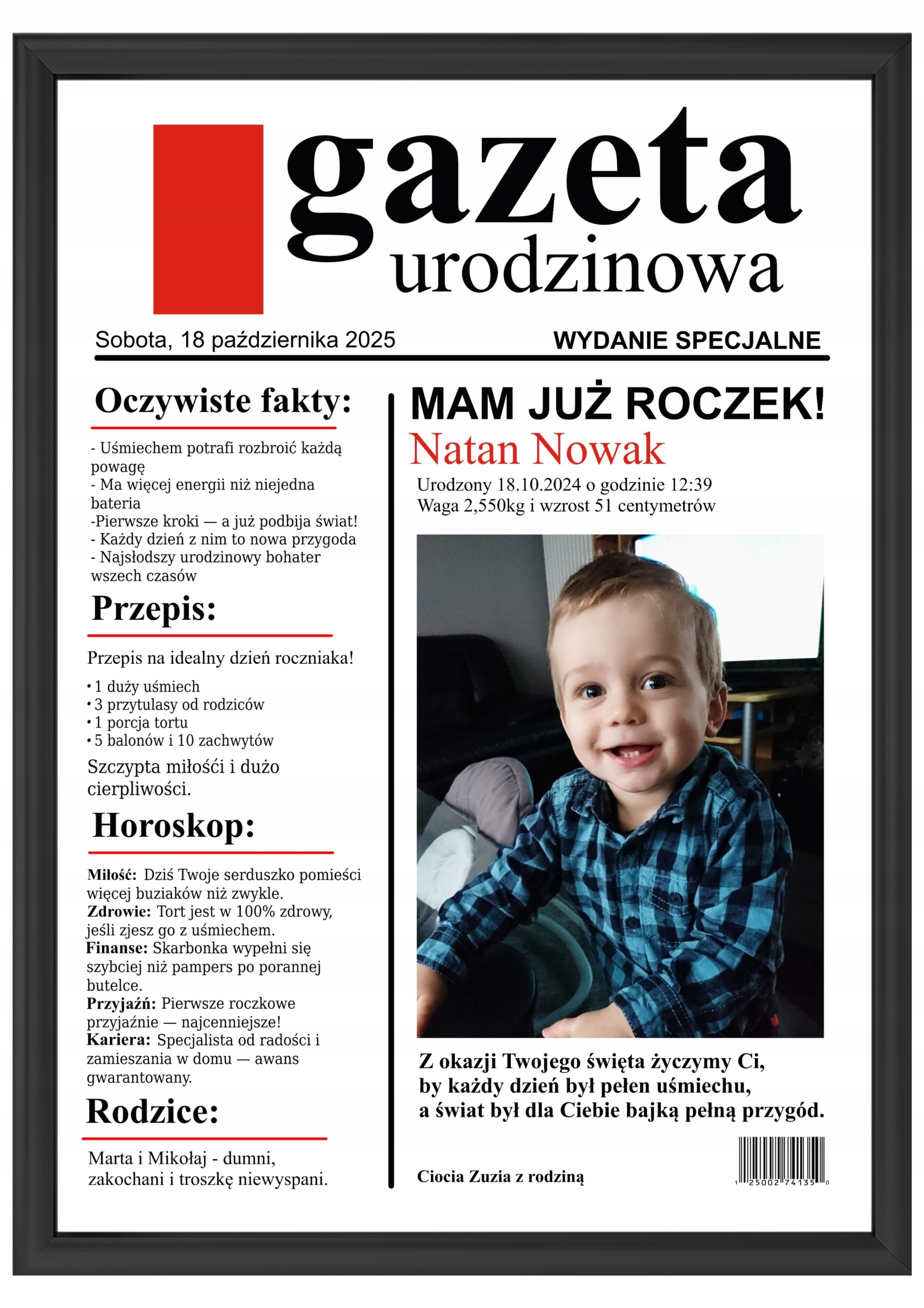 ПОДАРОК ОДИН ГОДОВОЙ ДЕНЬ РОЖДЕНИЯ ГАЗЕТНЫЙ ПЛАКАТ 30X40 РАМКА