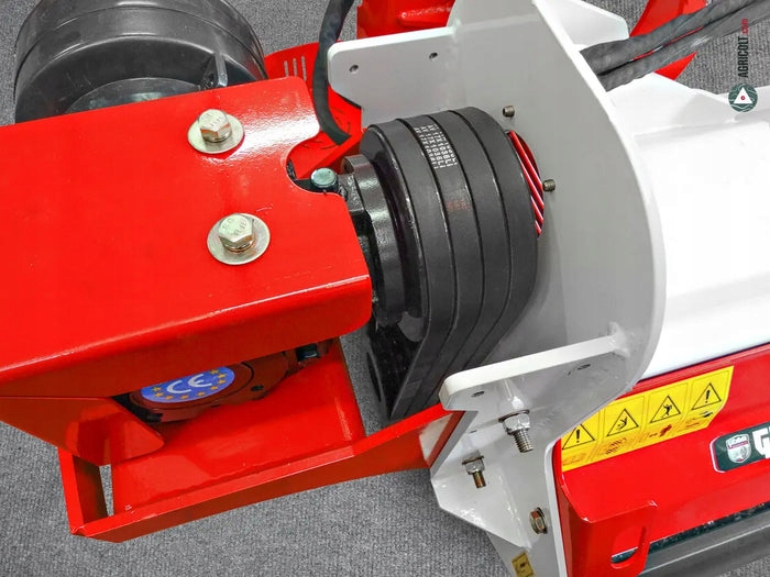 Цельные чугунные шкивы увеличивают скорость вала отбора мощности (ВОМ), доводя частоту вращения ротора до 2200 об/мин. Вся система привода, состоящая из двух шкивов и четырех зубчатых ремней, помещена в прочный защитный кожух из литой стали толщиной 2 мм. В козырьке имеются охлаждающие отверстия, которые пропускают воздух и не пропускают пыль и остатки травы.