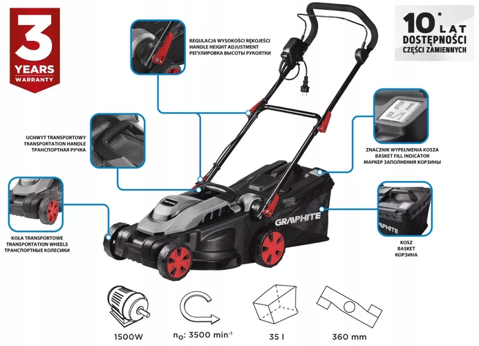 Электрическая газонокосилка ГРАФИТ с эффективным электродвигателем мощностью 1500 Вт позволяет косить траву шириной до 360 мм. Имеет 3-ступенчатую регулировку высоты среза 20/35/50 мм и травосборник емкостью 35 л. Оснащен эргономичная ручка с переключателем по всей длине, что значительно повышает комфорт работы. Кроме того, переключатель защищен от случайного включения. Держатель кабеля позволяет свободно эксплуатировать устройство. Специально профилированная крышка корзины обеспечивает оптимальный сбор скошенной травы, а большие задние колеса облегчают маневрирование. Возможность удобной транспортировки с помощью ручки, расположенной на корпусе косилки. Соответствие европейским стандартам безопасности гарантируется сертификатом CE.