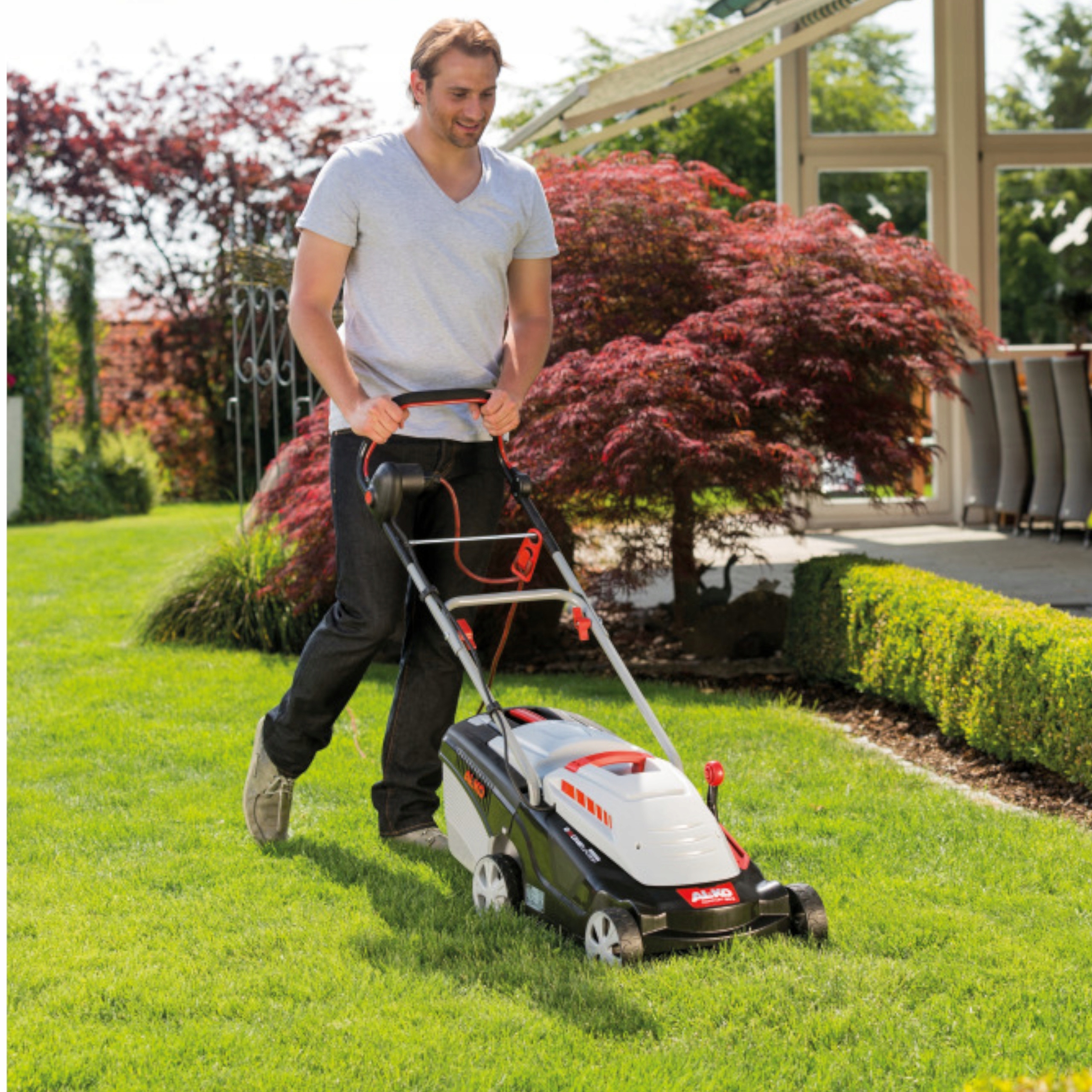 Большим преимуществом устройства является способ его запуска – просто удерживайте рычаг газа и нажмите кнопку «СТАРТ» и ваша газонокосилка начнет работать в саду с изюминкой! Косилка с электродвигателемидеально подходит для стрижки наклонных участков.