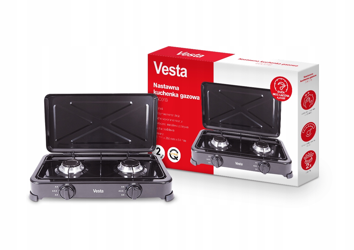 - Регулируемая газовая плита Vesta имеет 2 конфорки общей мощностью 4,4 кВт, что позволяет быстро и легко готовить блюда;